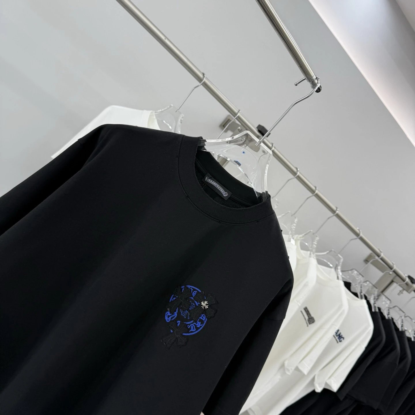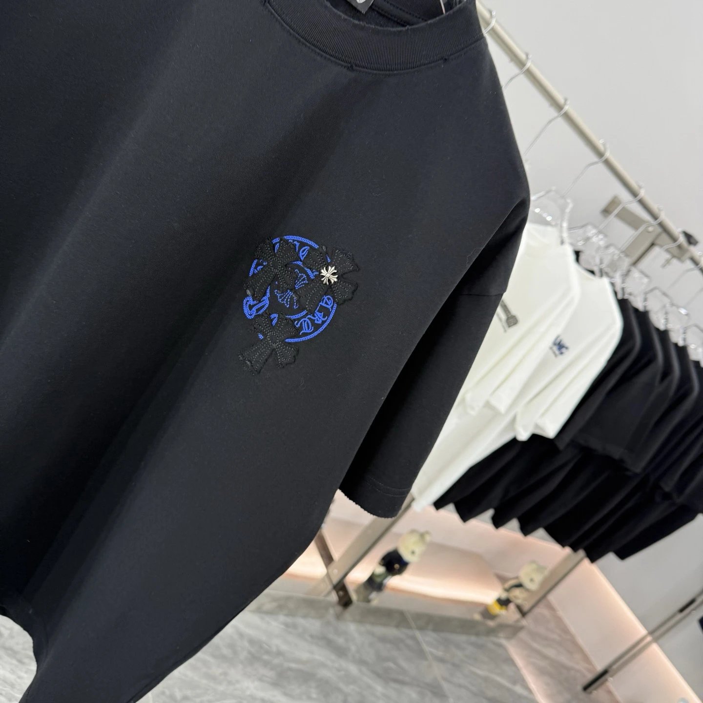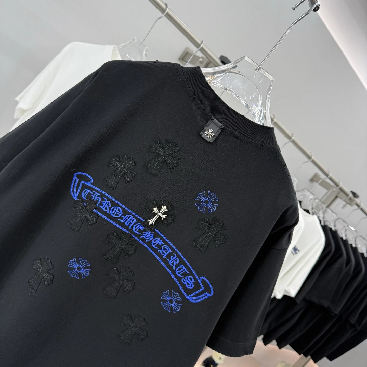 Chrome Hearts 2026 Spring Summer heavy cotton T-shirt (260g, 26s combed cotton). Breathable, soft, anti-wrinkle & durable. Features cross applique, scroll embroidery, metal cross, horseshoe print & dual logos.