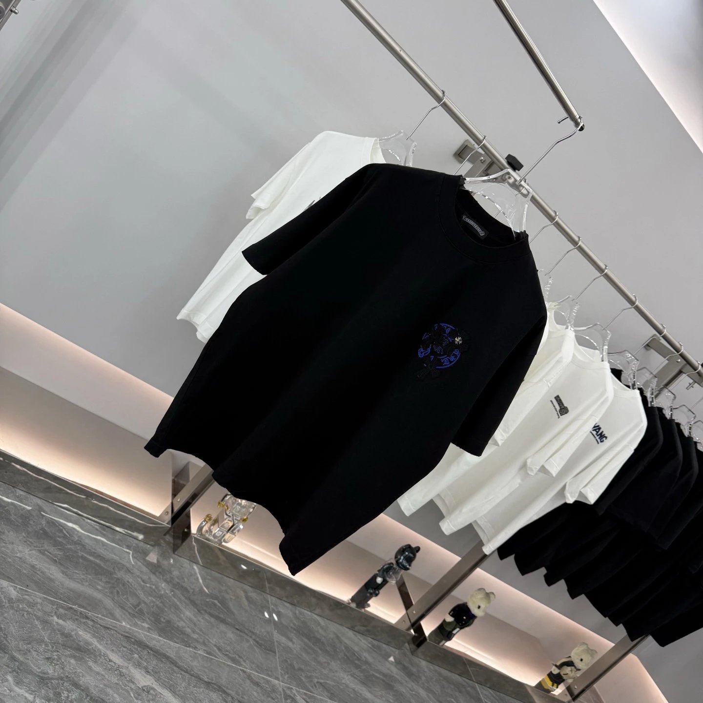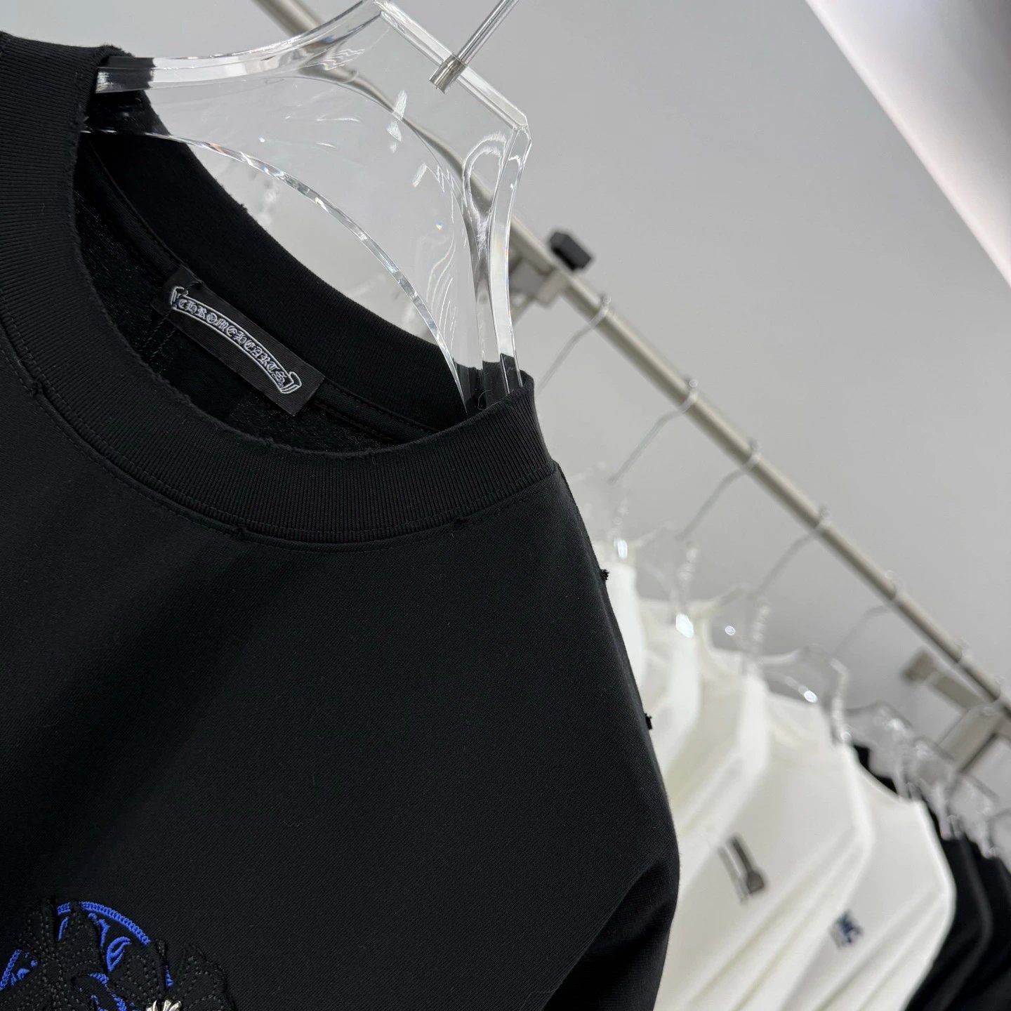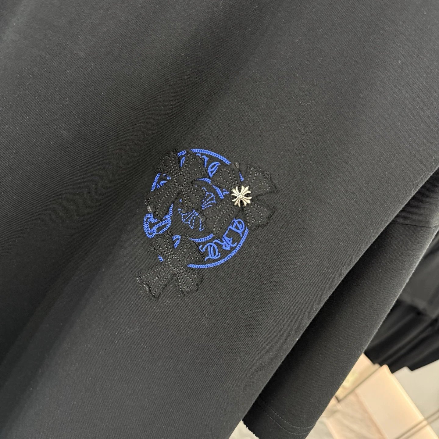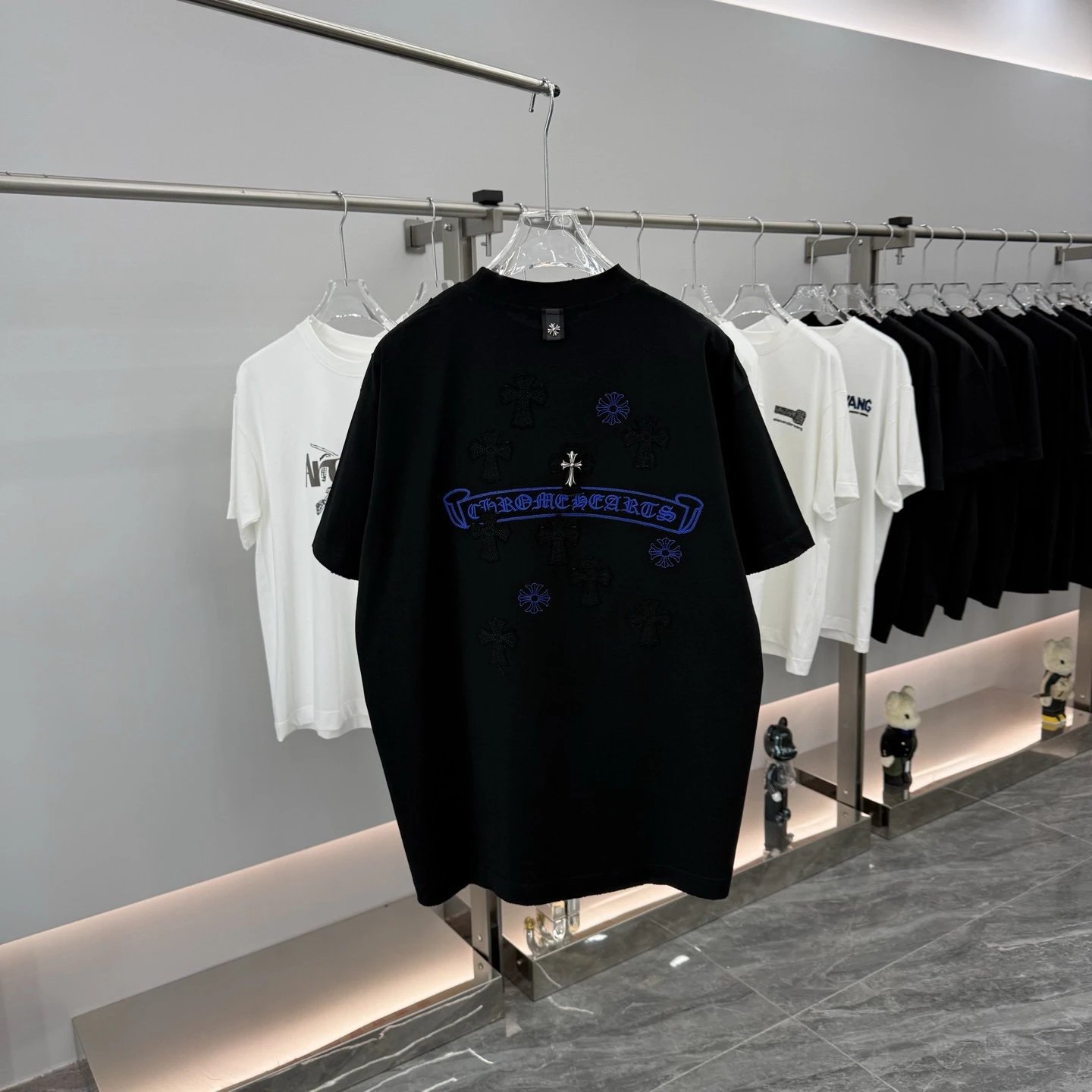 Chrome Hearts 2026 Spring Summer heavy cotton T-shirt (260g, 26s combed cotton). Breathable, soft, anti-wrinkle & durable. Features cross applique, scroll embroidery, metal cross, horseshoe print & dual logos.