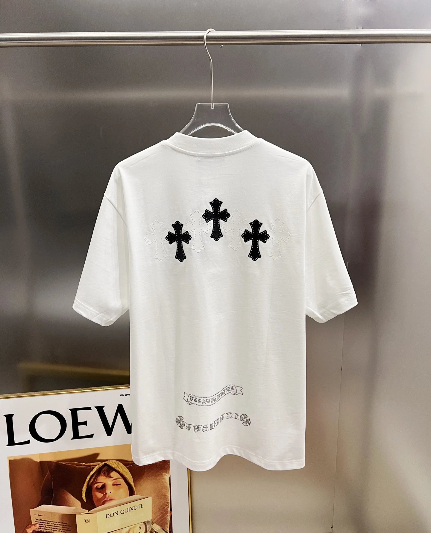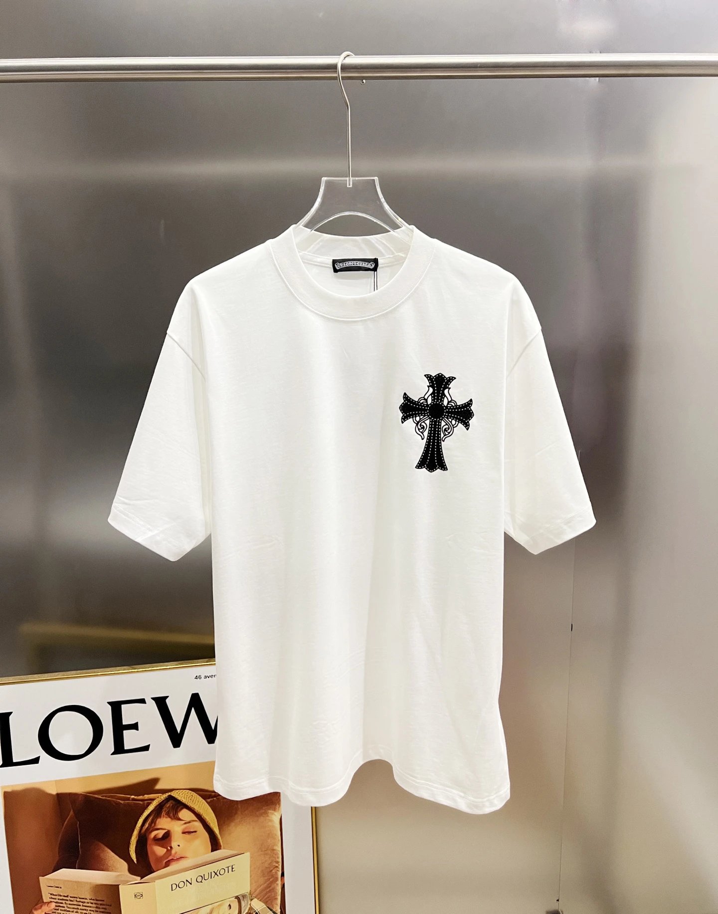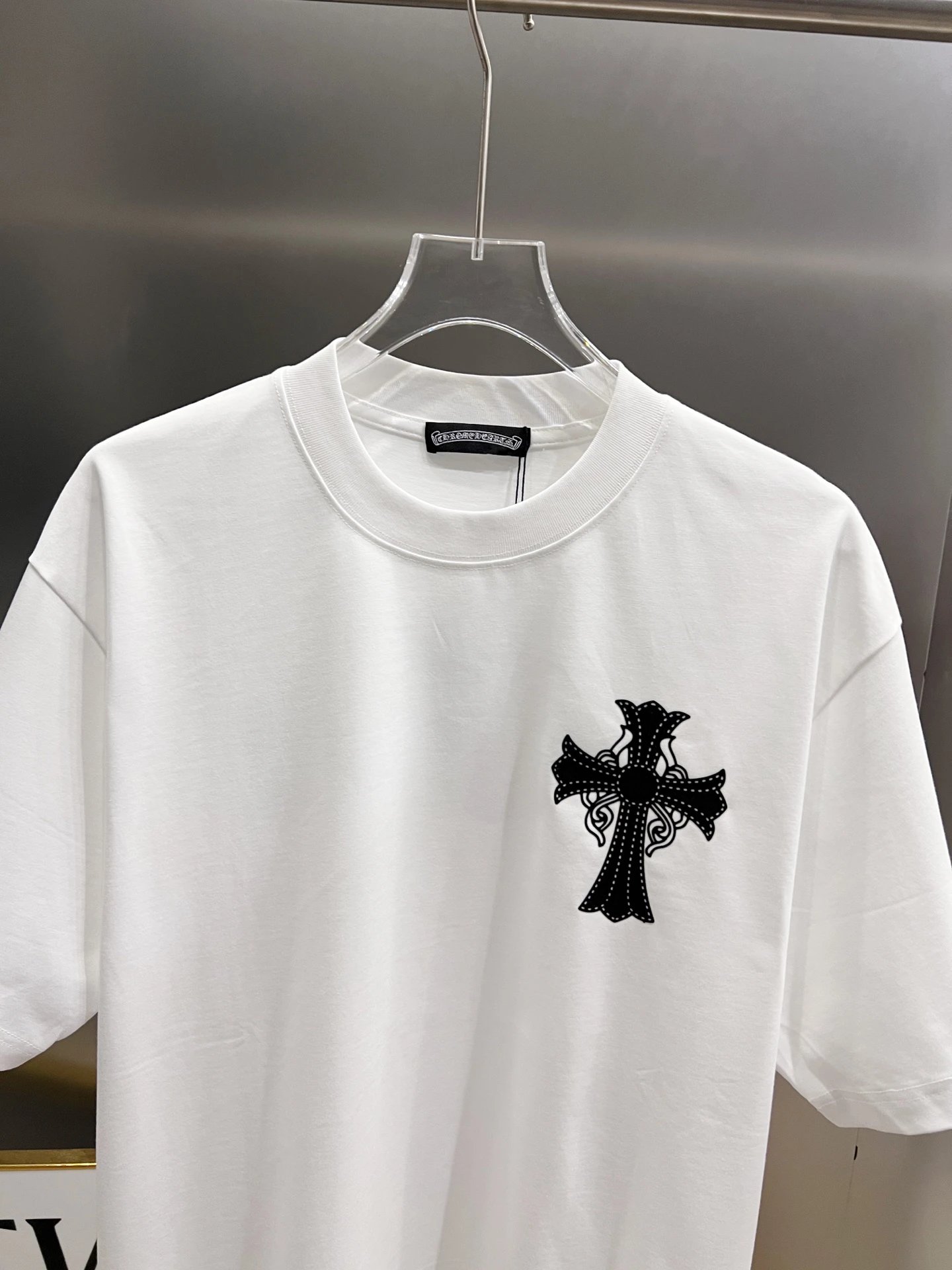 Chrome Hearts 2026 Spring-Summer New Unisex Loose T-Shirt has cross patch & Middle East rhinestones. Sizes: S/M/L/XL/XXL; Colors: Black, White, Angola Red, Rose Red.