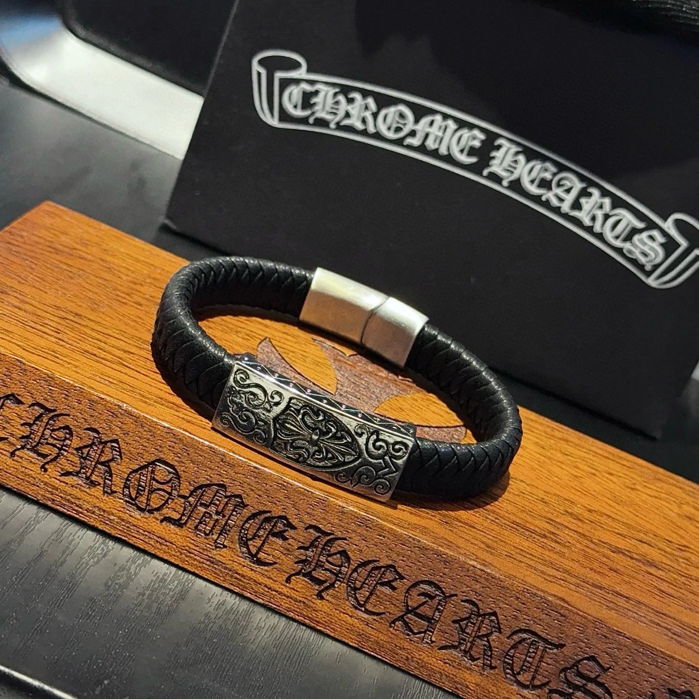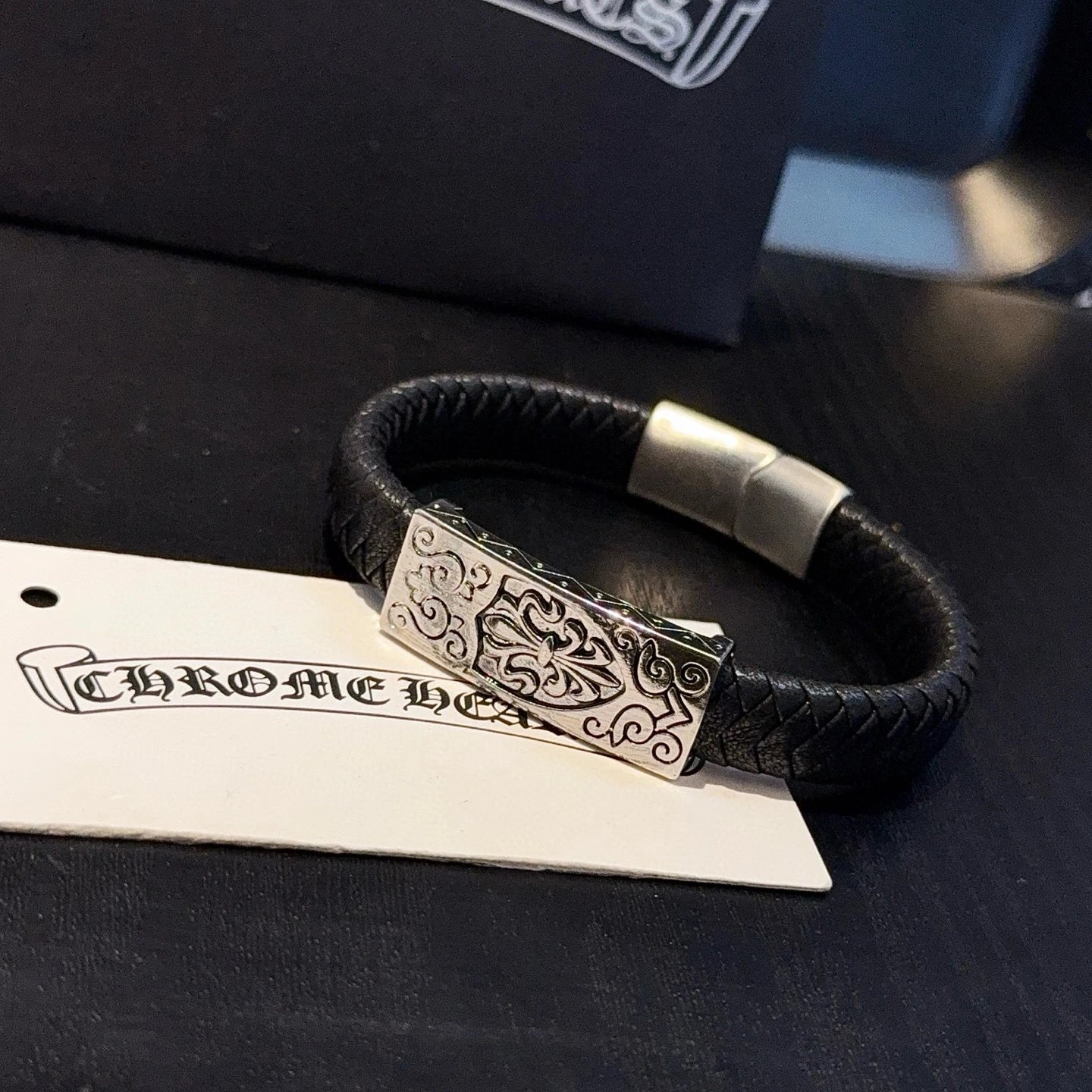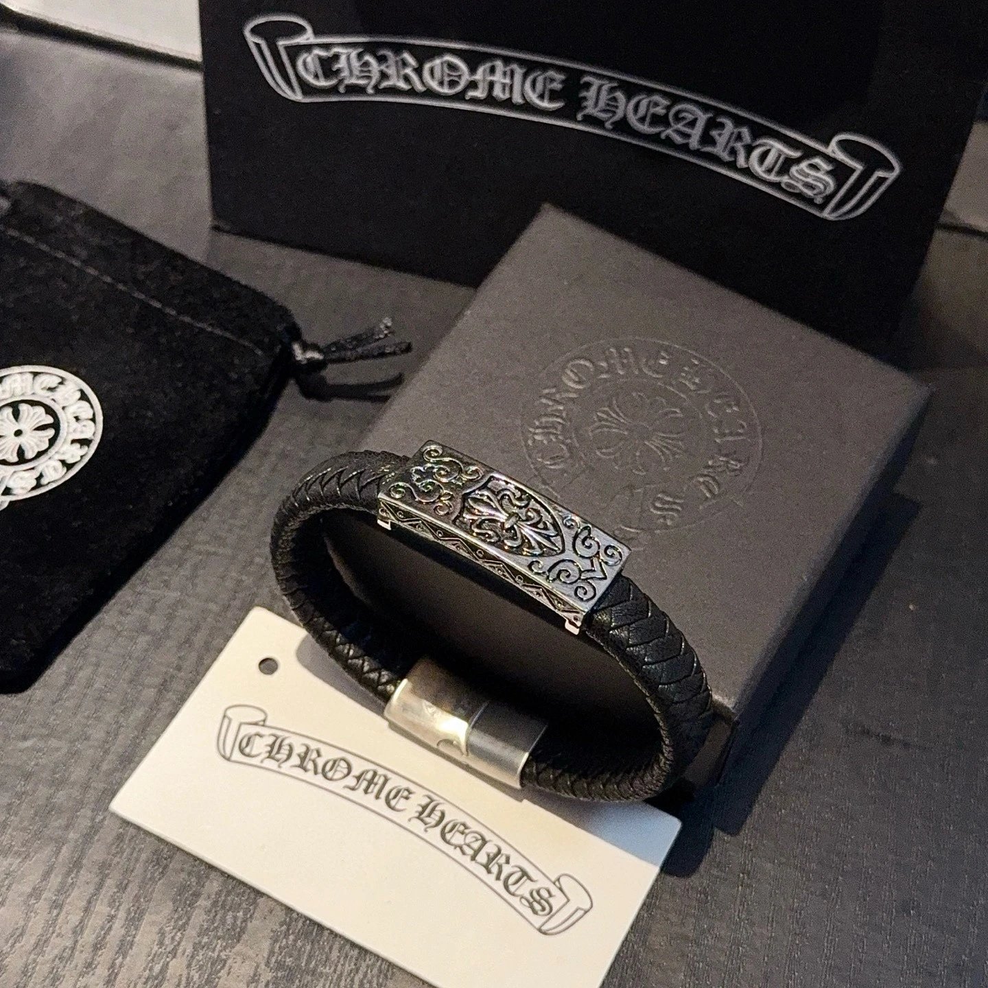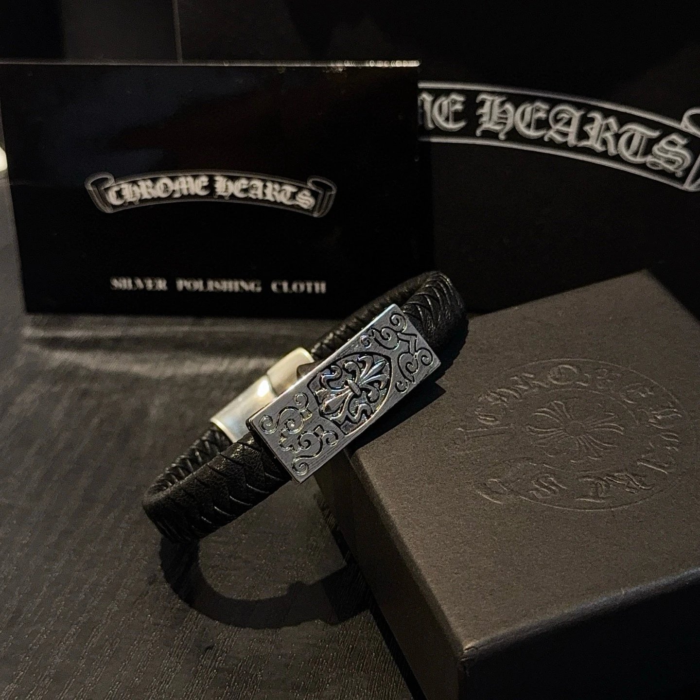 Chrome Hearts Come Hearts Leather Bracelet has unique embossed patterns with cross & floral motifs.