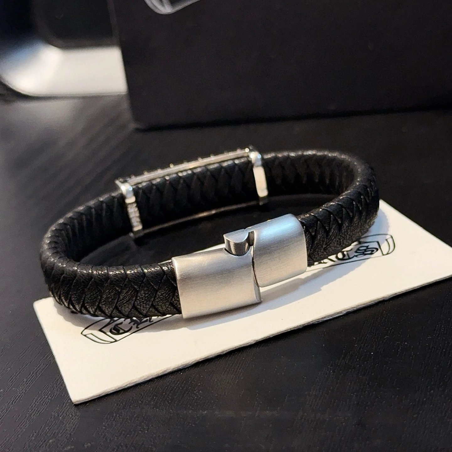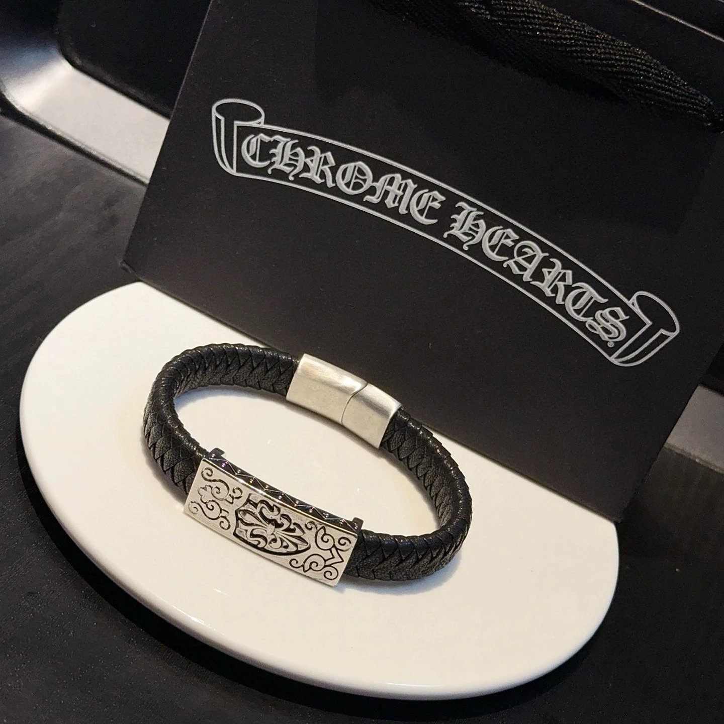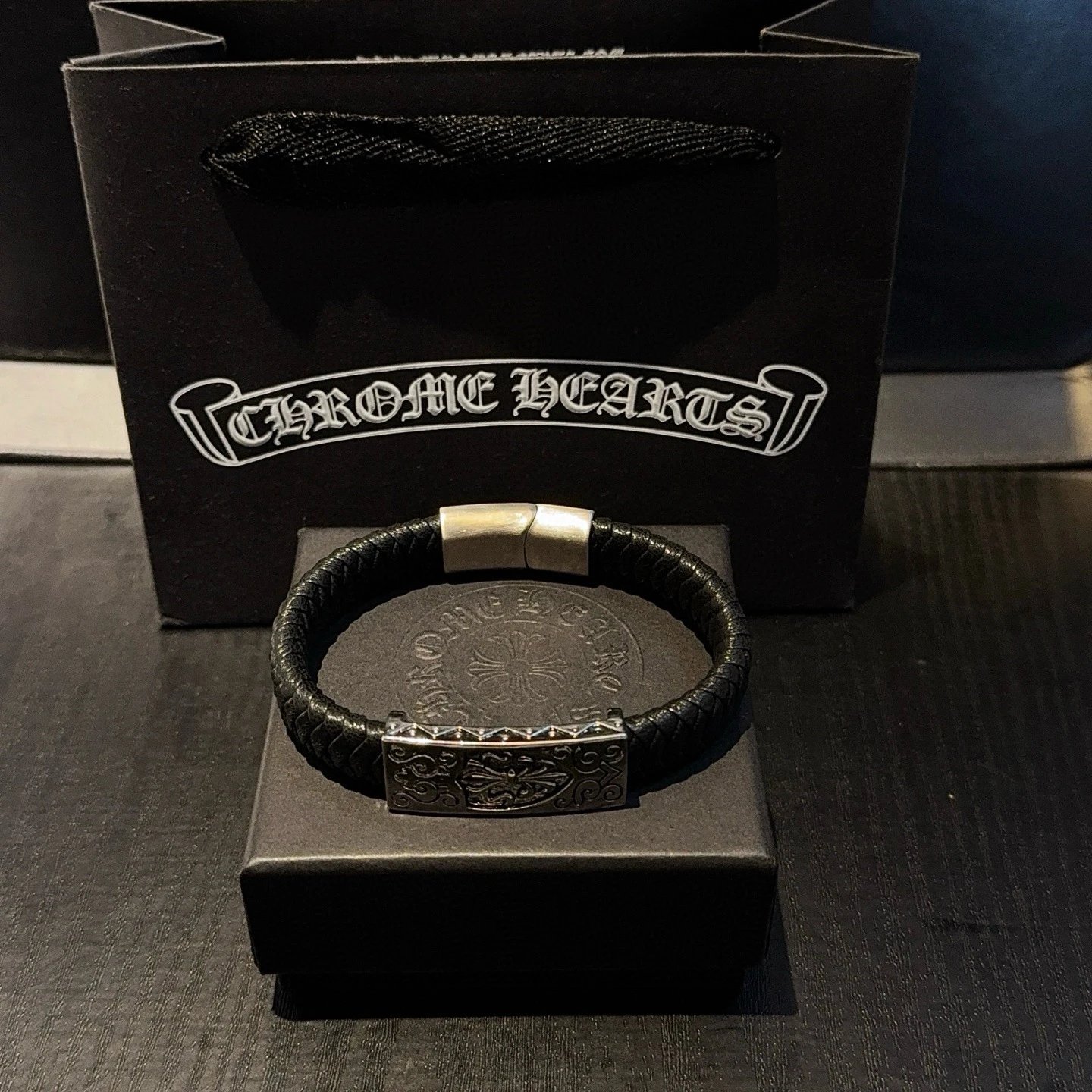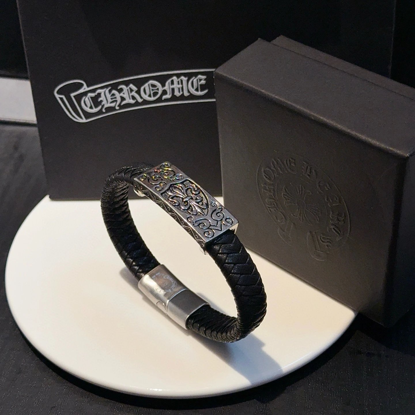 Chrome Hearts Come Hearts Leather Bracelet has unique embossed patterns with cross & floral motifs.