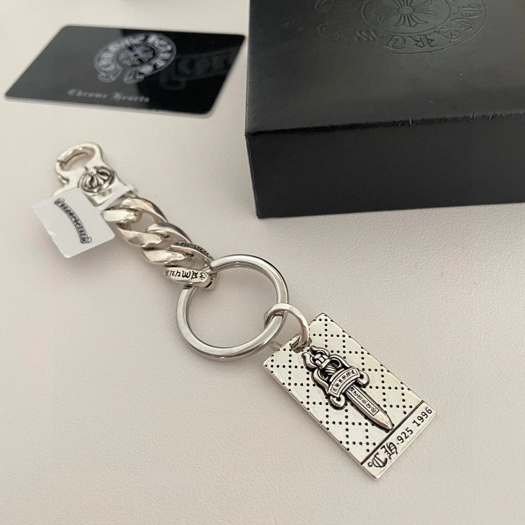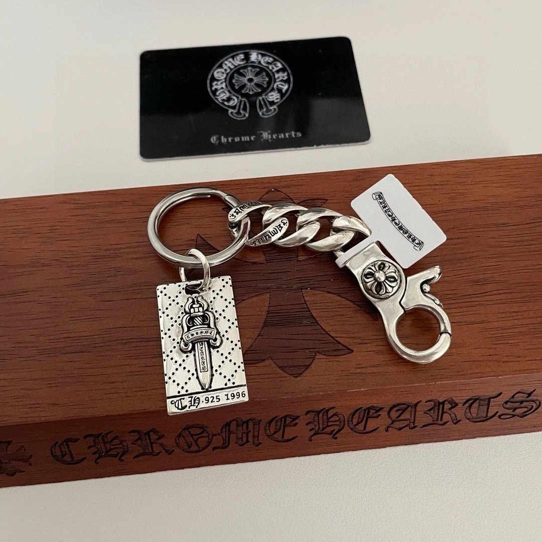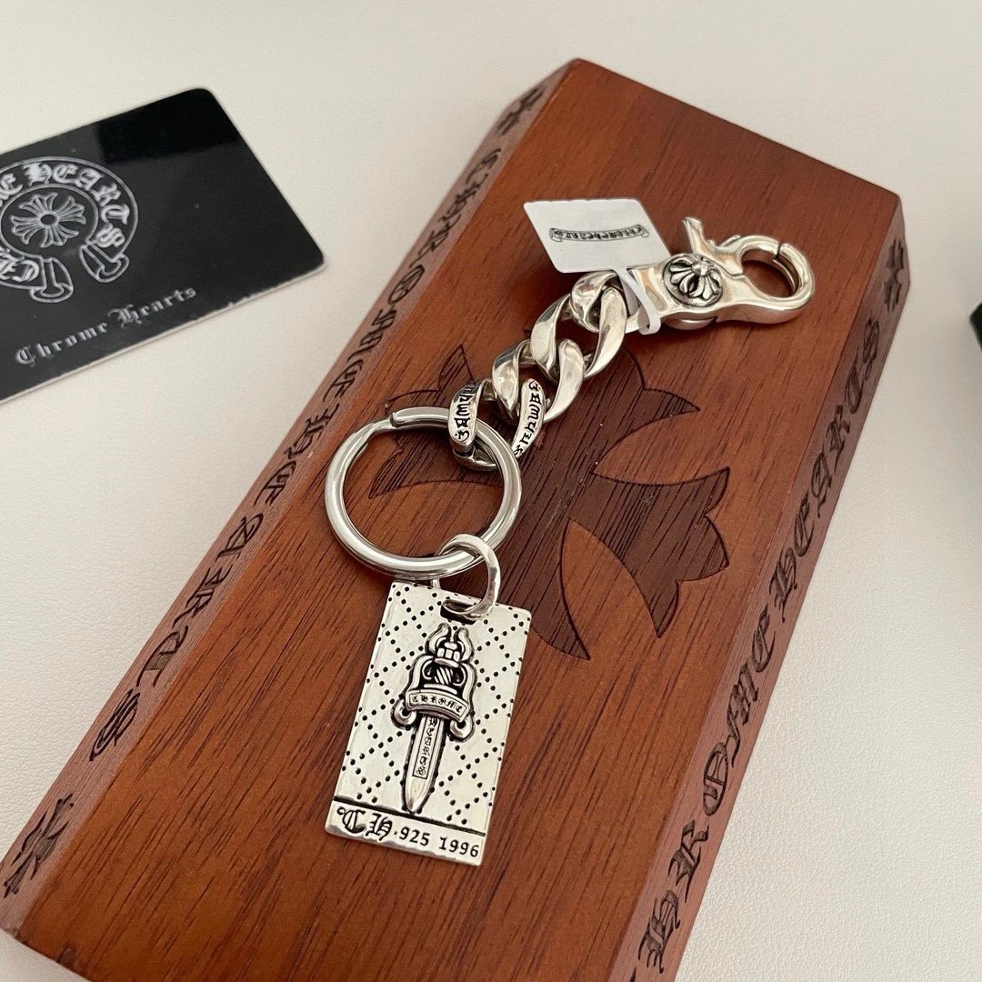 Chrome Hearts Classic Retro Sword Pendant Keychain has unique concave-convex pattern with cross & scout flower elements.