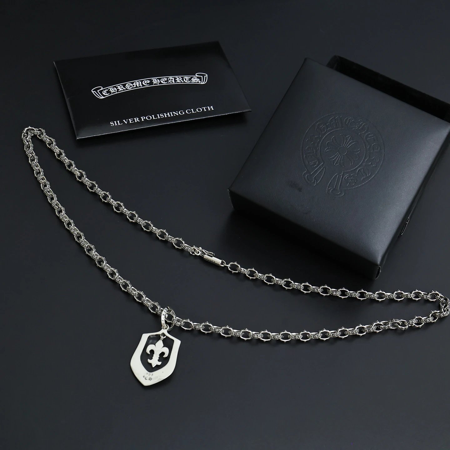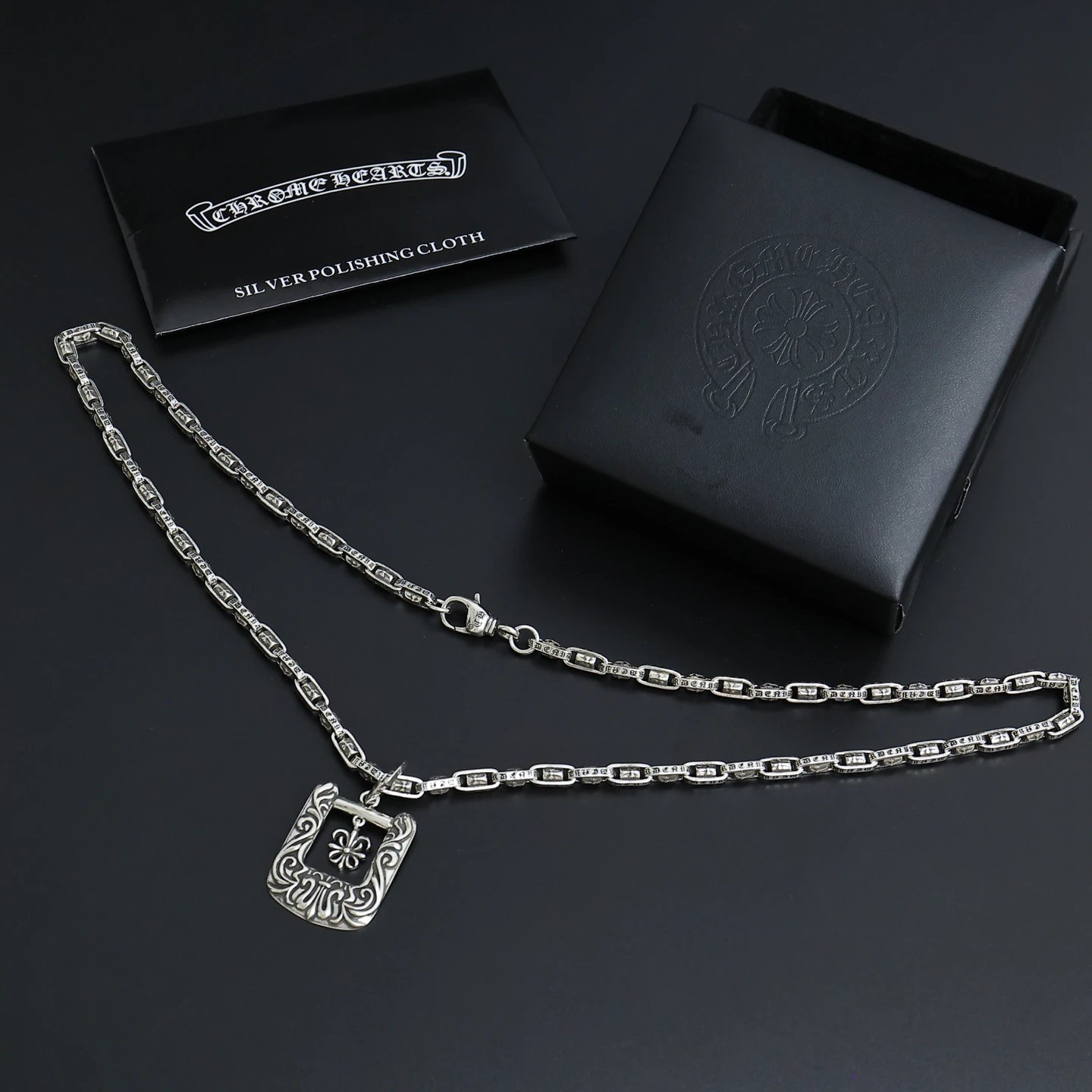 Directly from factory, this necklace features authentic Chrome Hearts style.