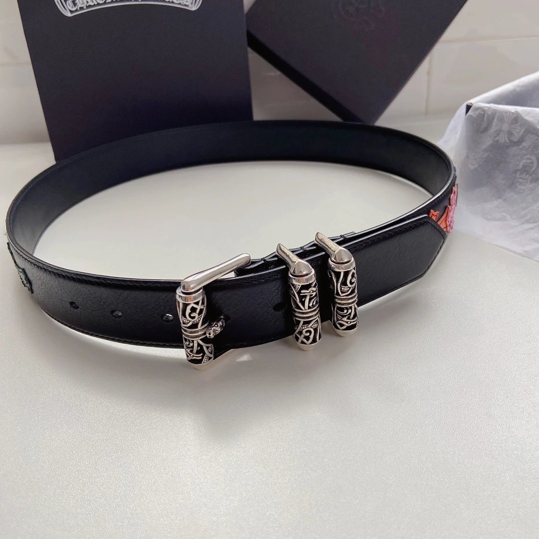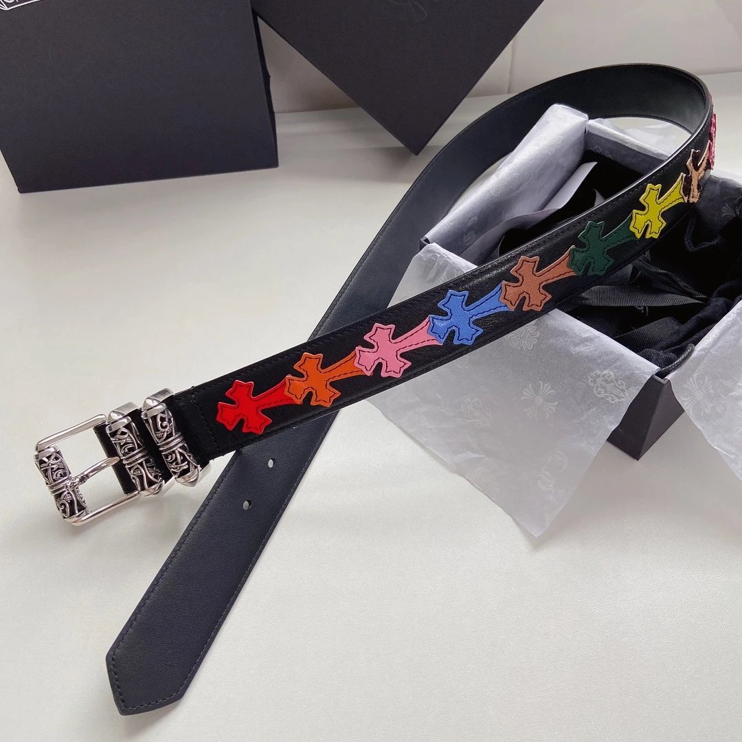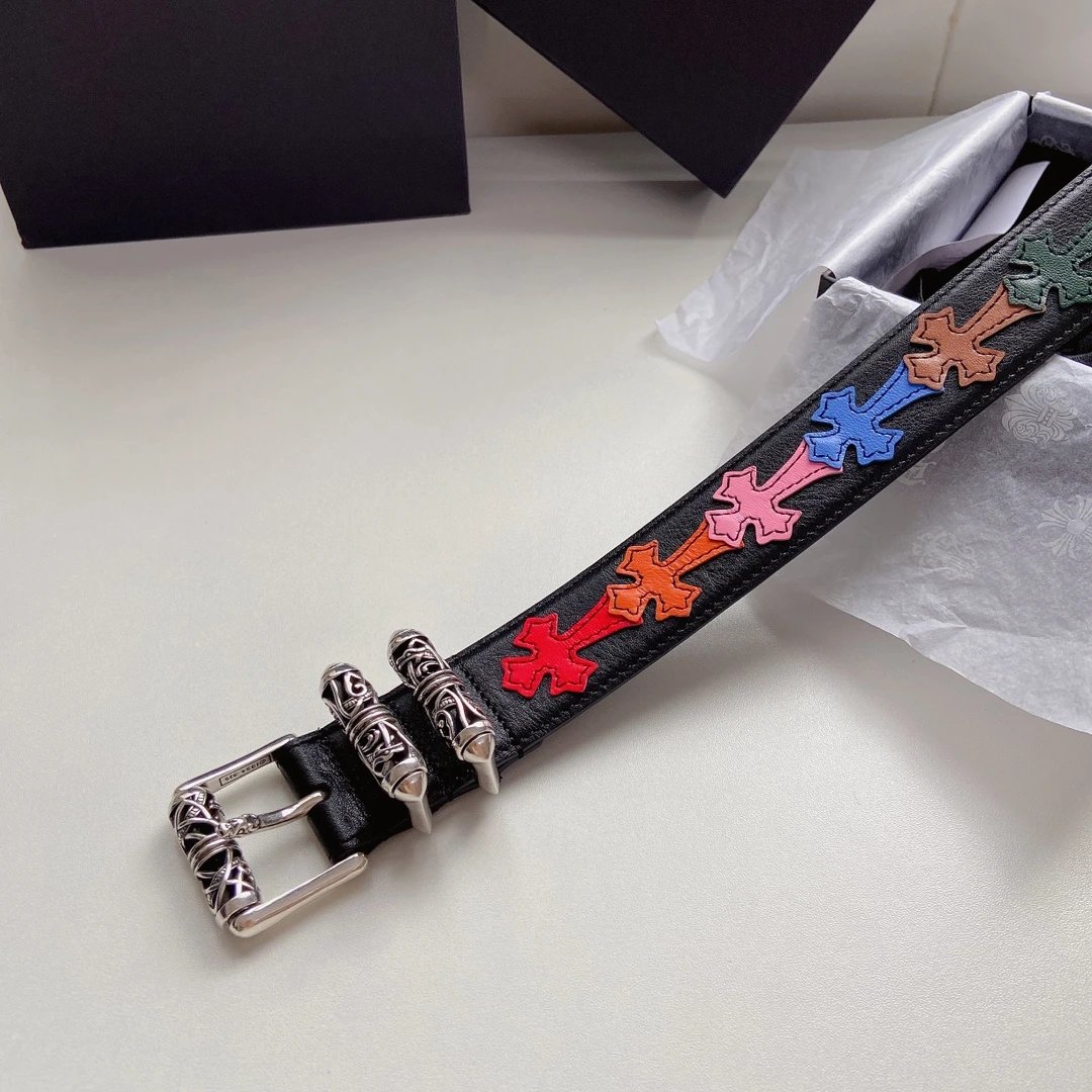 Chrome Hearts Celtic Dragon Series Belt with S925 silver plated brass hardware, colorful cross cowhide, 3.8cm width, vintage trendy design.