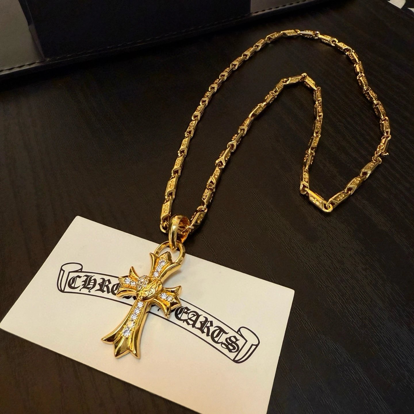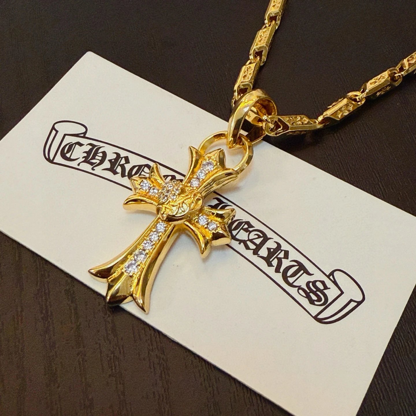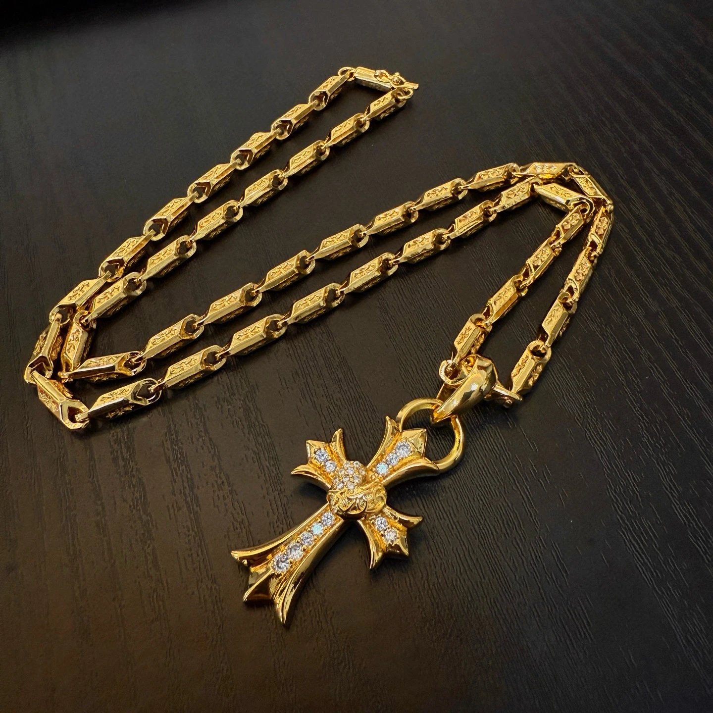 Chrome Hearts Gold-Tone Vintage Necklace has a pave vine heart cross pendant with embossed patterns.
