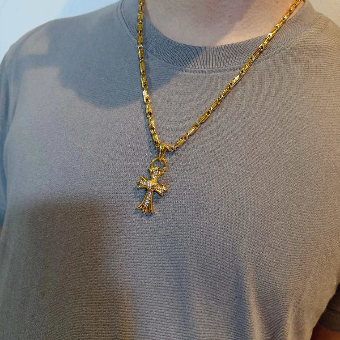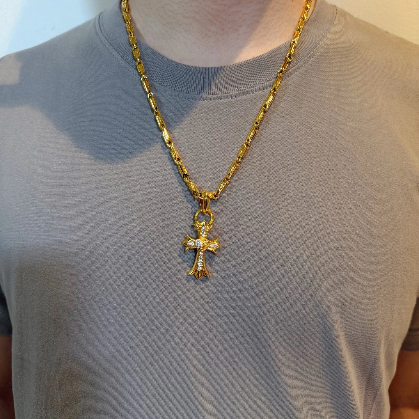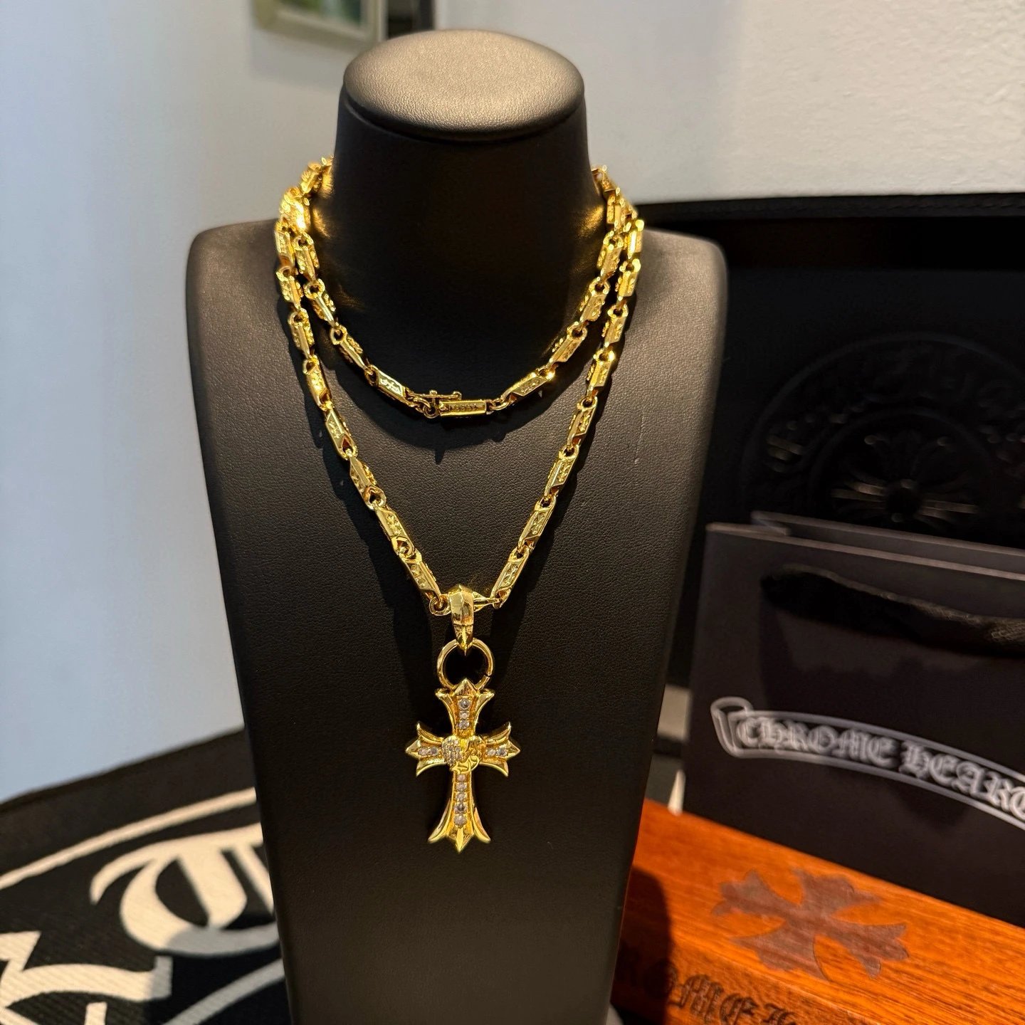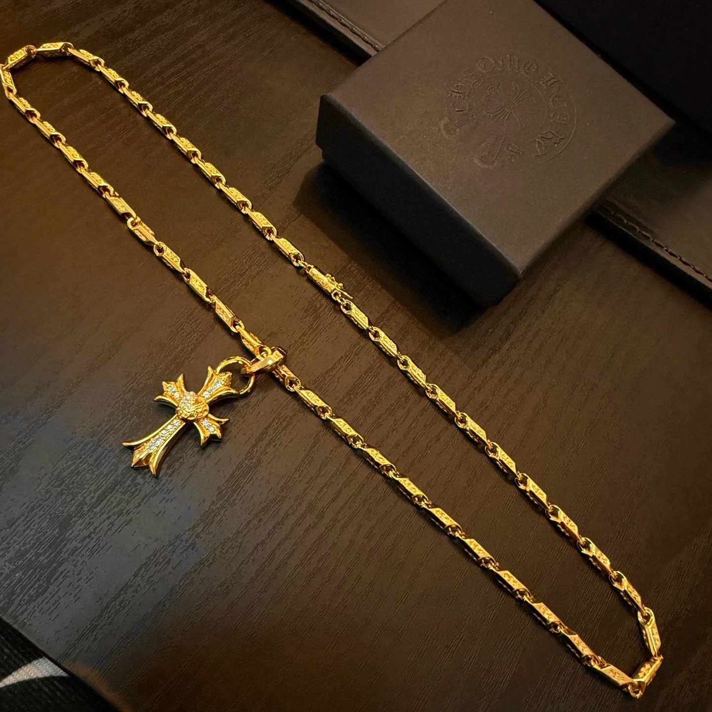 Chrome Hearts Gold-Tone Vintage Necklace has a pave vine heart cross pendant with embossed patterns.