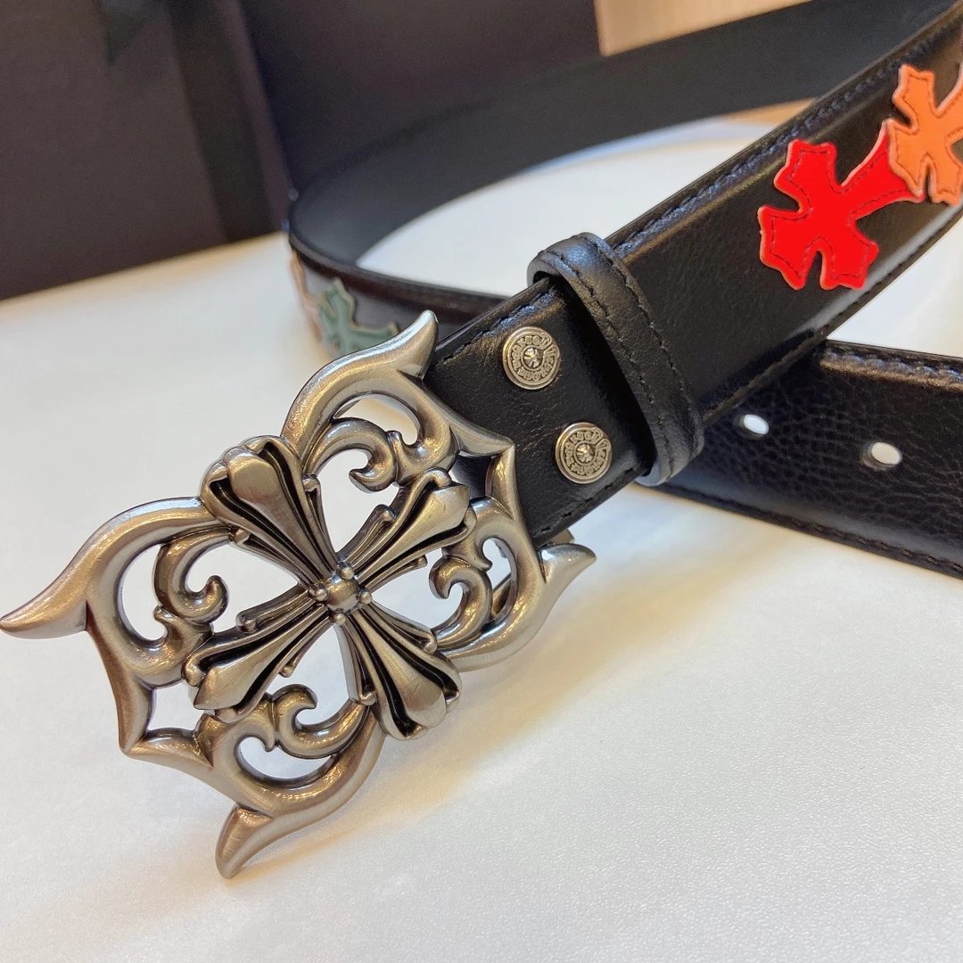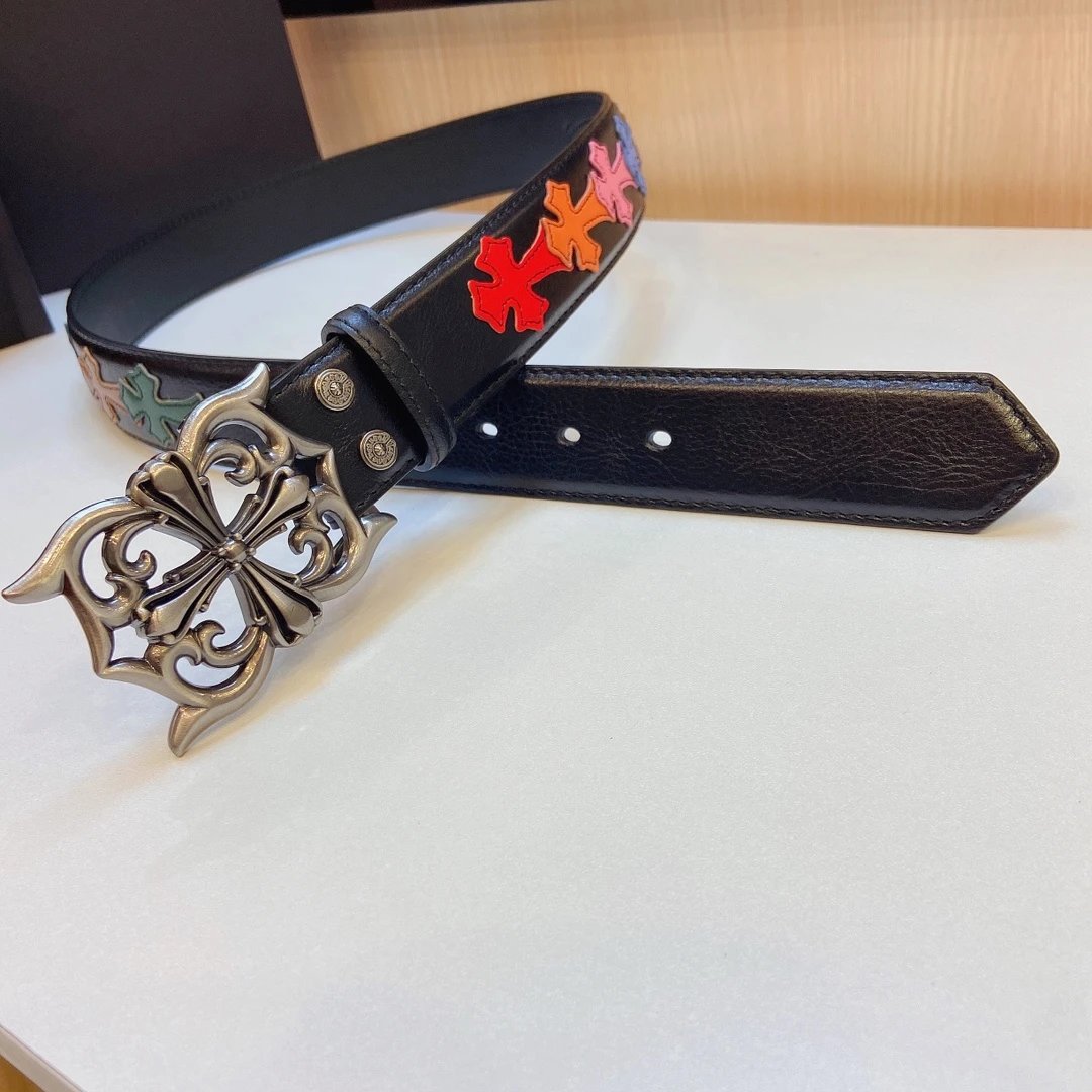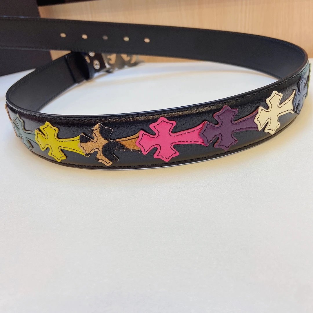 Chrome Hearts presents this stylish detachable belt, featuring a premium brass buckle paired with tree bark leather and colorful cross stitching.