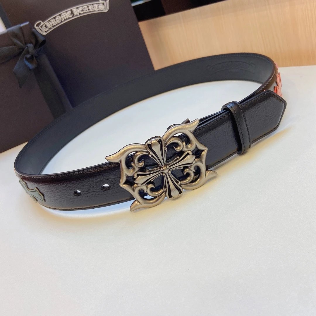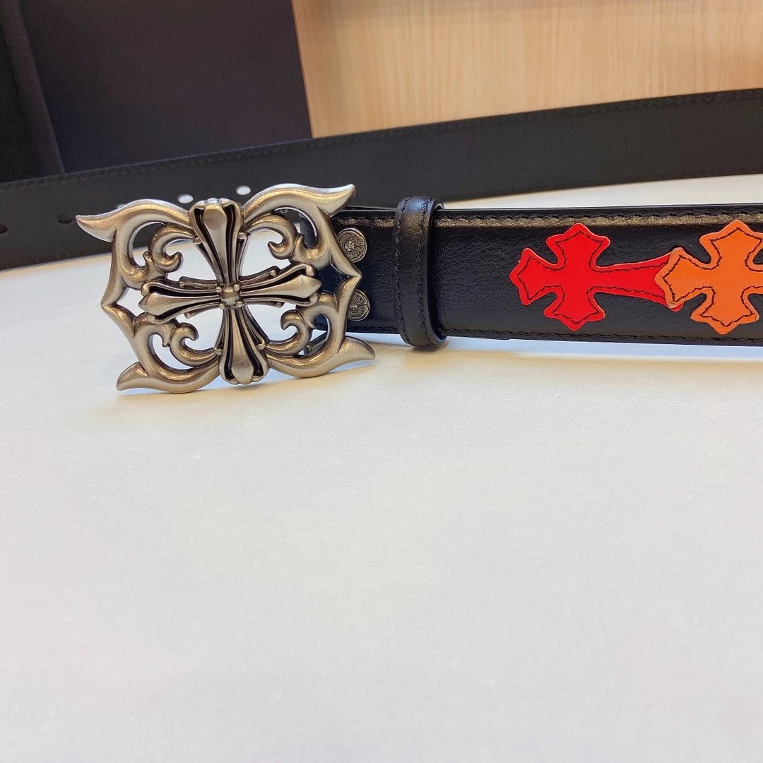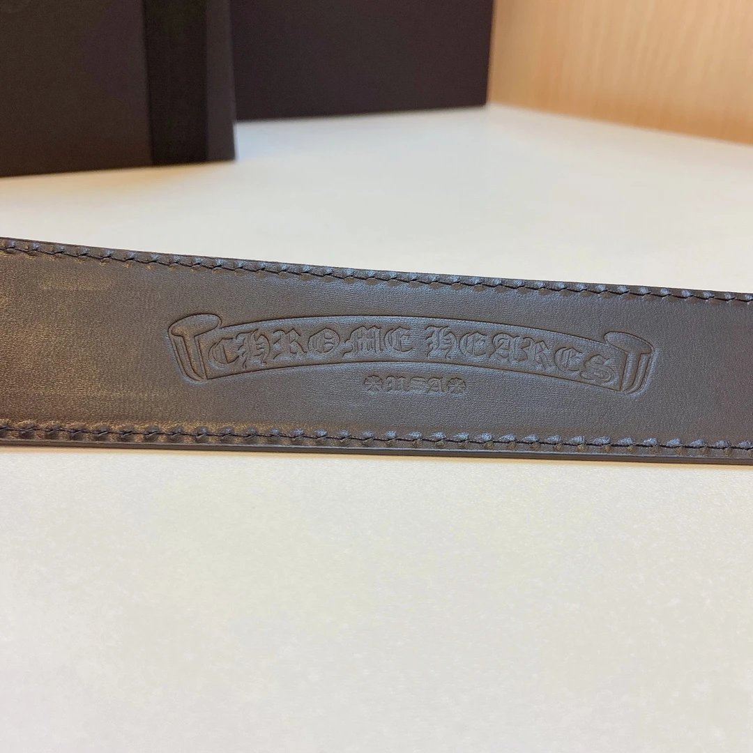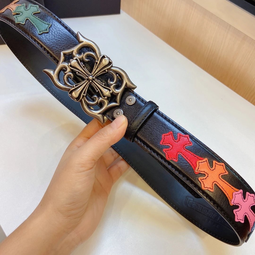Chrome Hearts presents this stylish detachable belt, featuring a premium brass buckle paired with tree bark leather and colorful cross stitching.