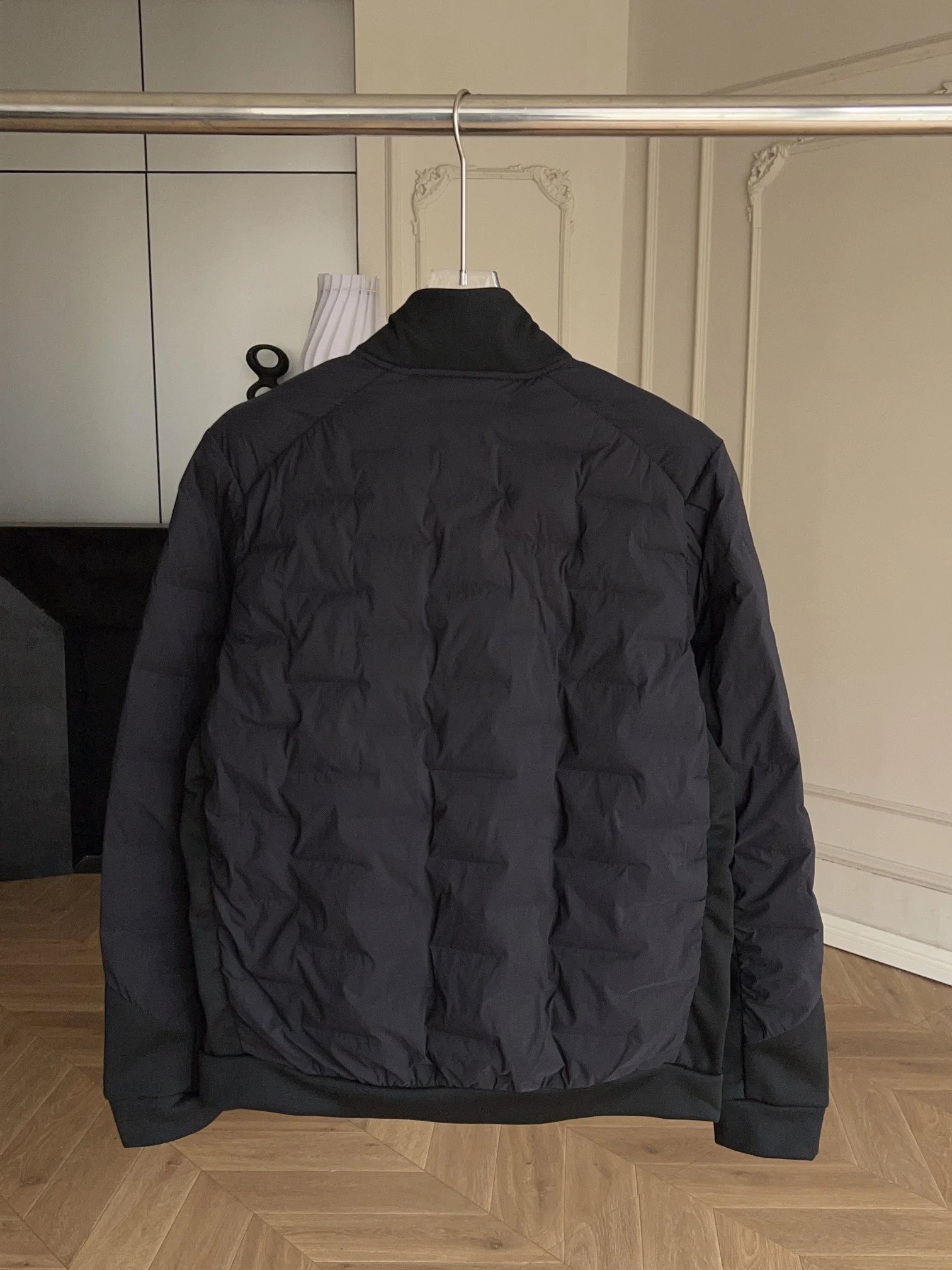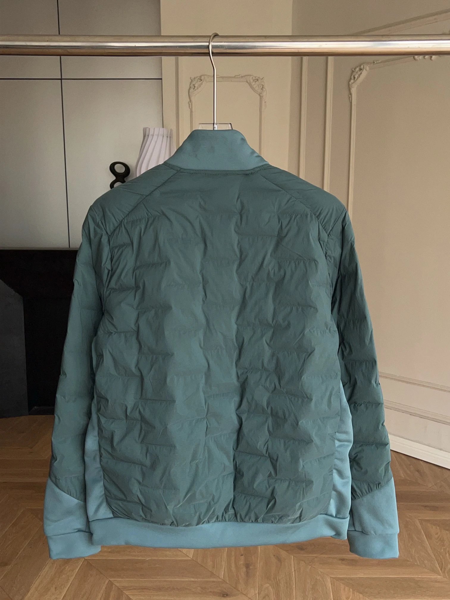 It has gray goose down filling, YKK zipper, hidden pockets, and stretchy panels.