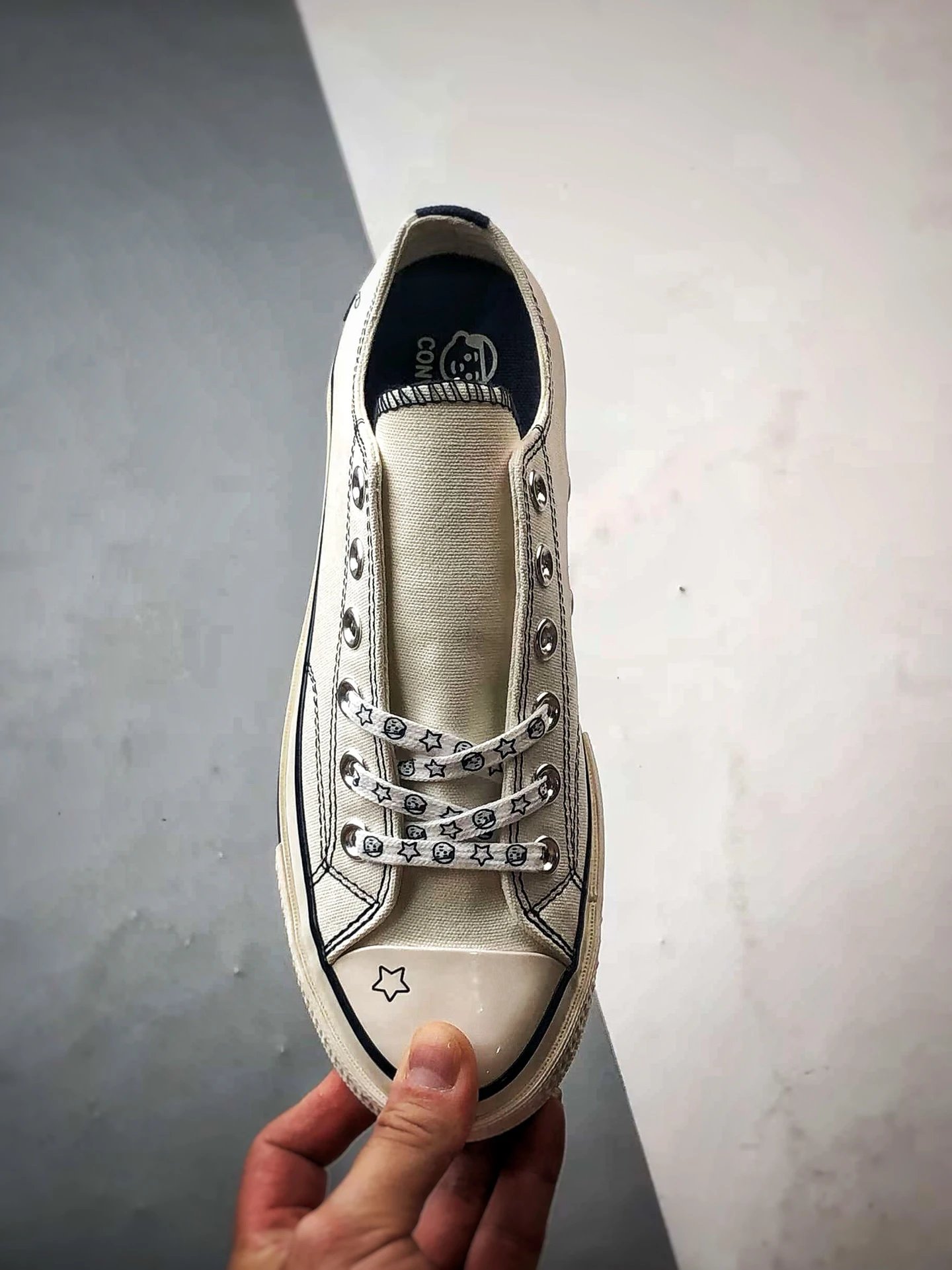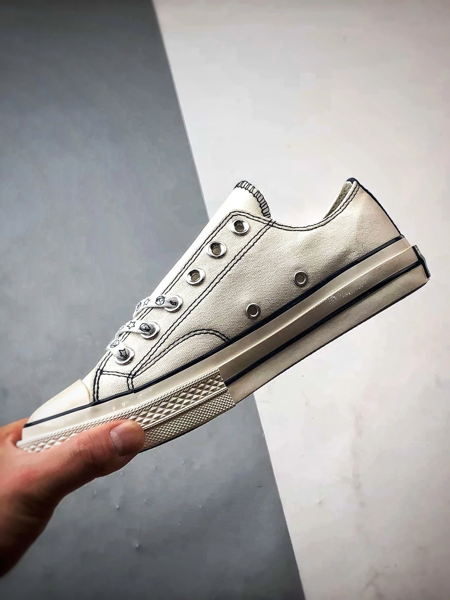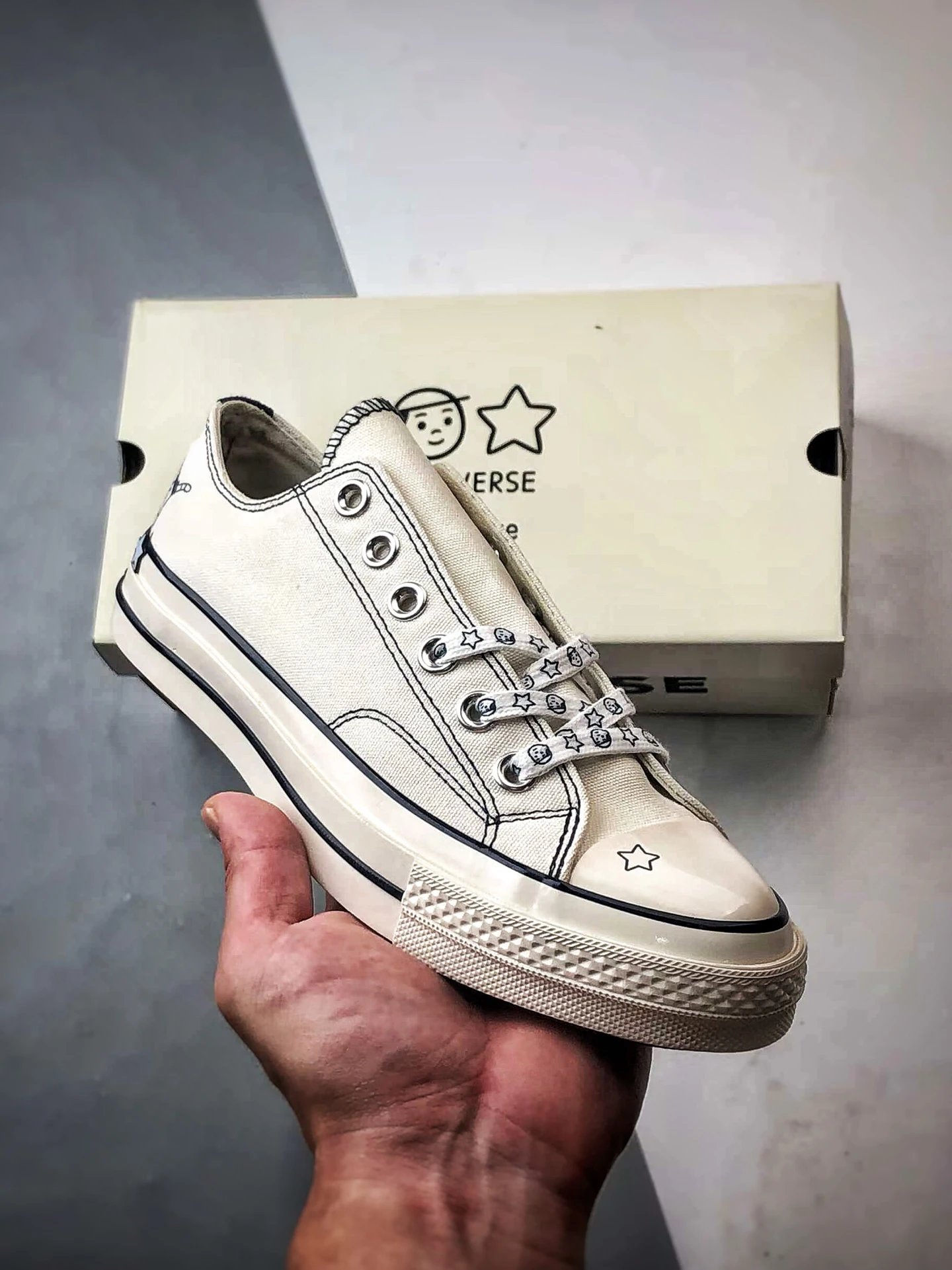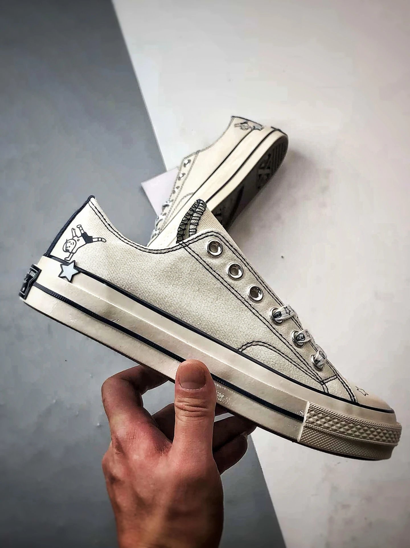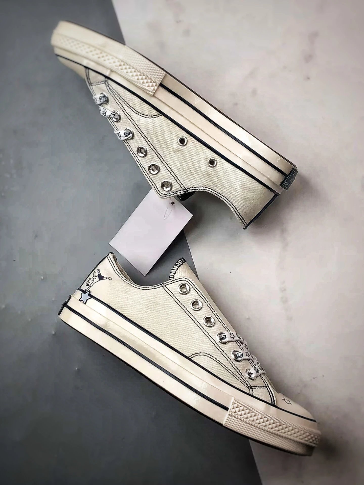 Classic 1970s silhouette, off-white upper with cartoon figure & star patterns, double laces for versatile styling.