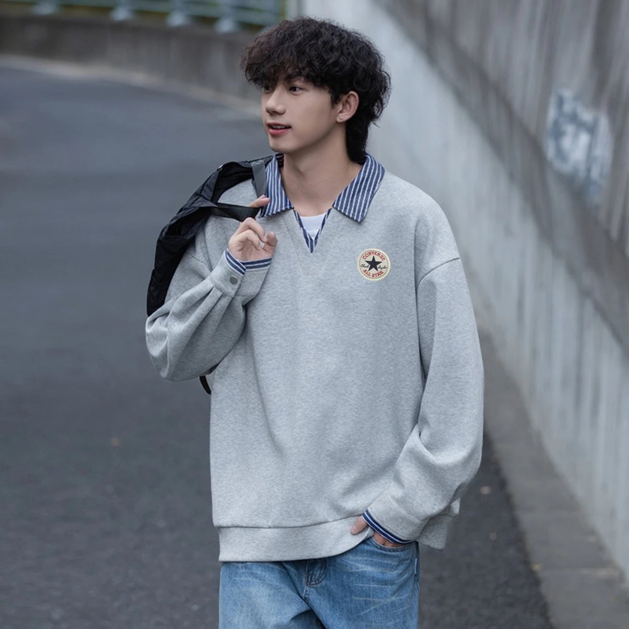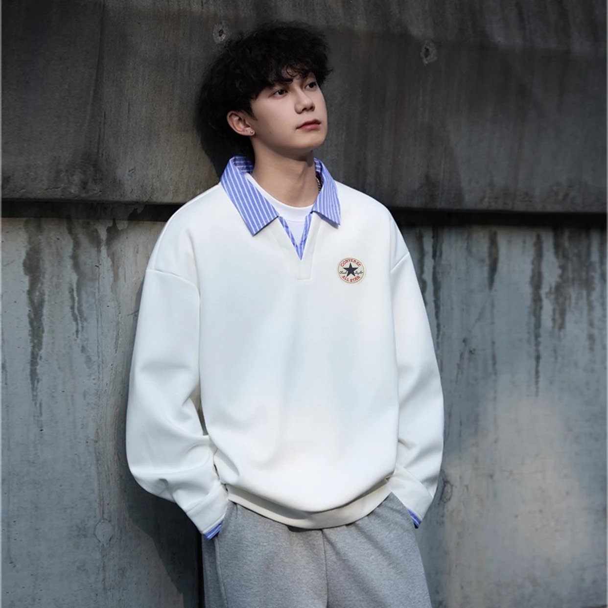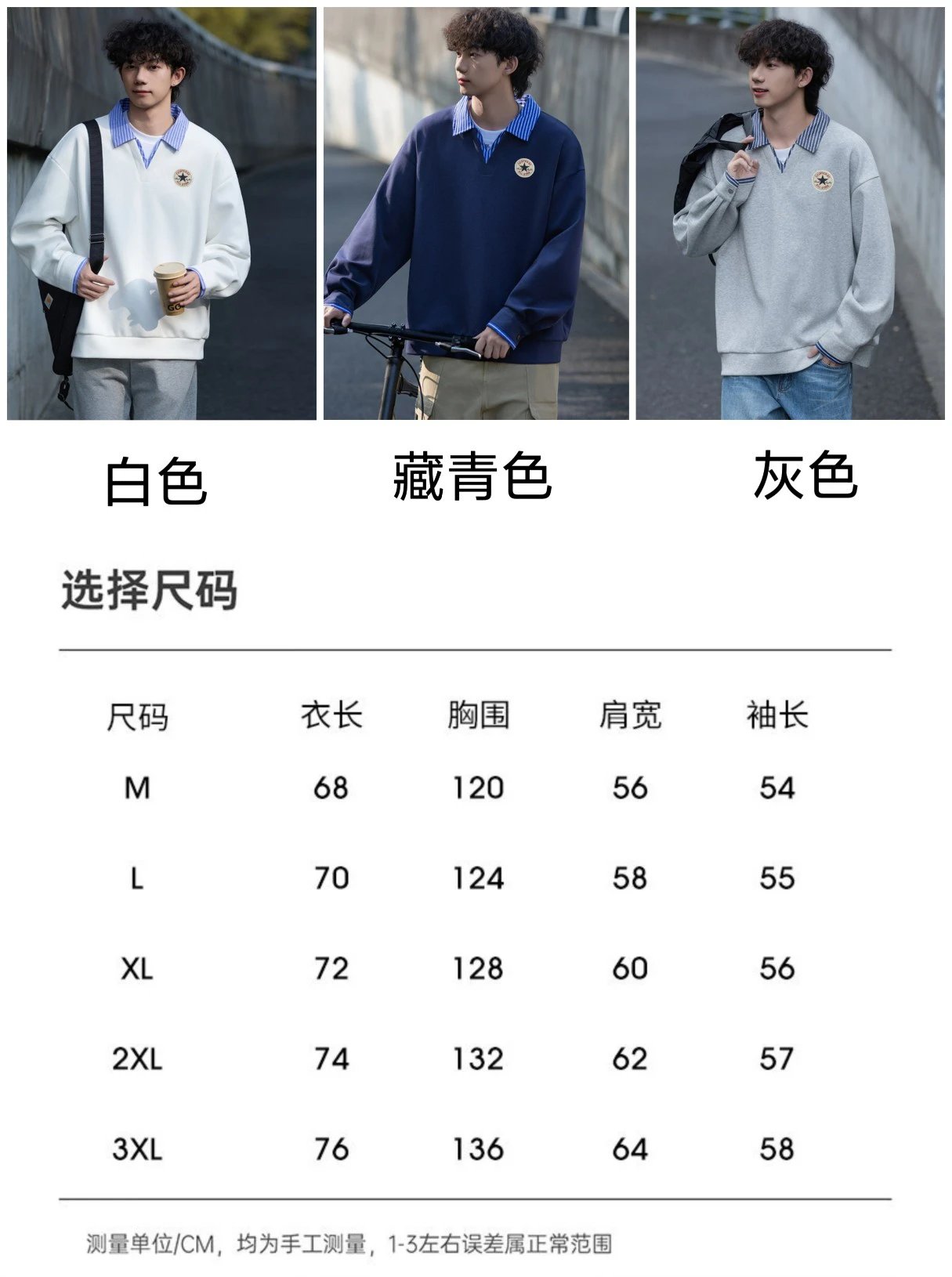 Youthful campus style, unisex, great for couples. Colors: white, gray, navy blue.