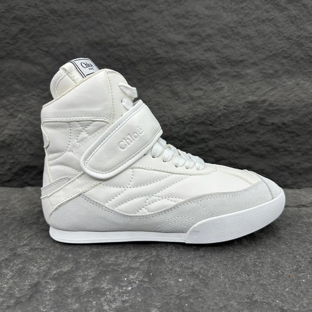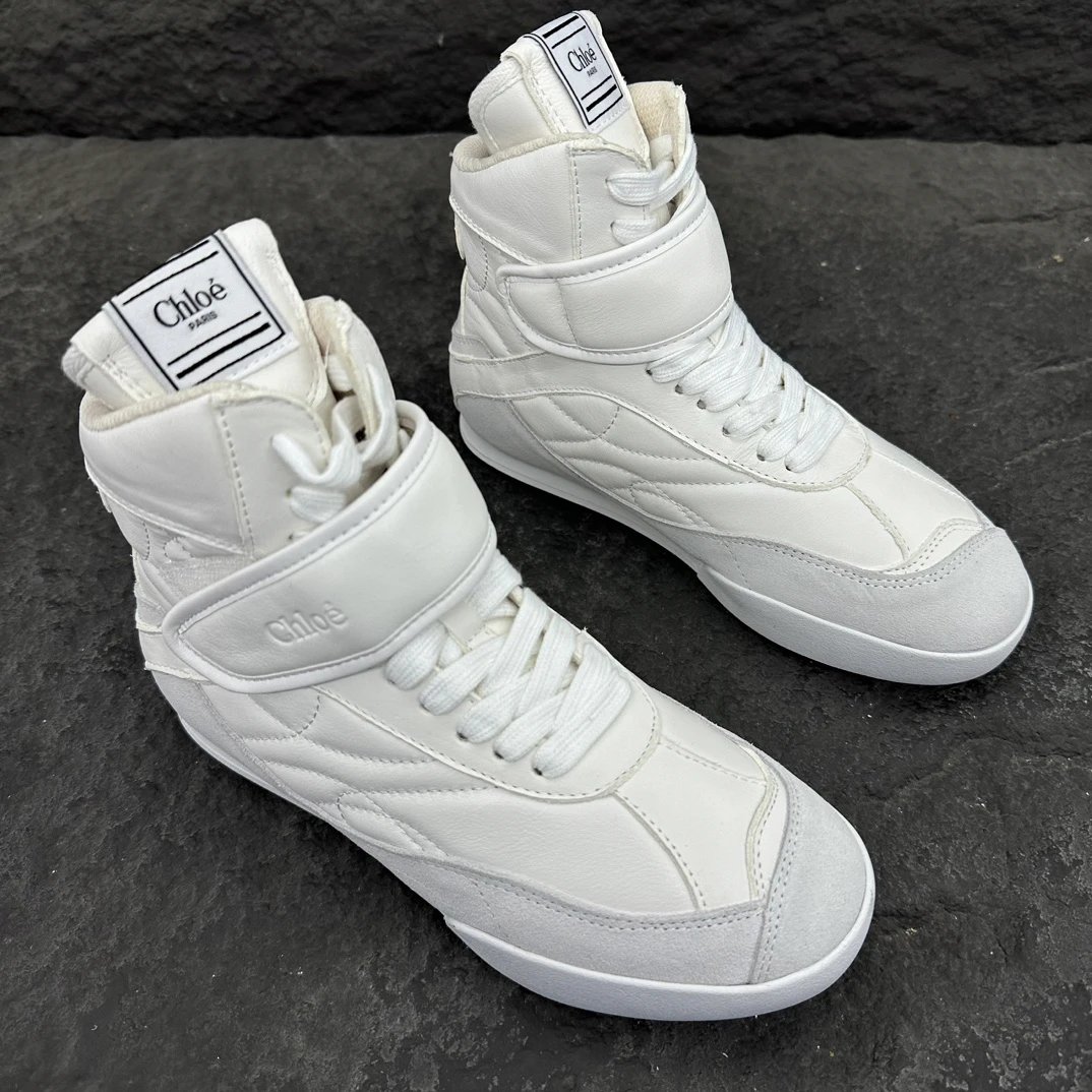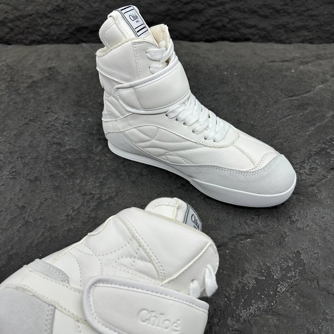 Chloé KI Women's High-Top Sneakers are crafted from mesh and smooth suede calfskin. Slim flat-toe design, wide leather laces with embossed Chloé logo.