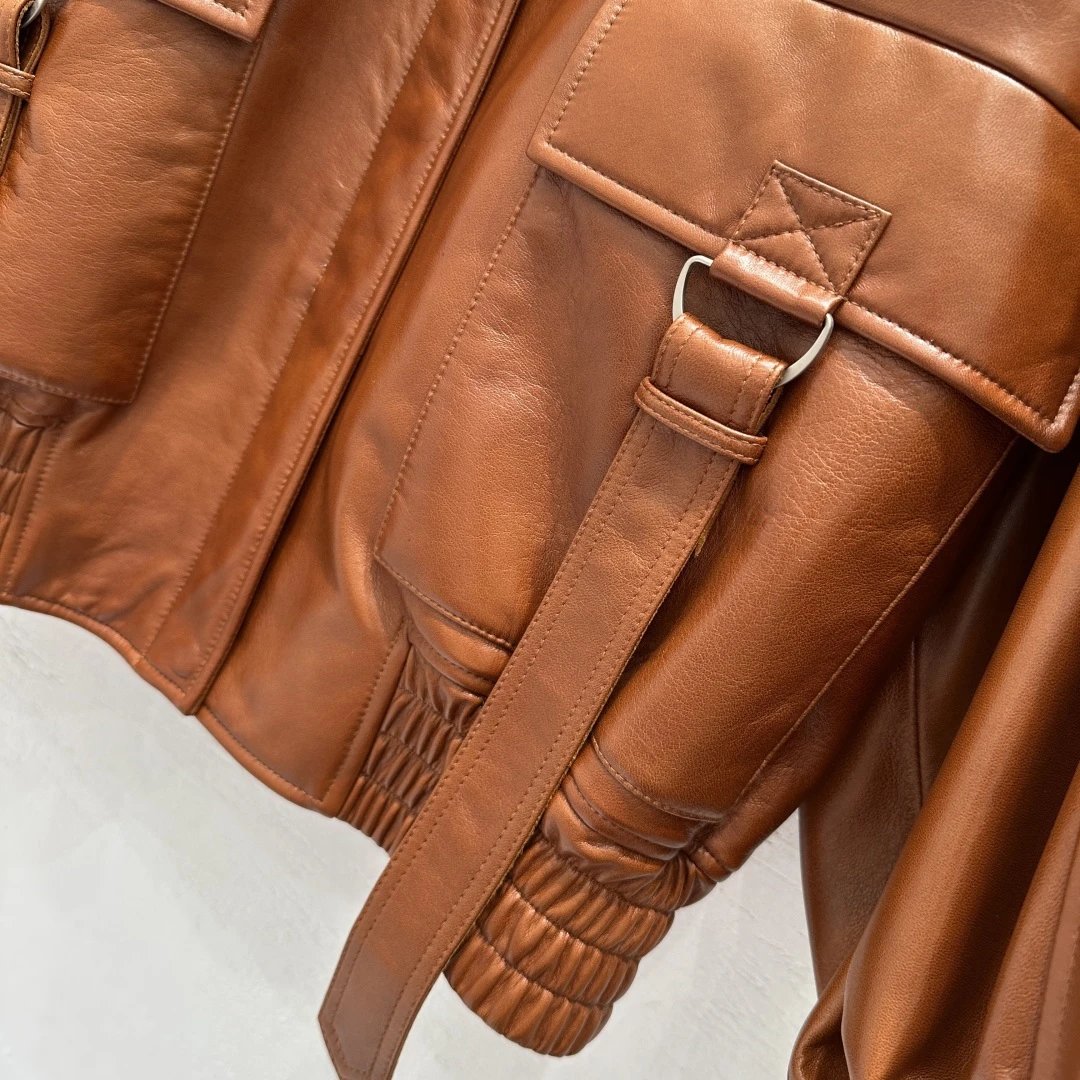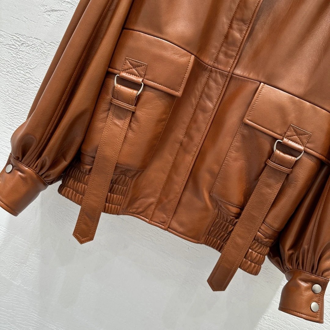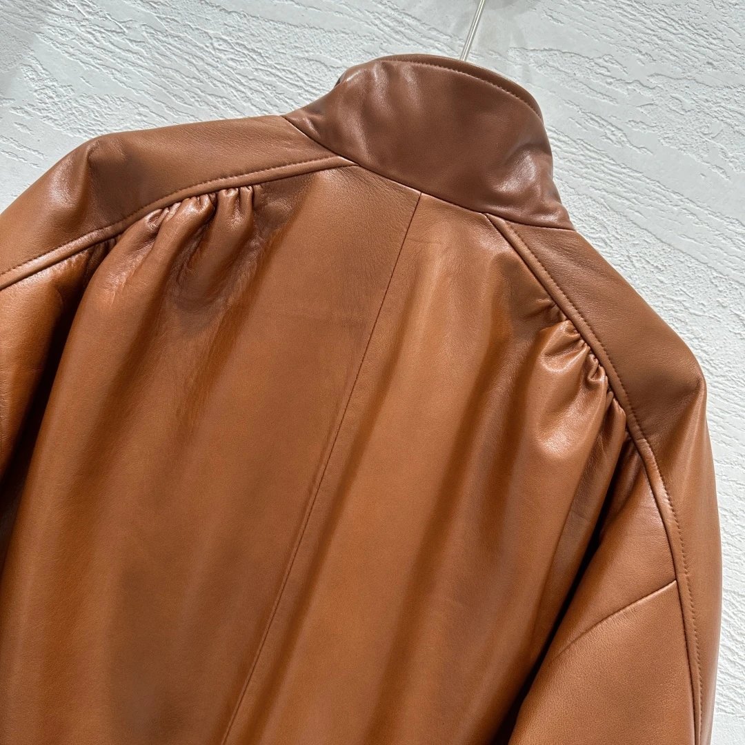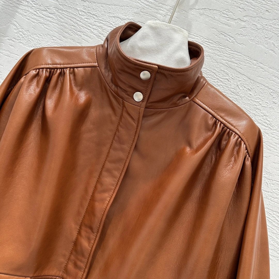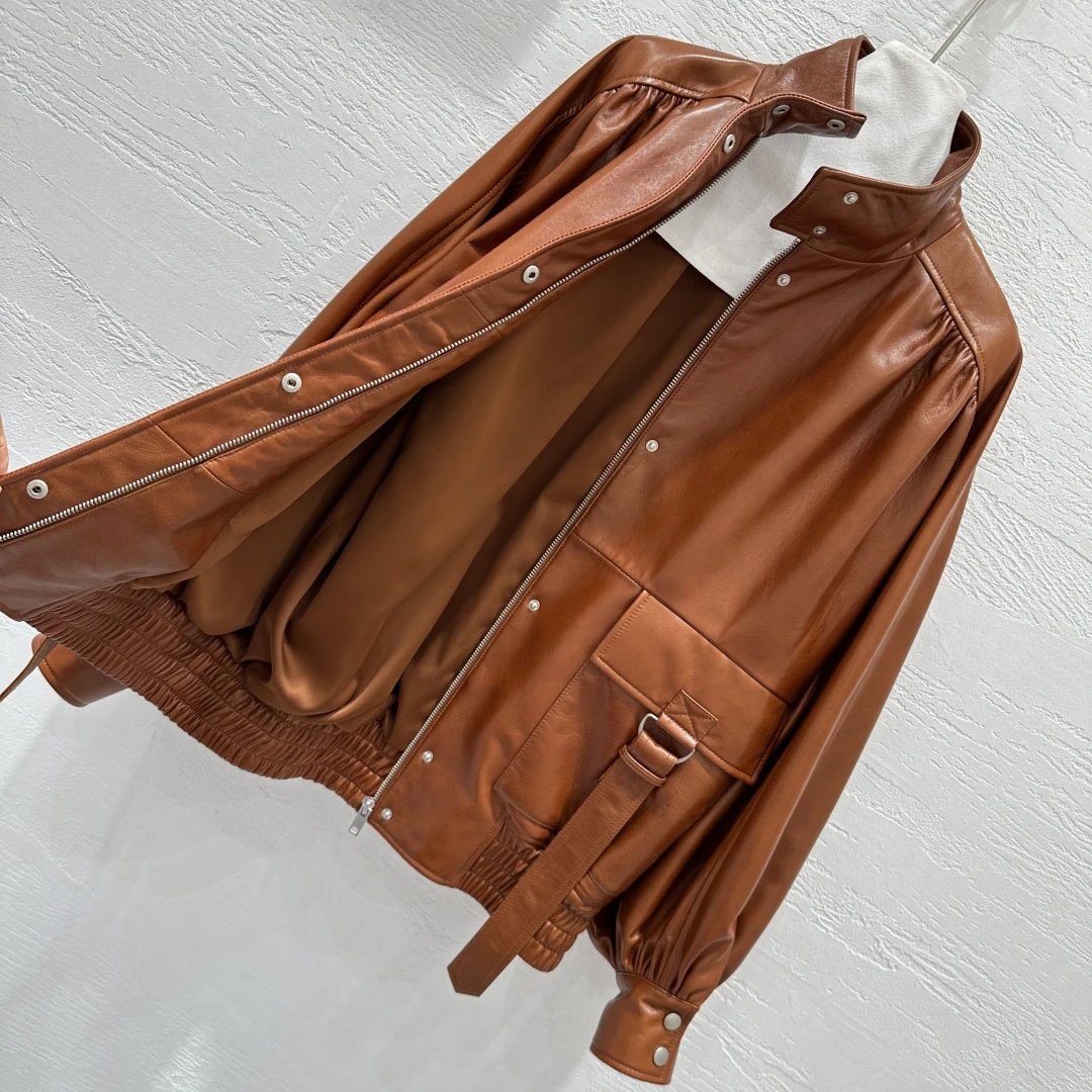 Chloe Exclusive High-End Original 25 Fall New Runway Jackets: Stand Collar & Pleated Design, 100% Sheepskin with Wax Finish, Sweet & Cool Style, Large Pockets, Flattering Fit, S/M/L Sizes, 2 Colors.