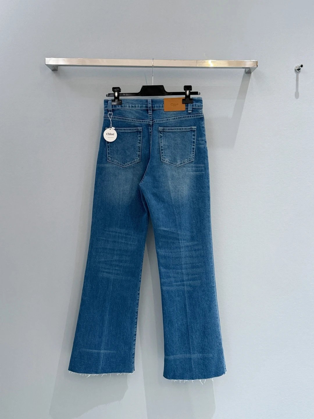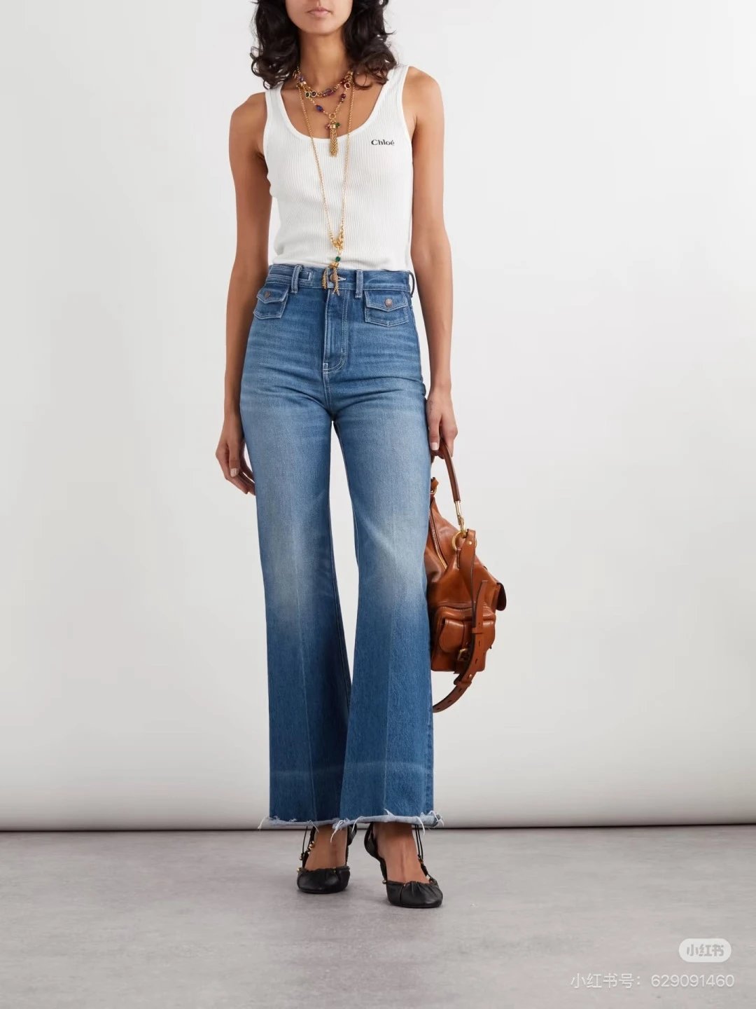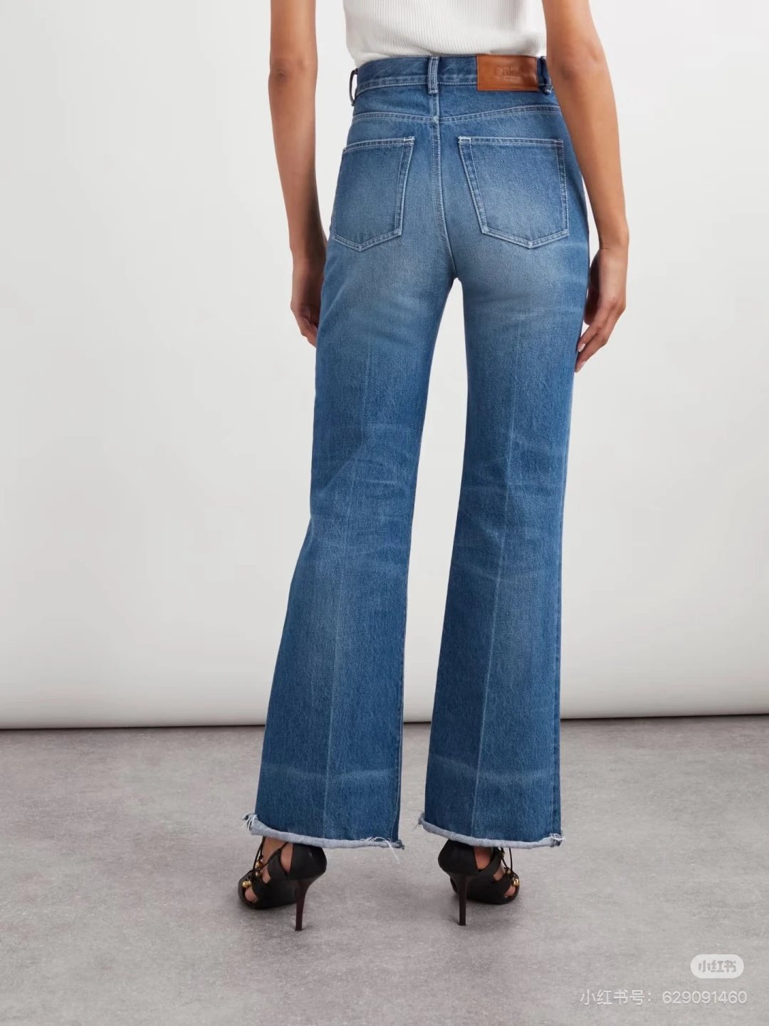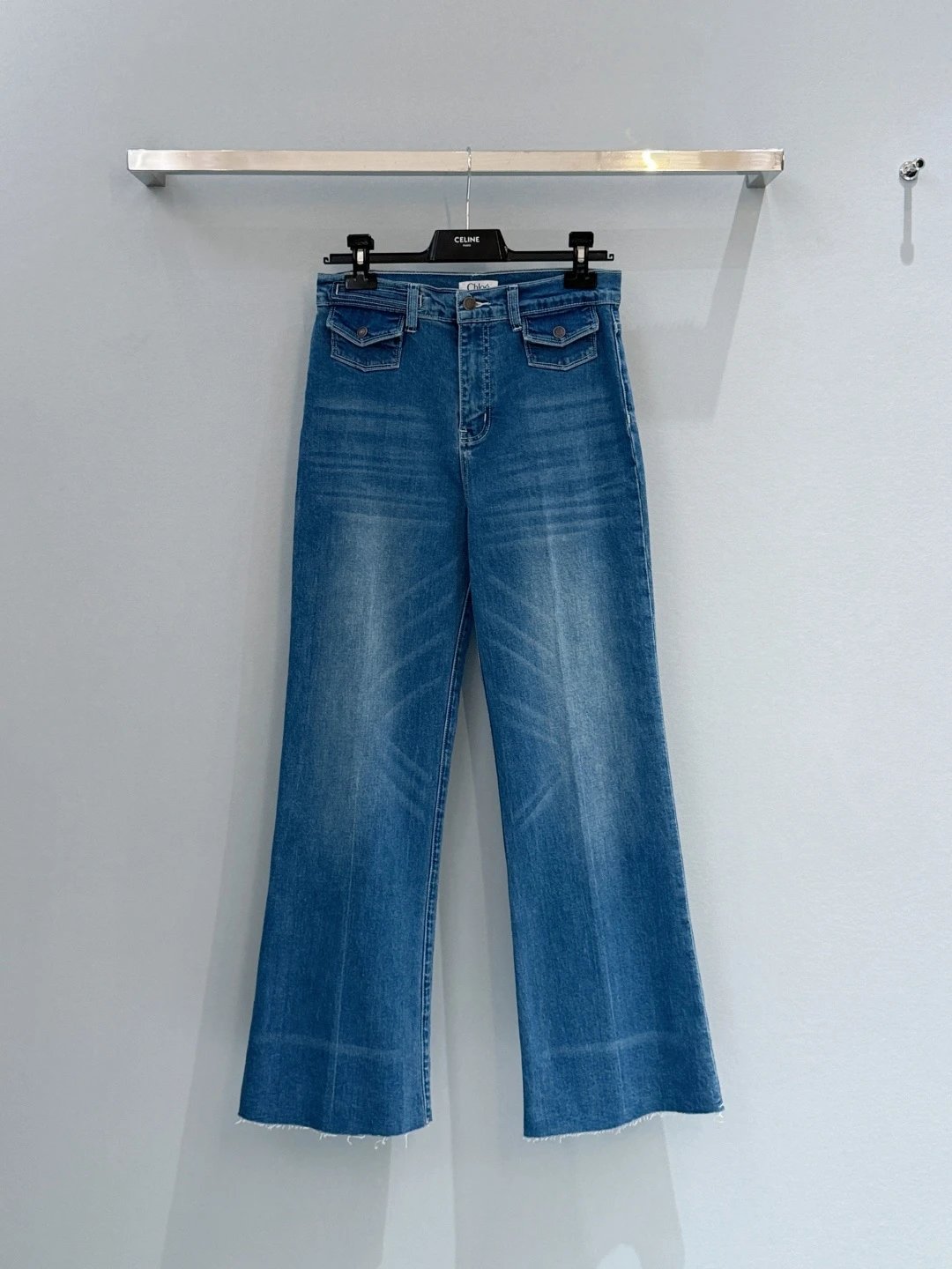Chloé, French luxury brand, presents high-waisted wide-leg frayed jeans with retro charm.