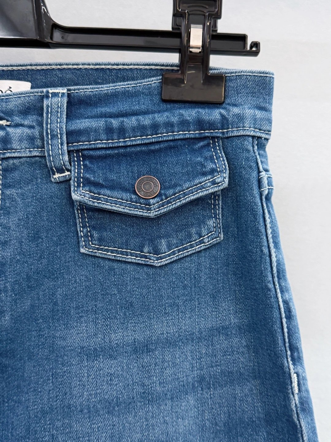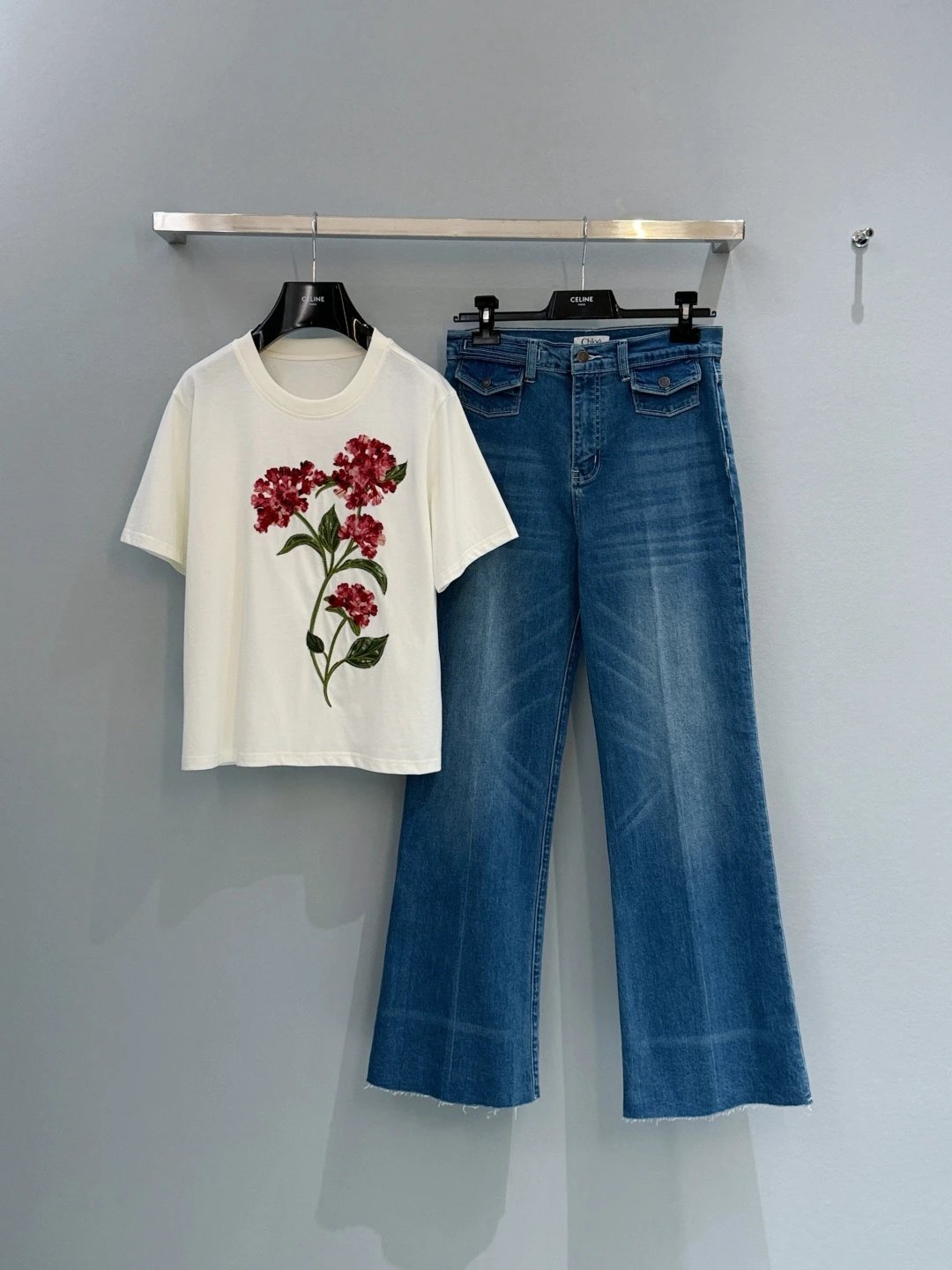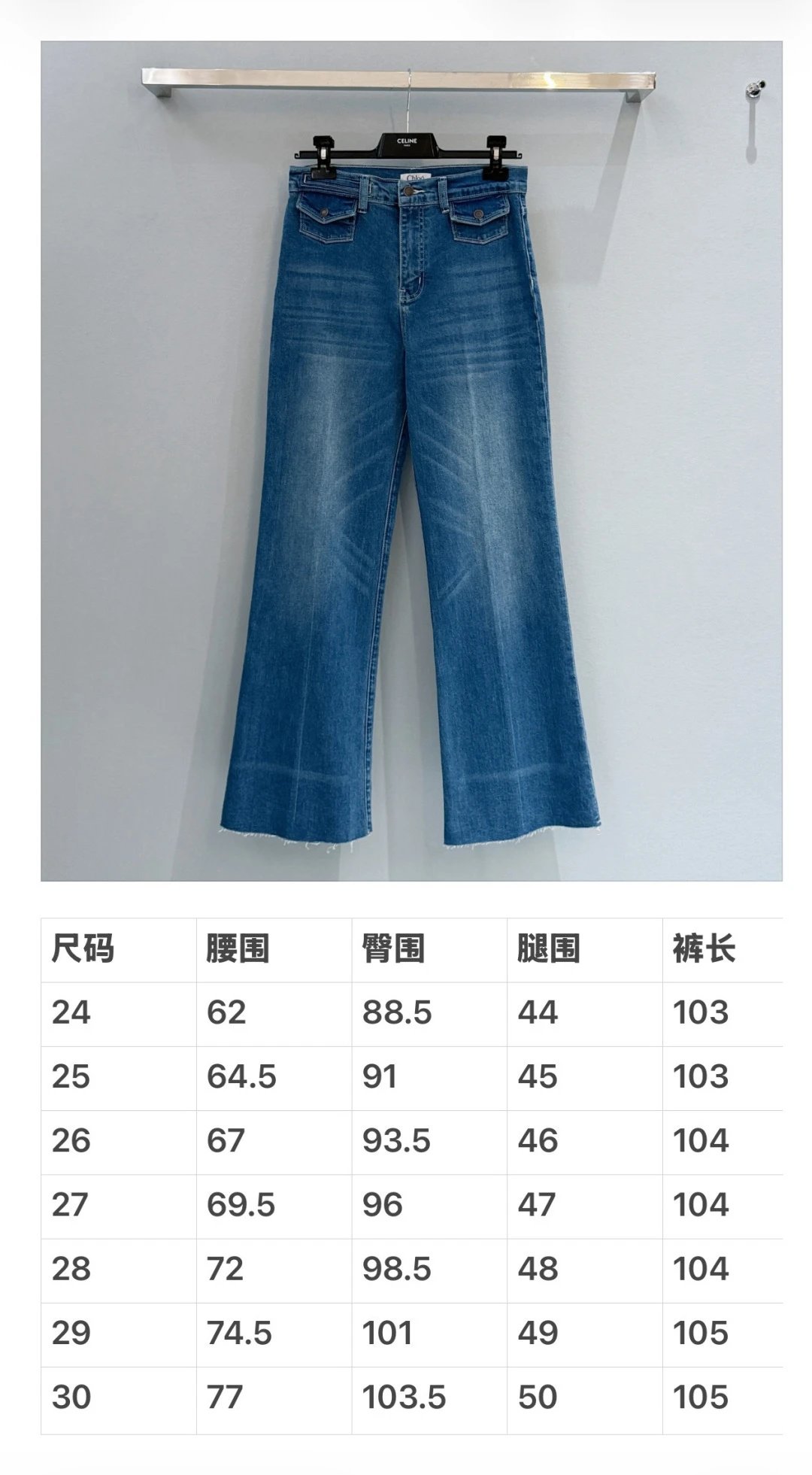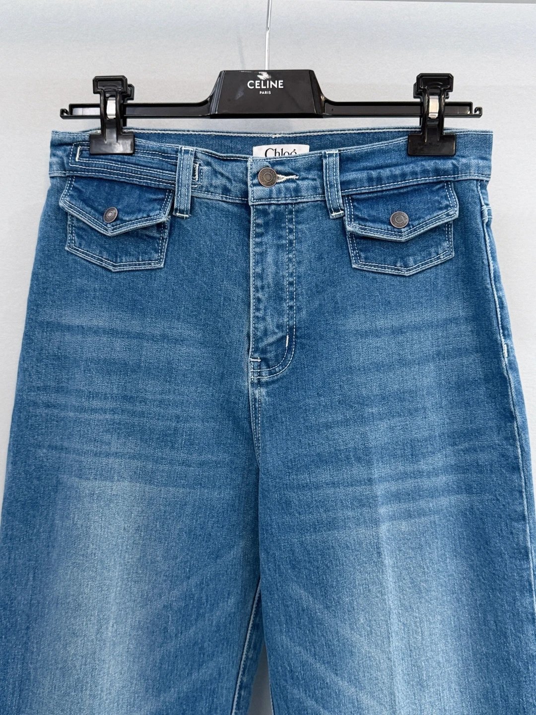 Chloé, French luxury brand, presents high-waisted wide-leg frayed jeans with retro charm.