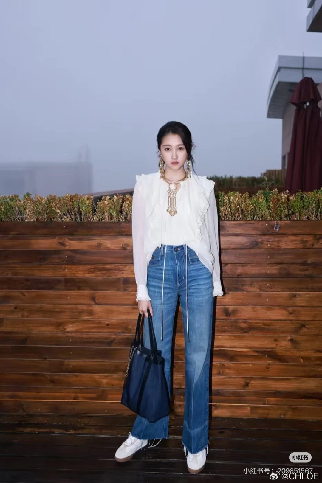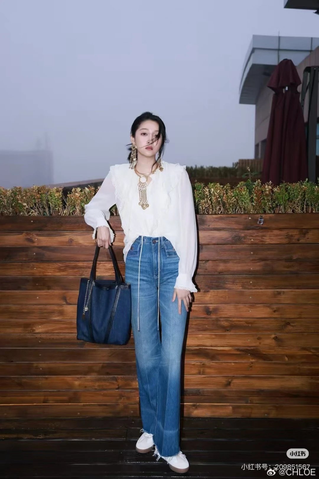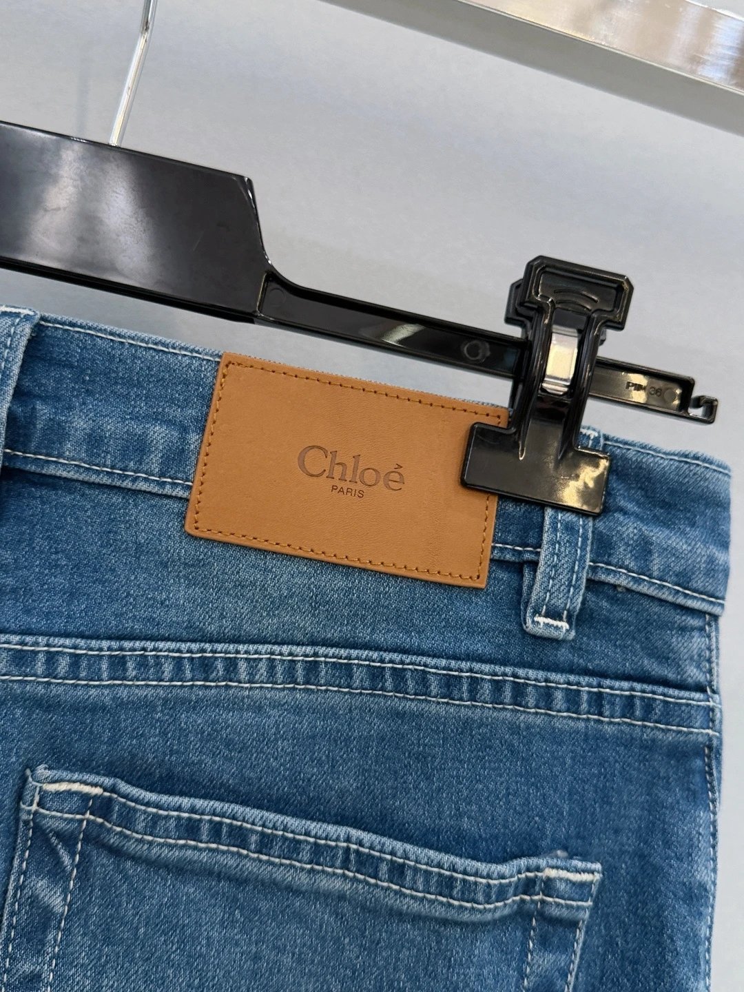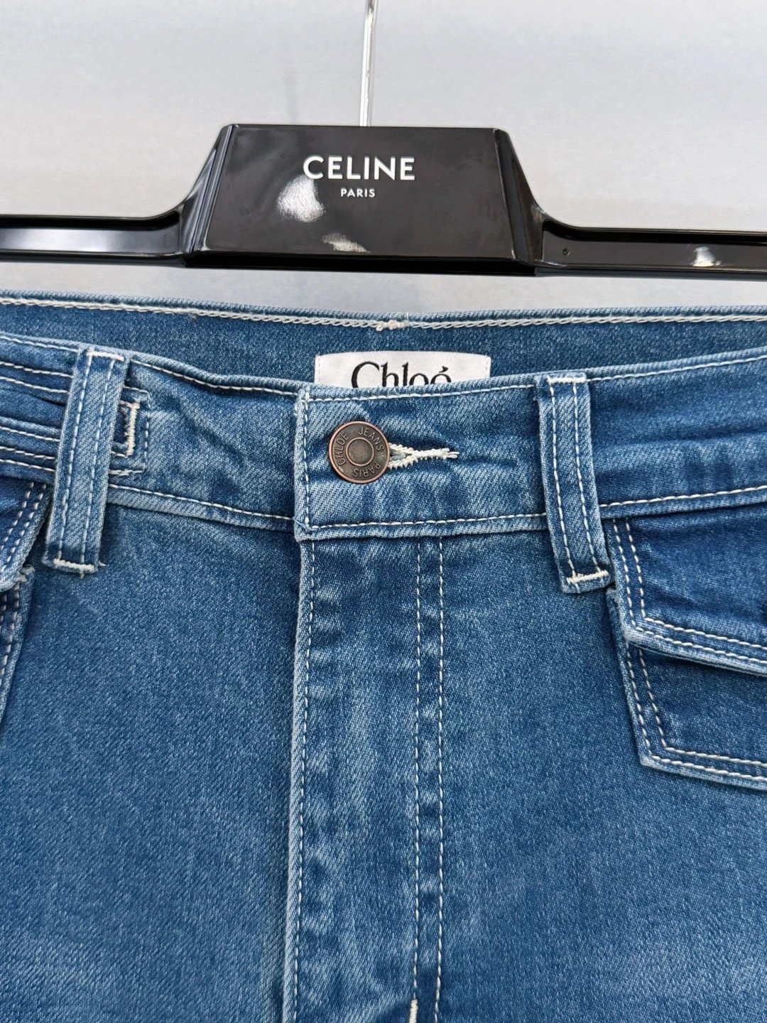Chloé, French luxury brand, presents high-waisted wide-leg frayed jeans with retro charm.