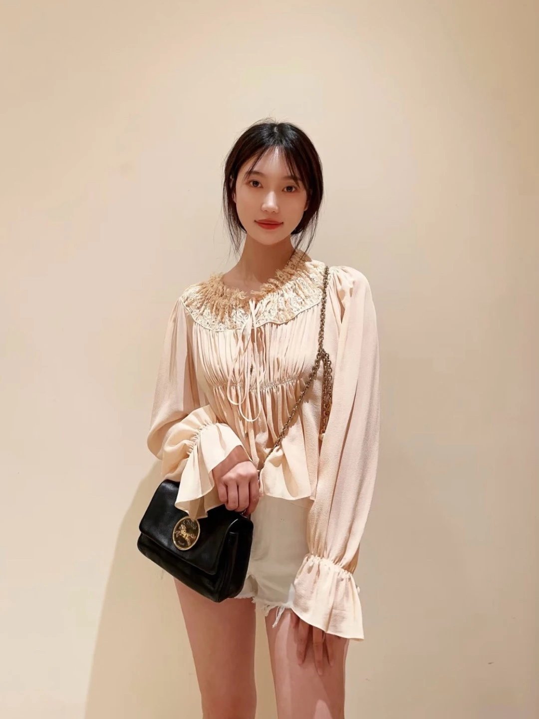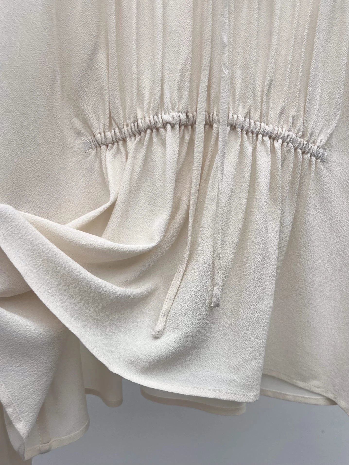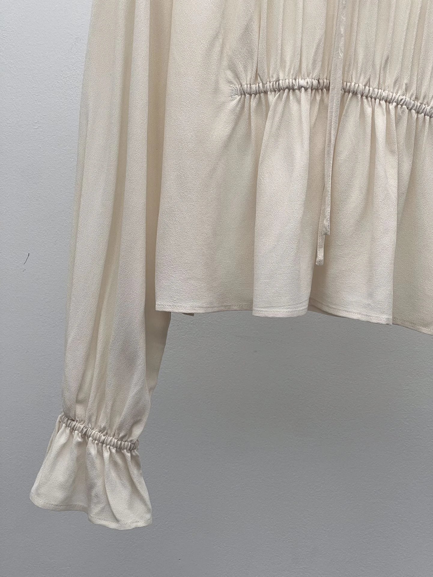 It features an adjustable drawstring lace neckline and pleats to flatter your figure.
