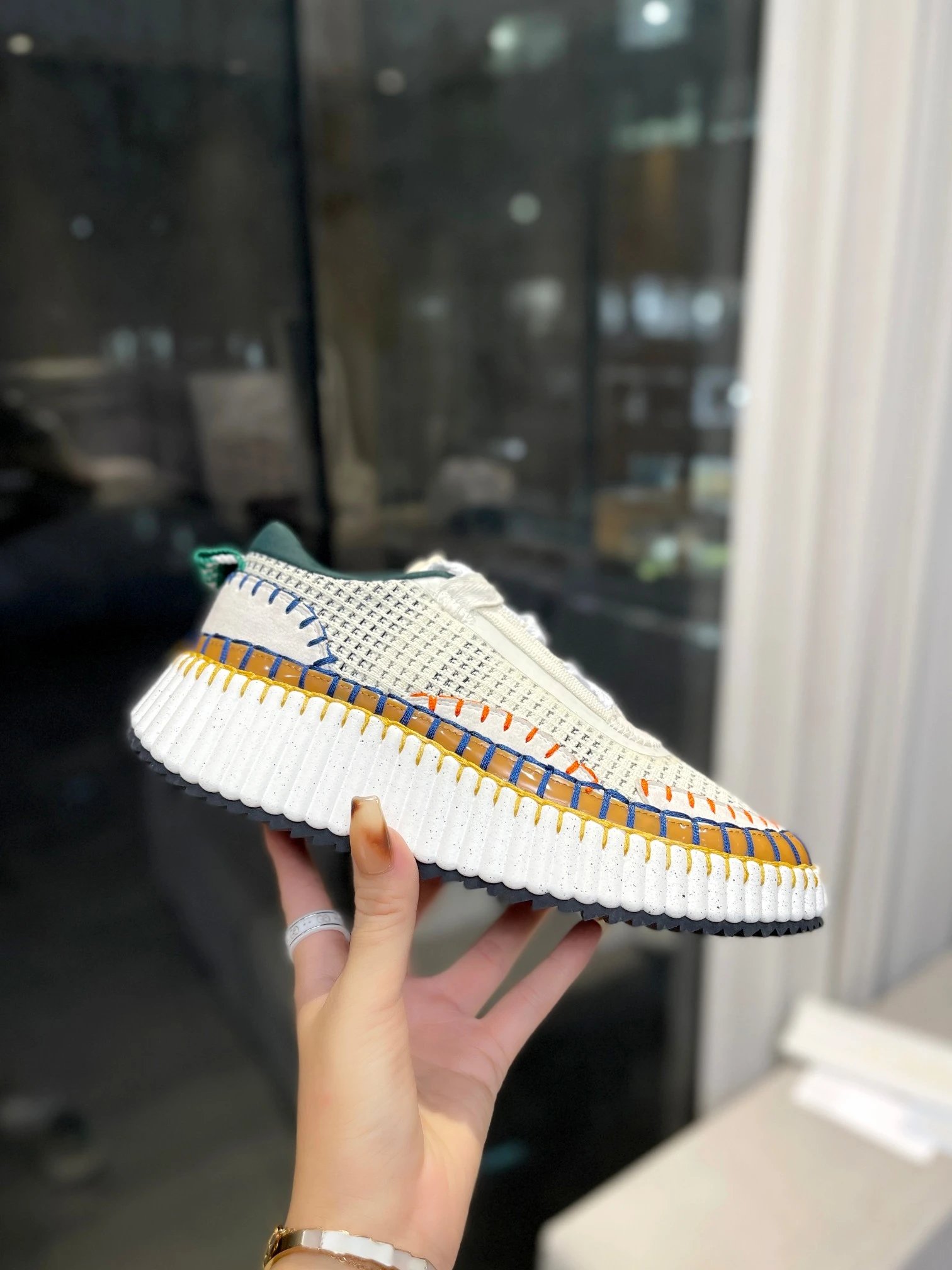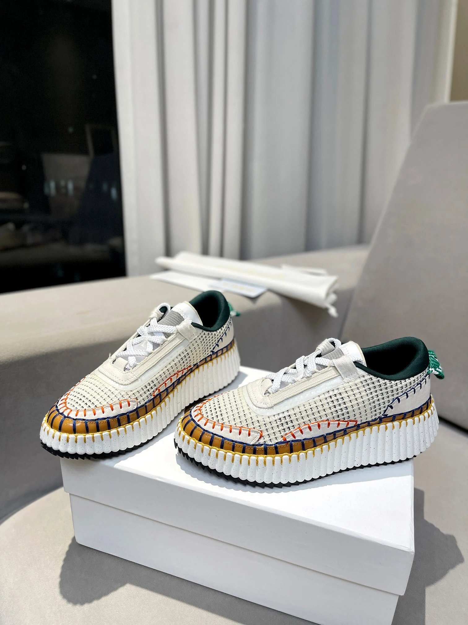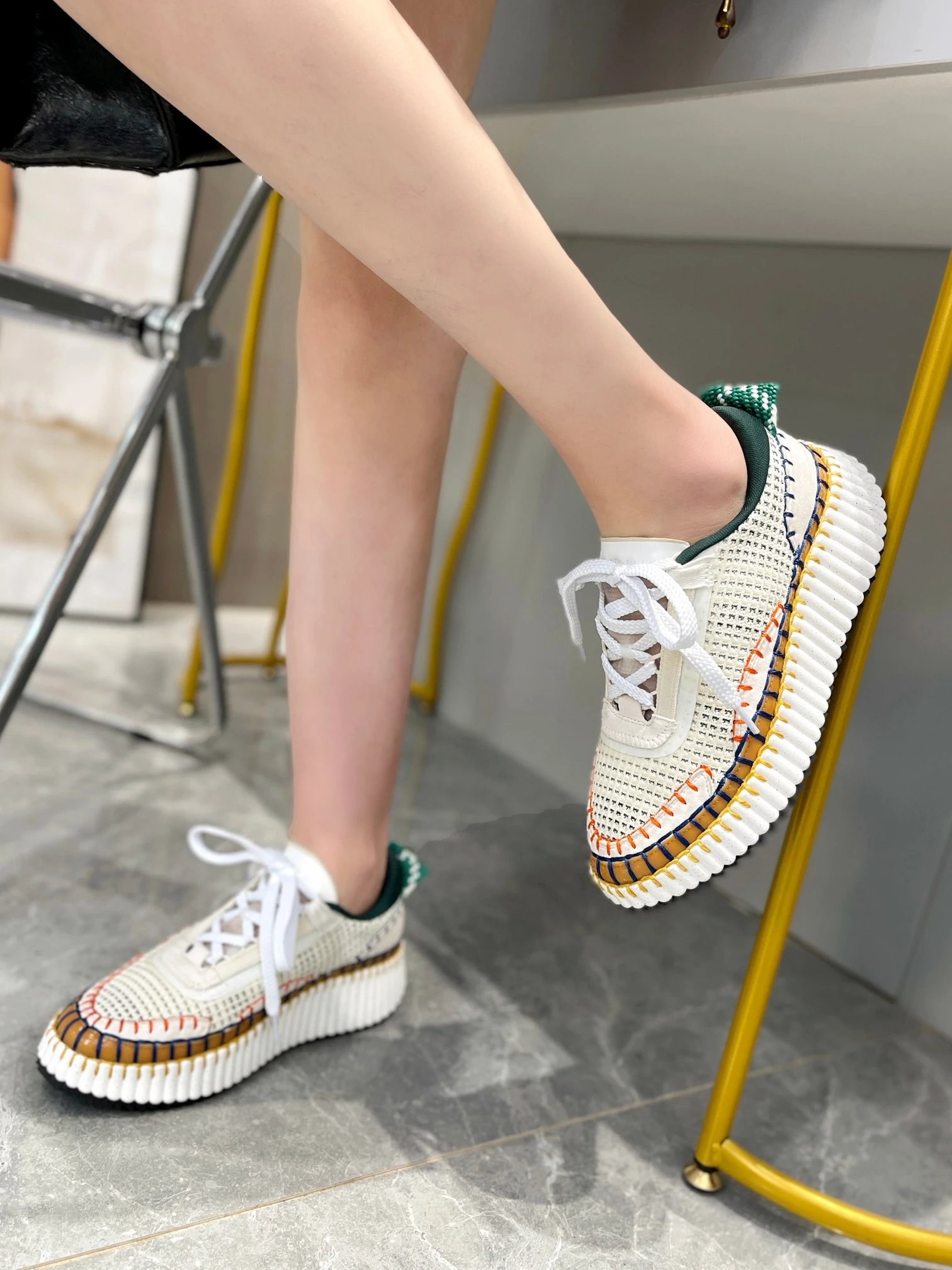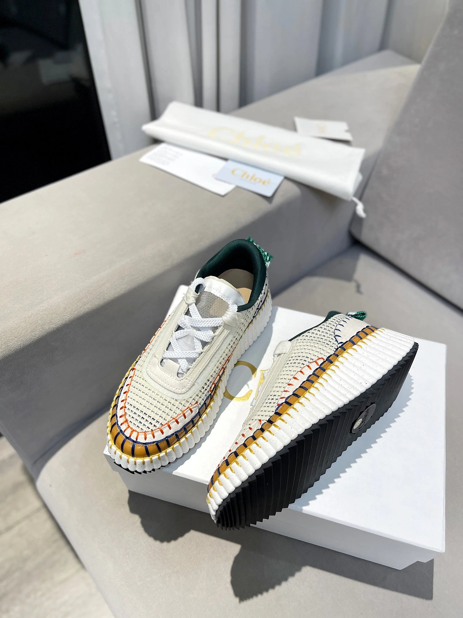 Chloe Nama Rainbow Sneakers are eco-friendly, crafted from recycled materials with hand-stitched details.