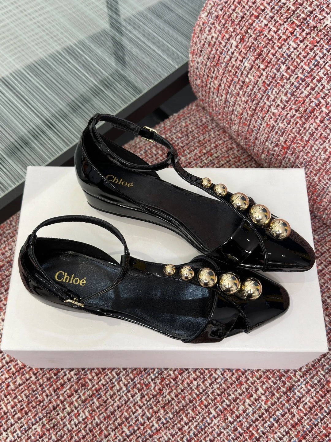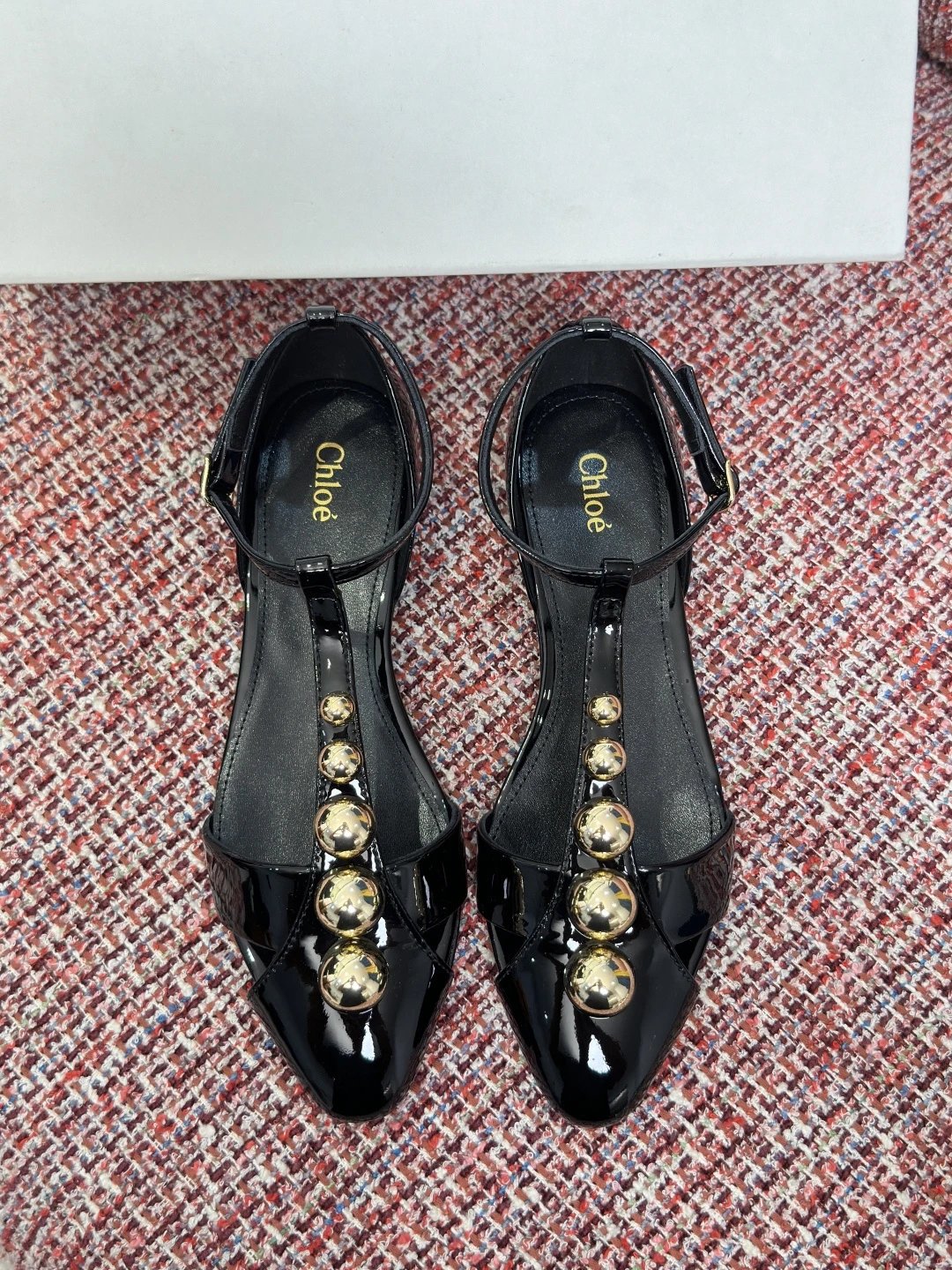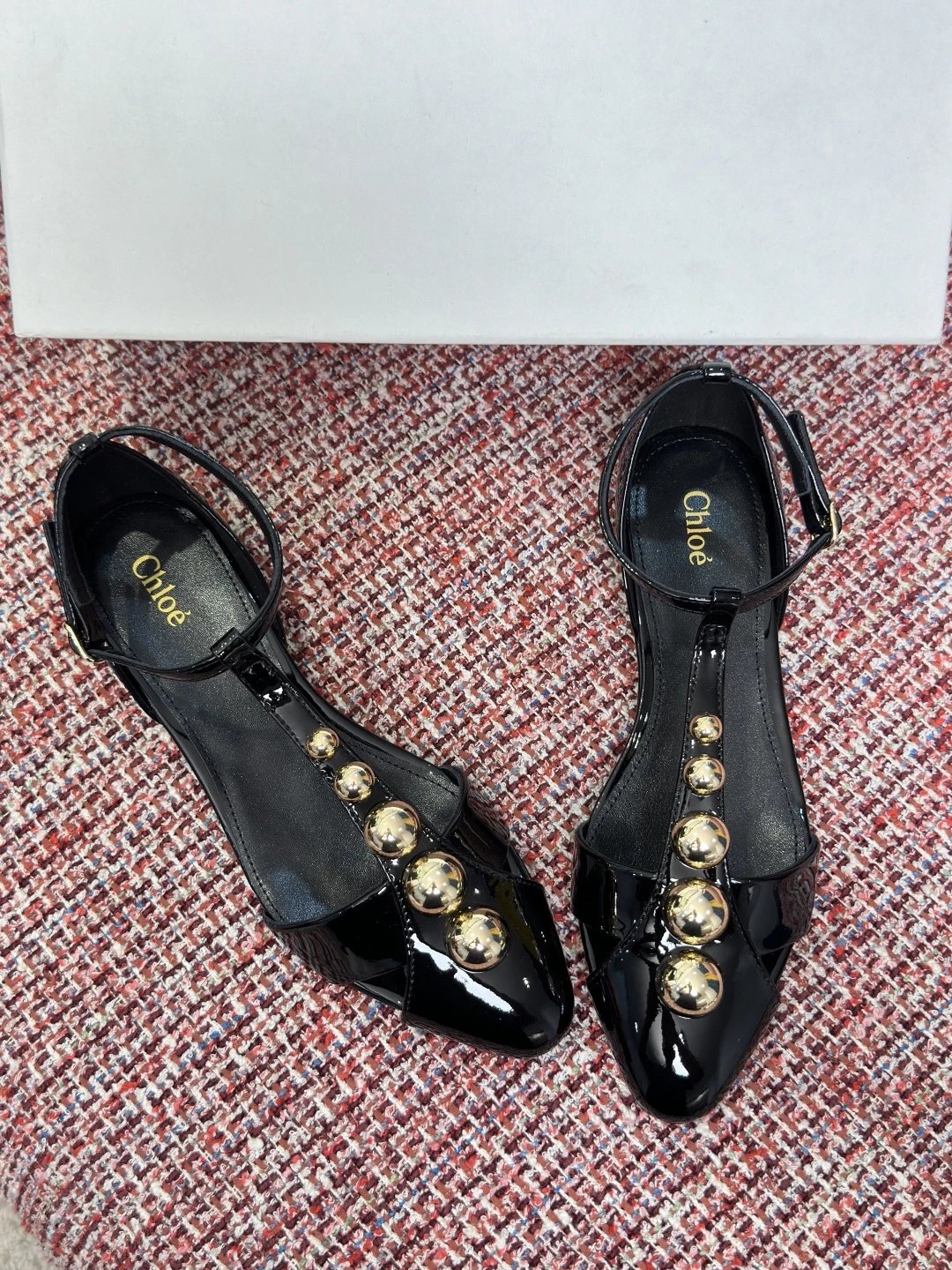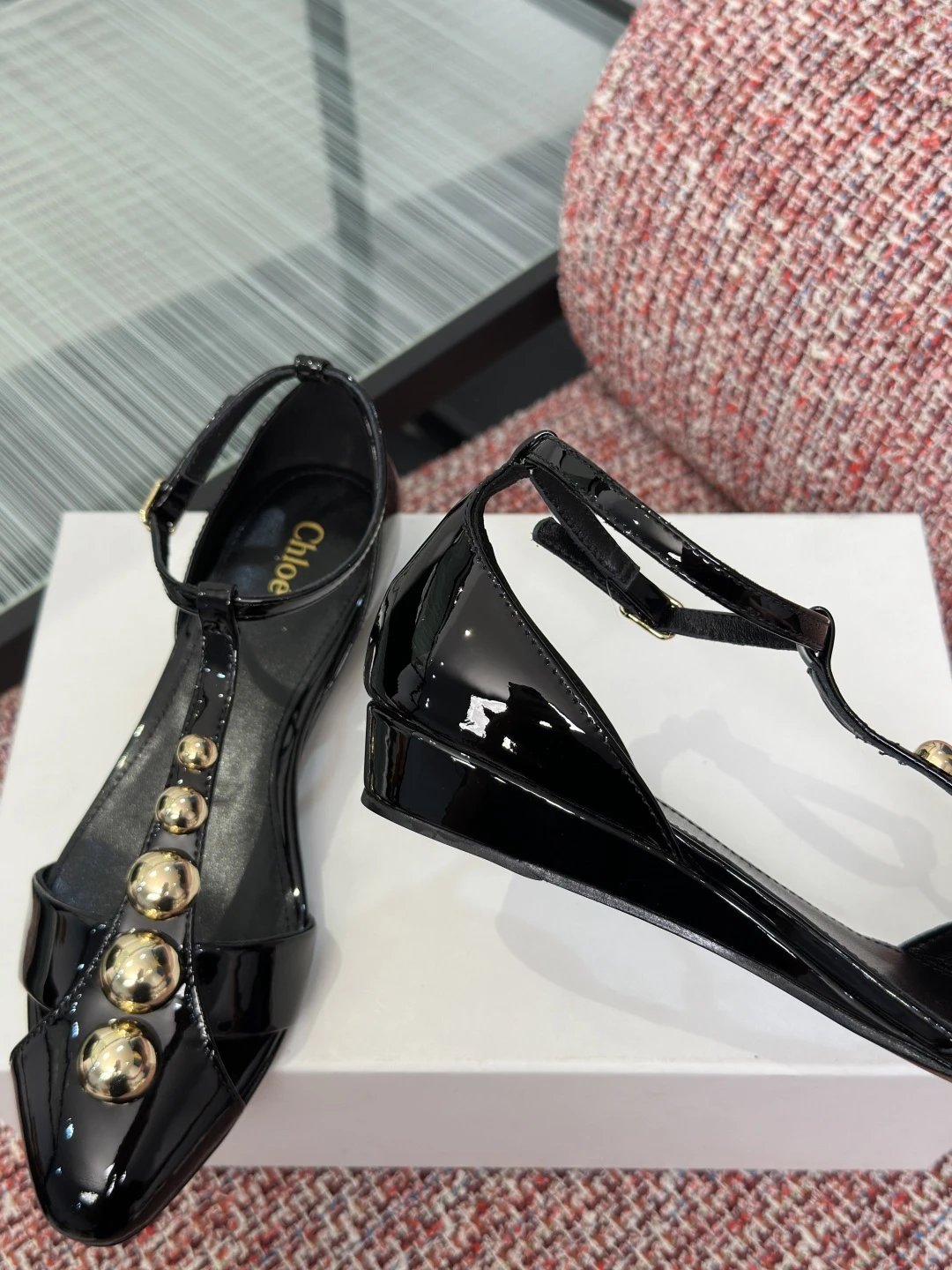 Chloé 2026 Spring Summer women's pointed toe T-strap sandals with rivets, glossy calfskin, 2.5cm wedge/6cm stiletto heels.