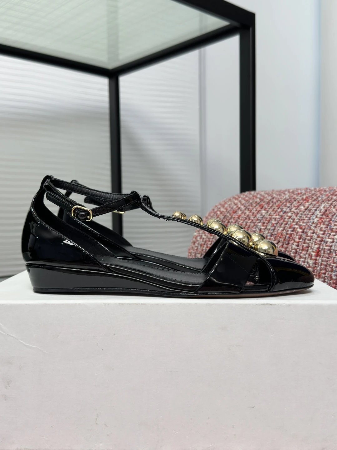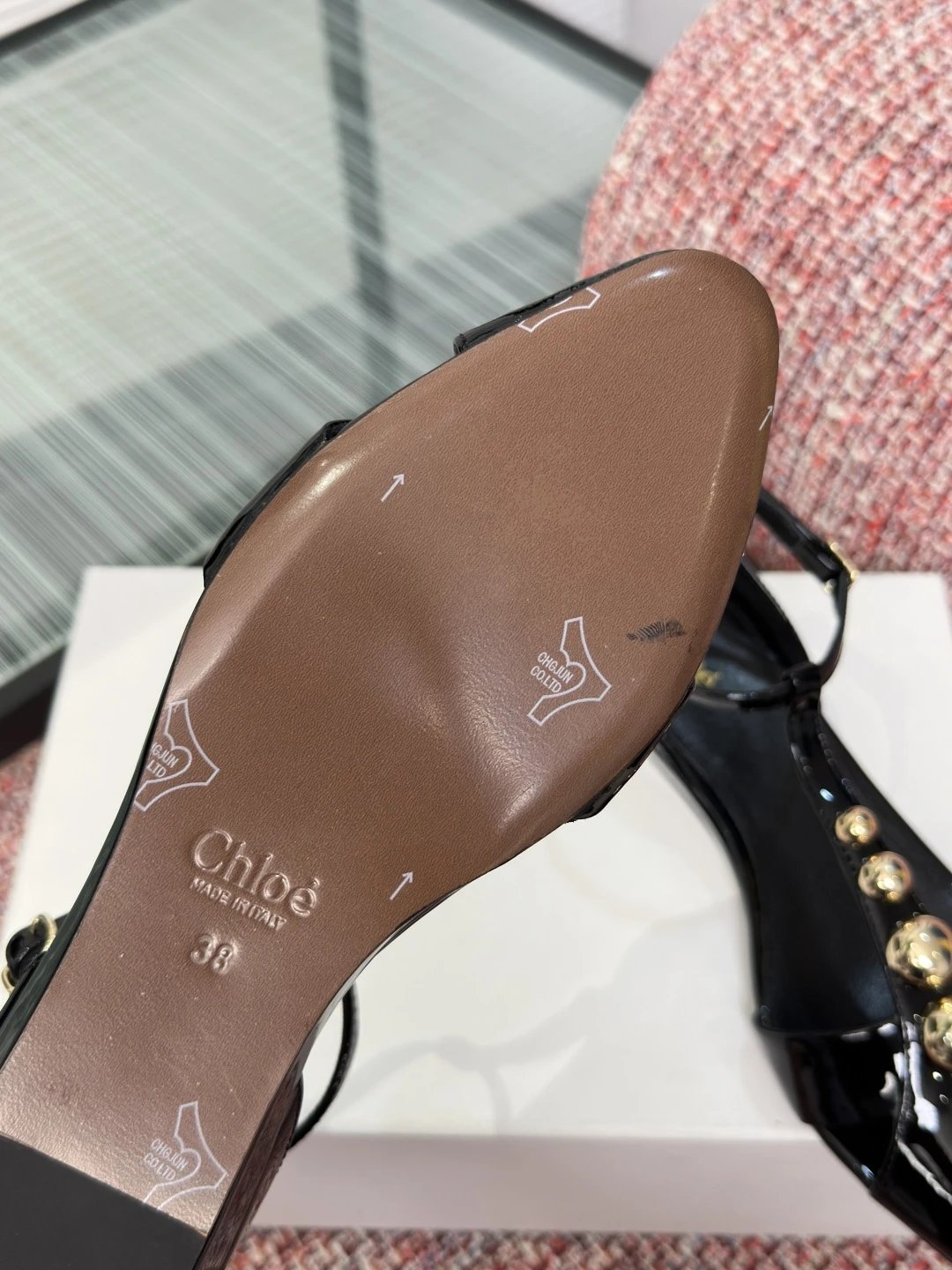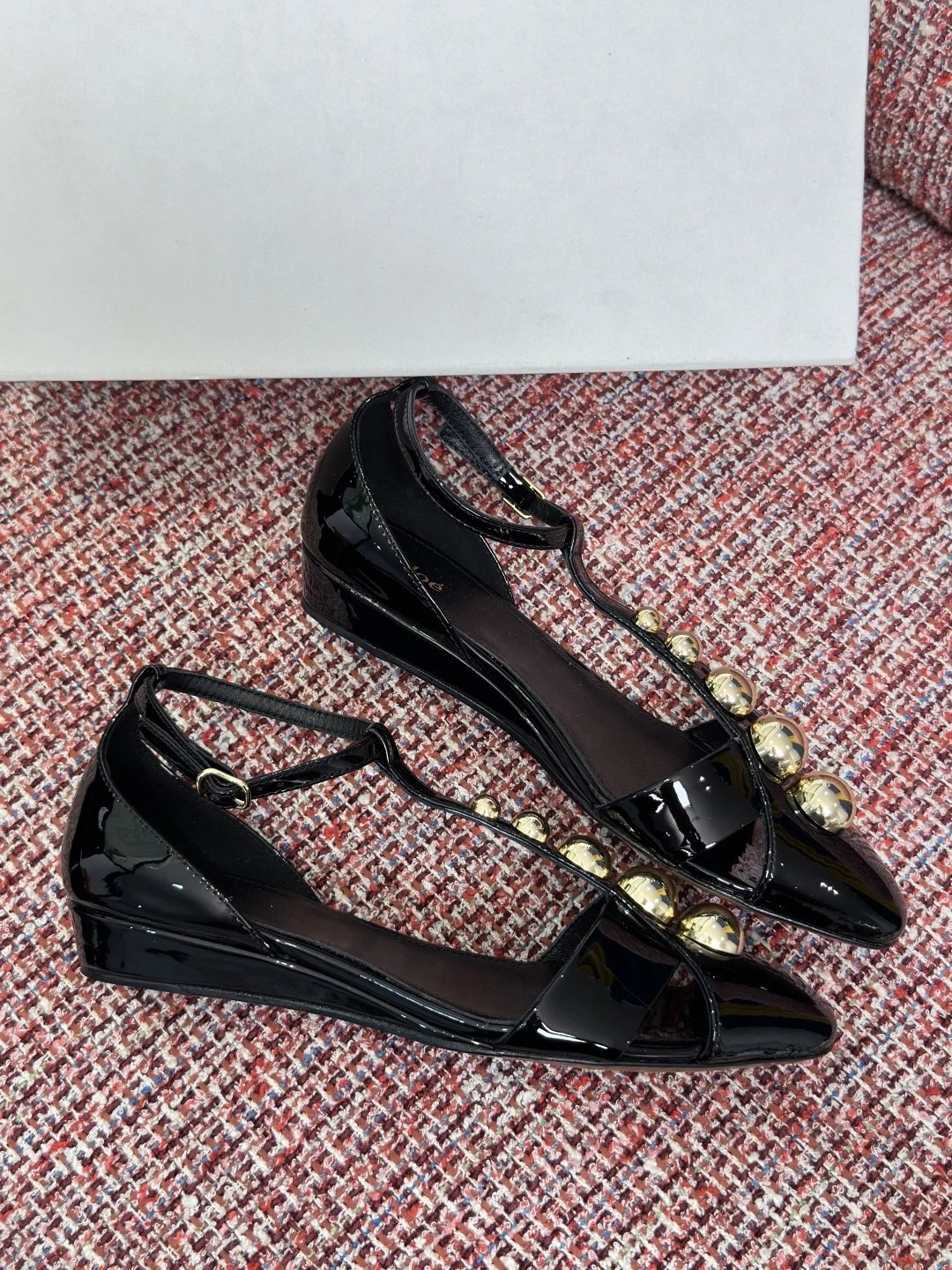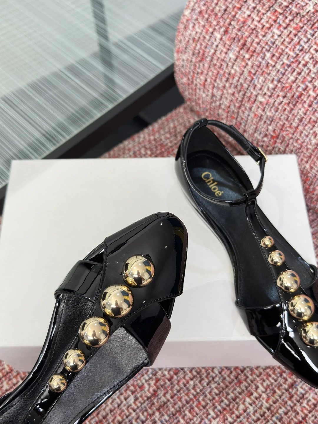 Chloé 2026 Spring Summer women's pointed toe T-strap sandals with rivets, glossy calfskin, 2.5cm wedge/6cm stiletto heels.