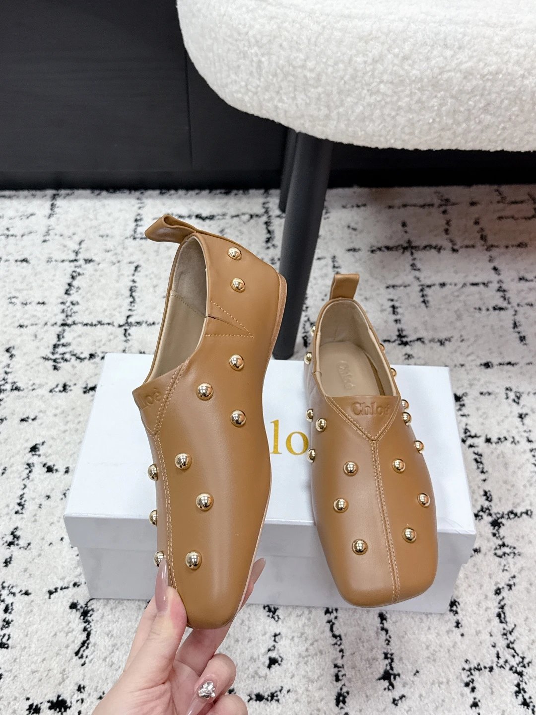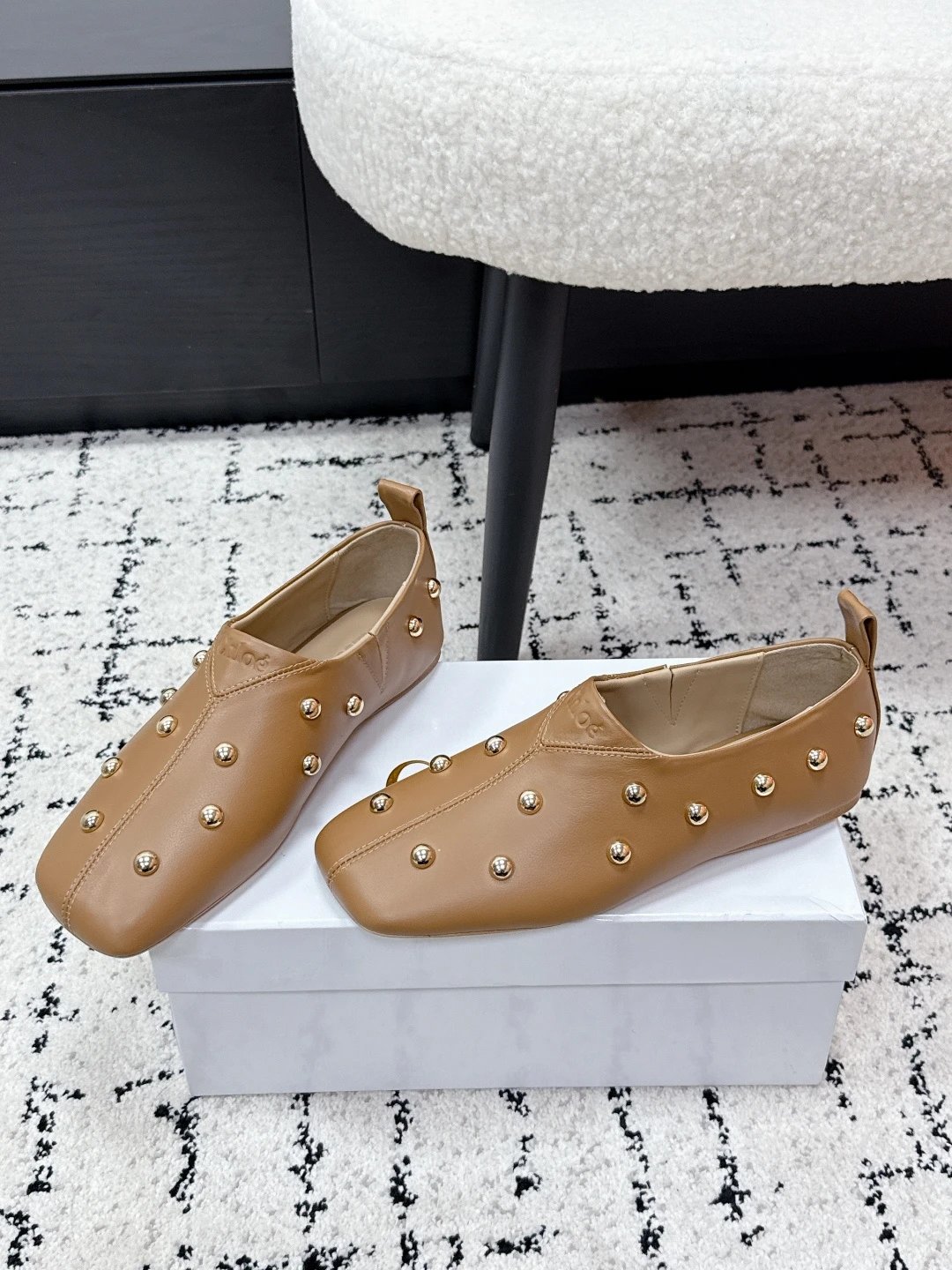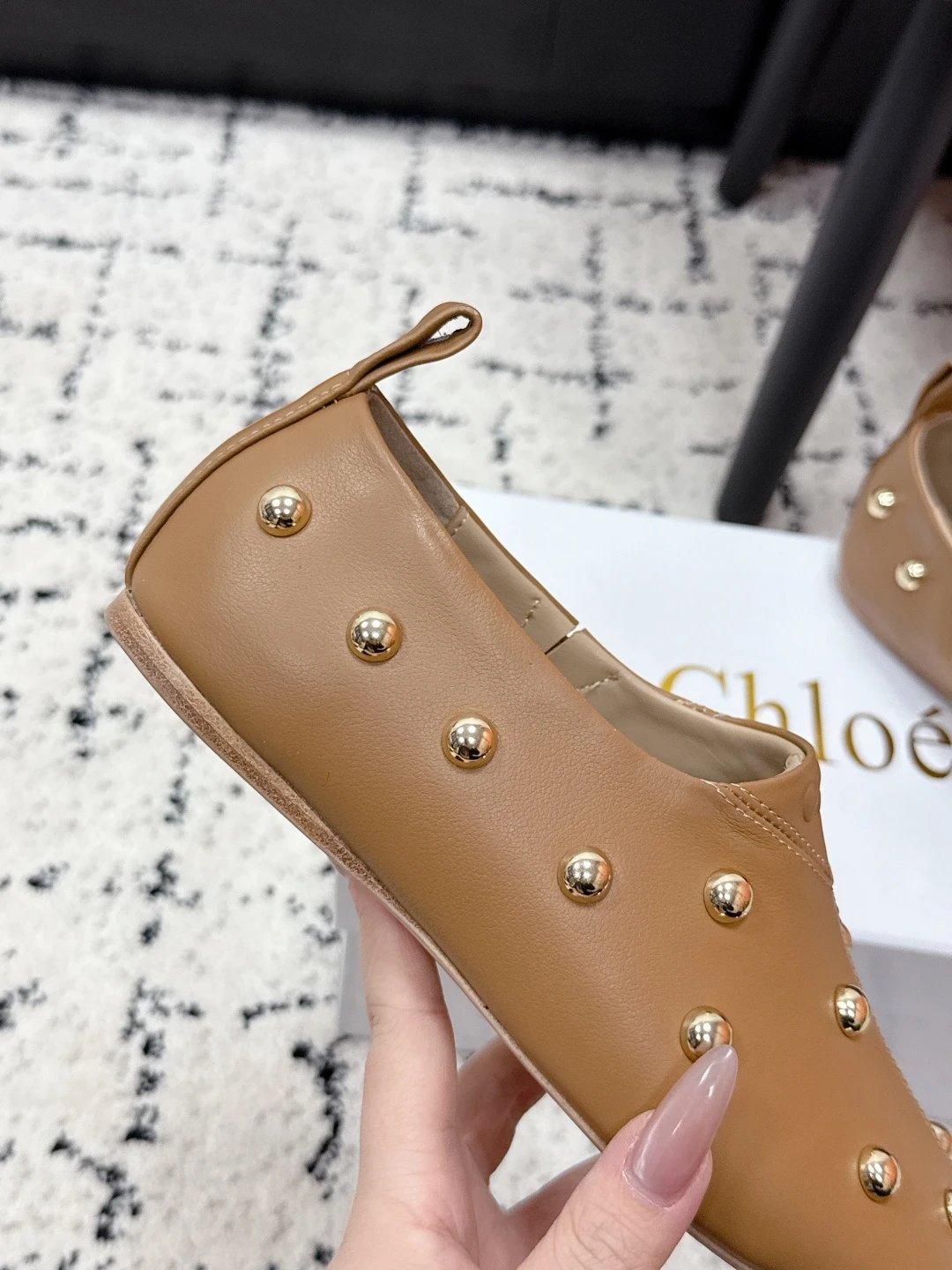 Chloe 26 New Metal Round Rivets Cowhide Flats are stylish daily essentials.
