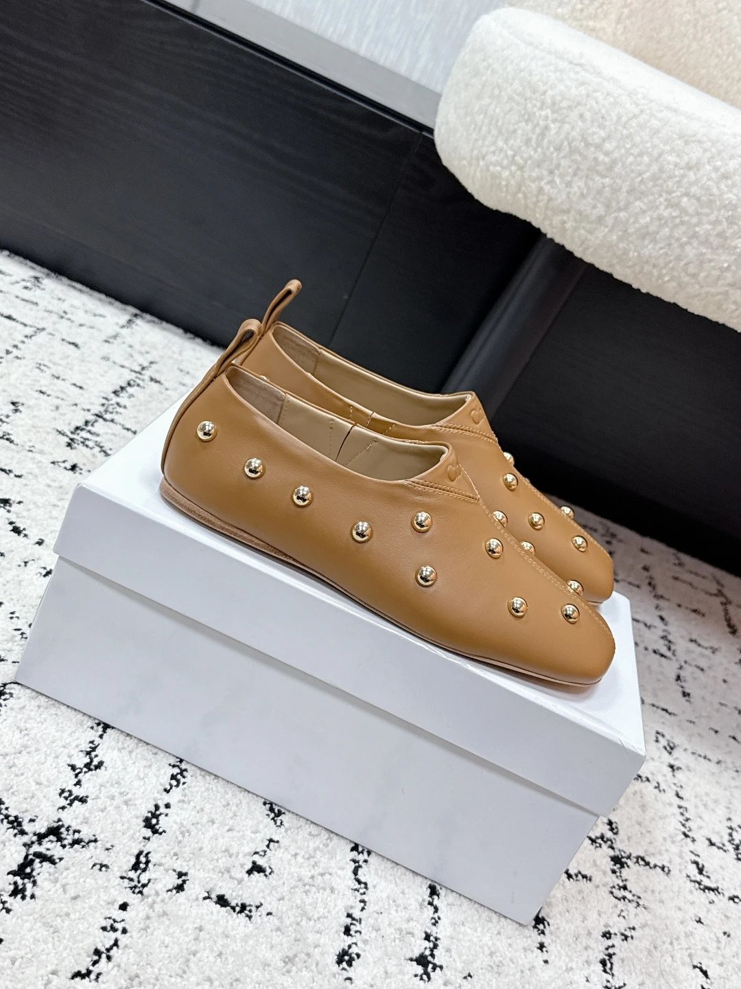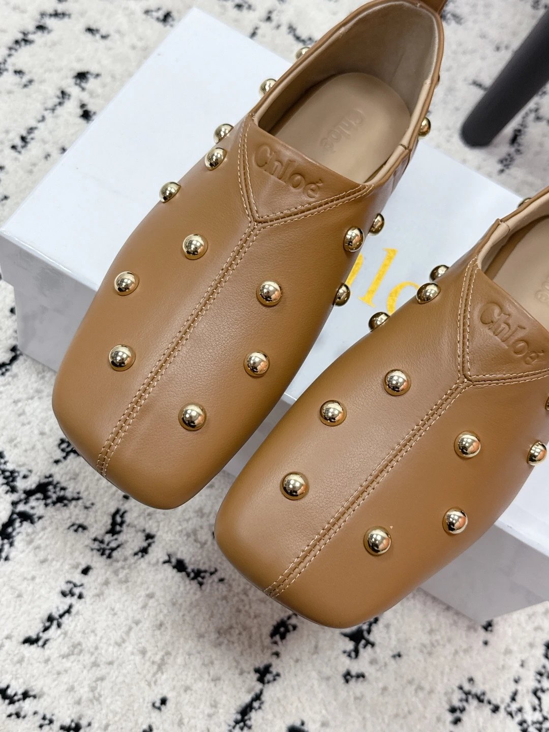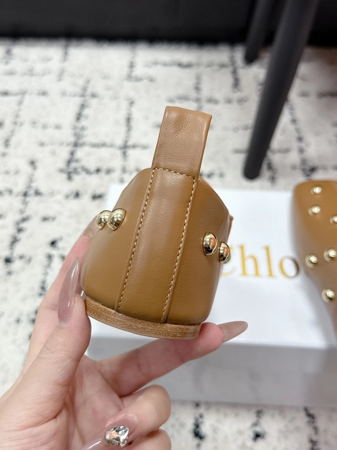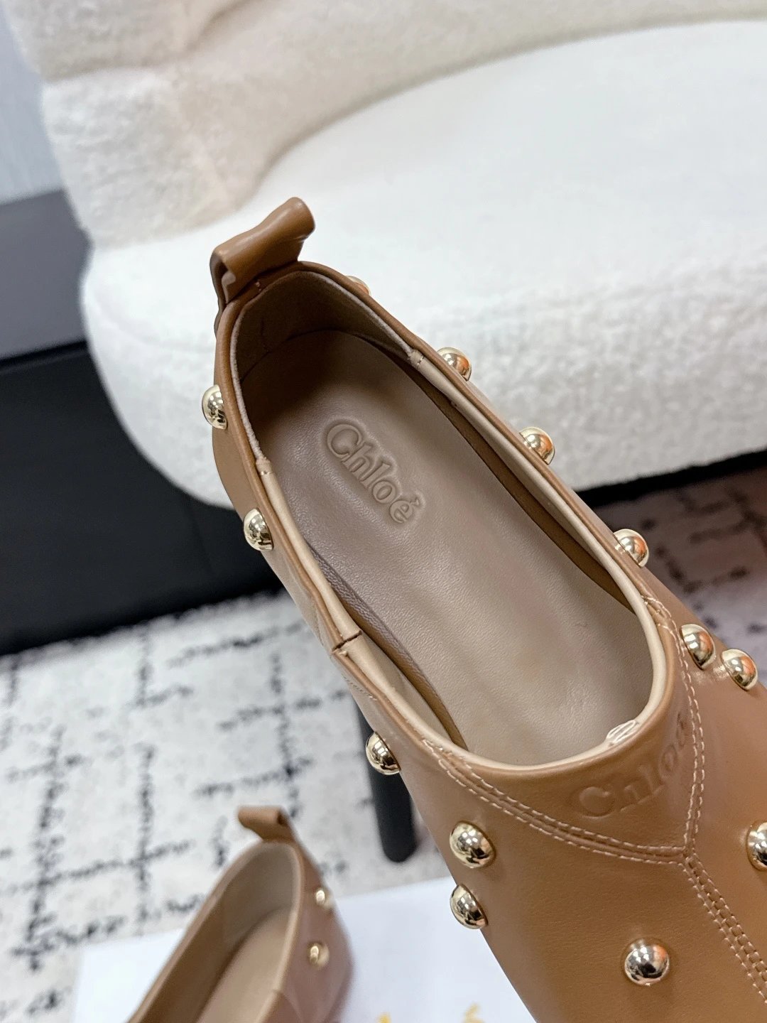Chloe 26 New Metal Round Rivets Cowhide Flats are stylish daily essentials.