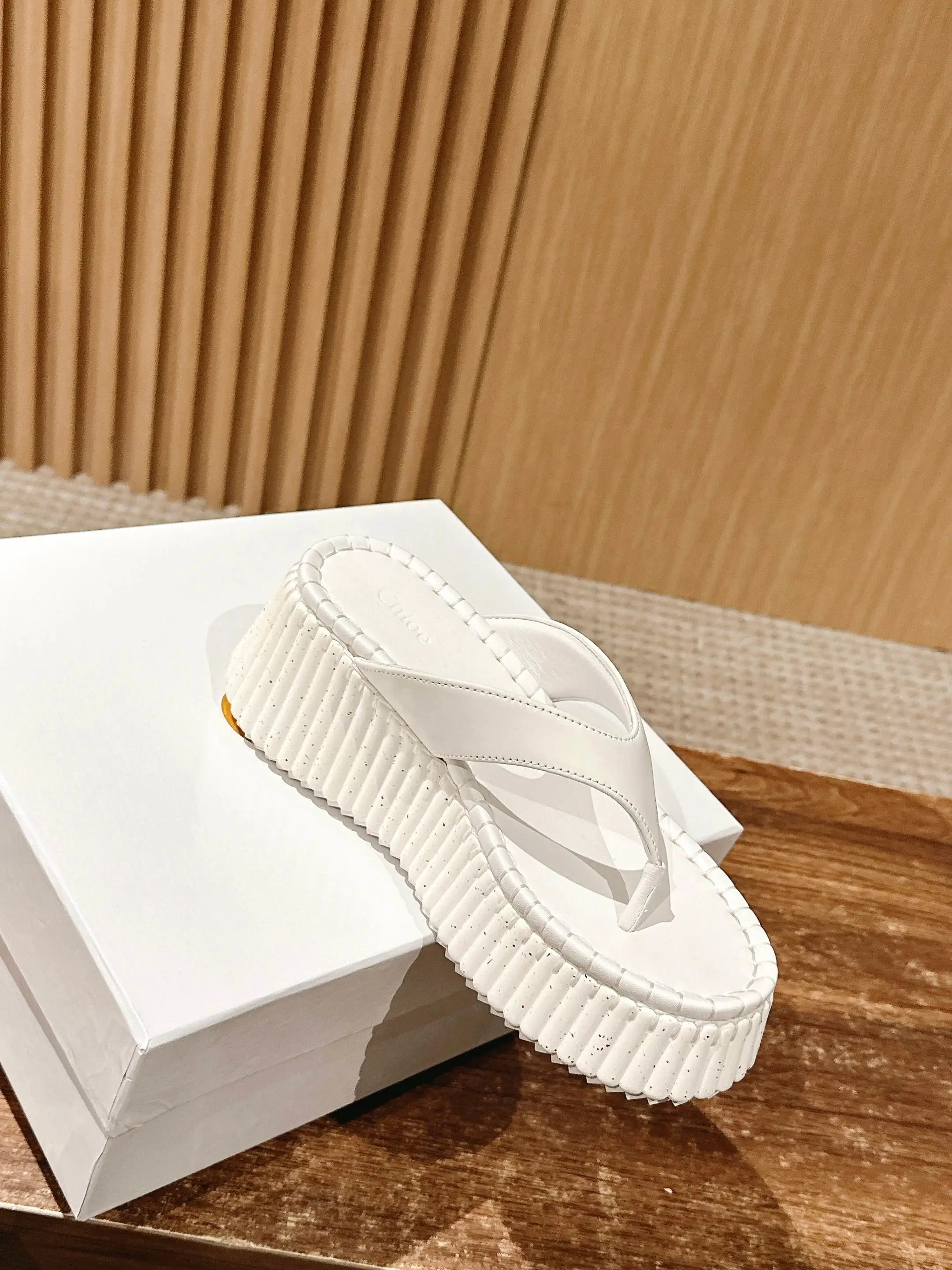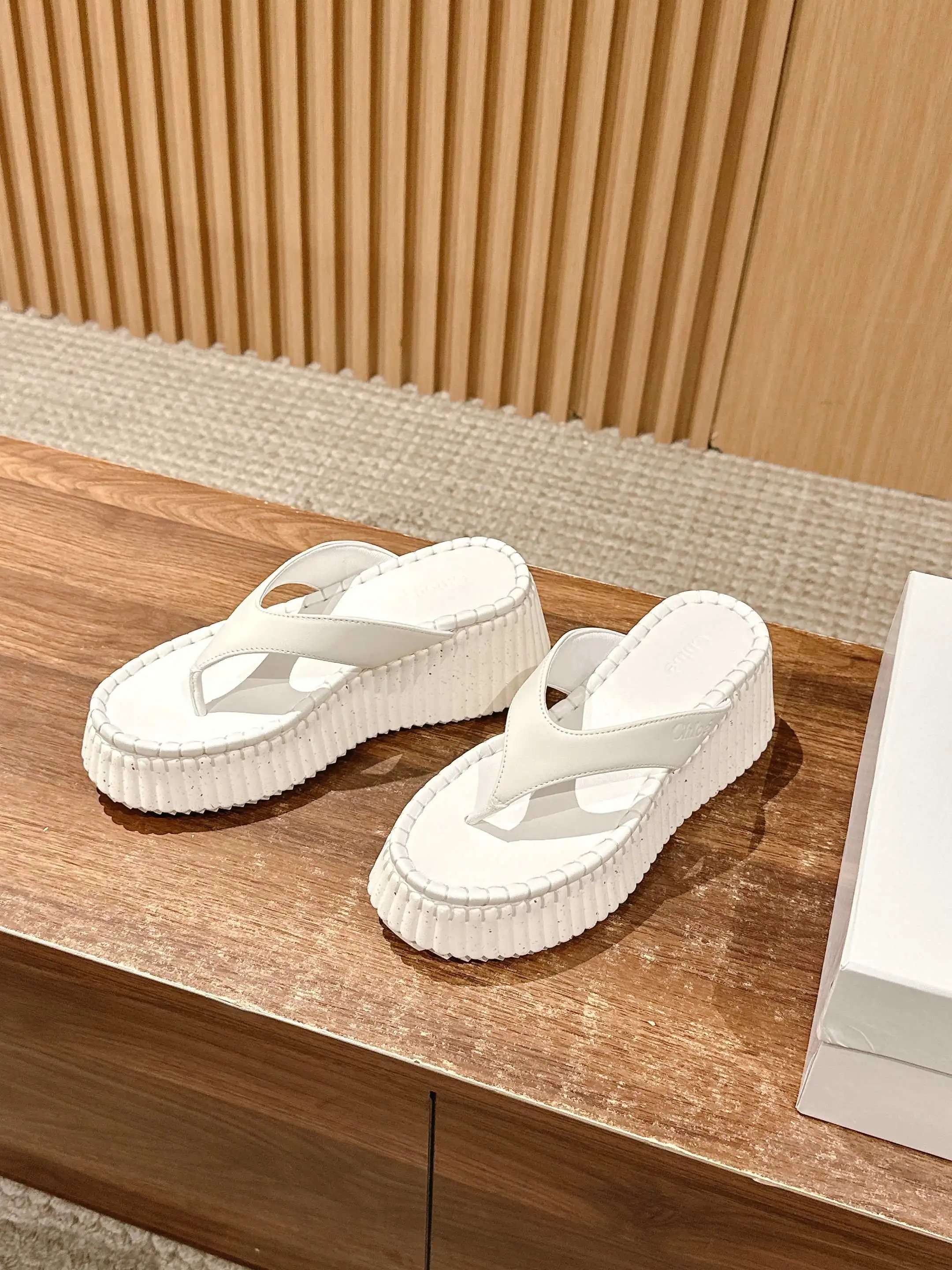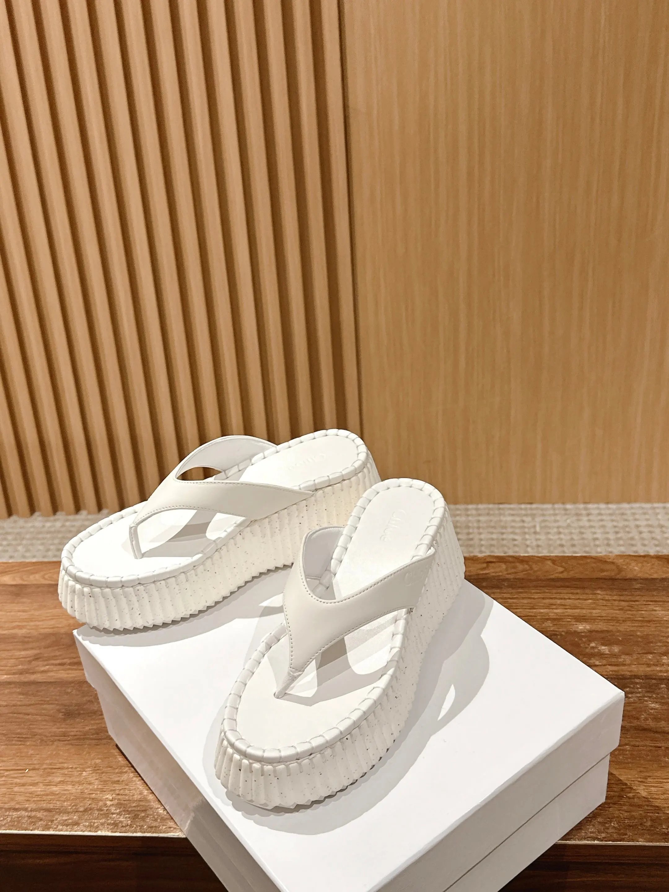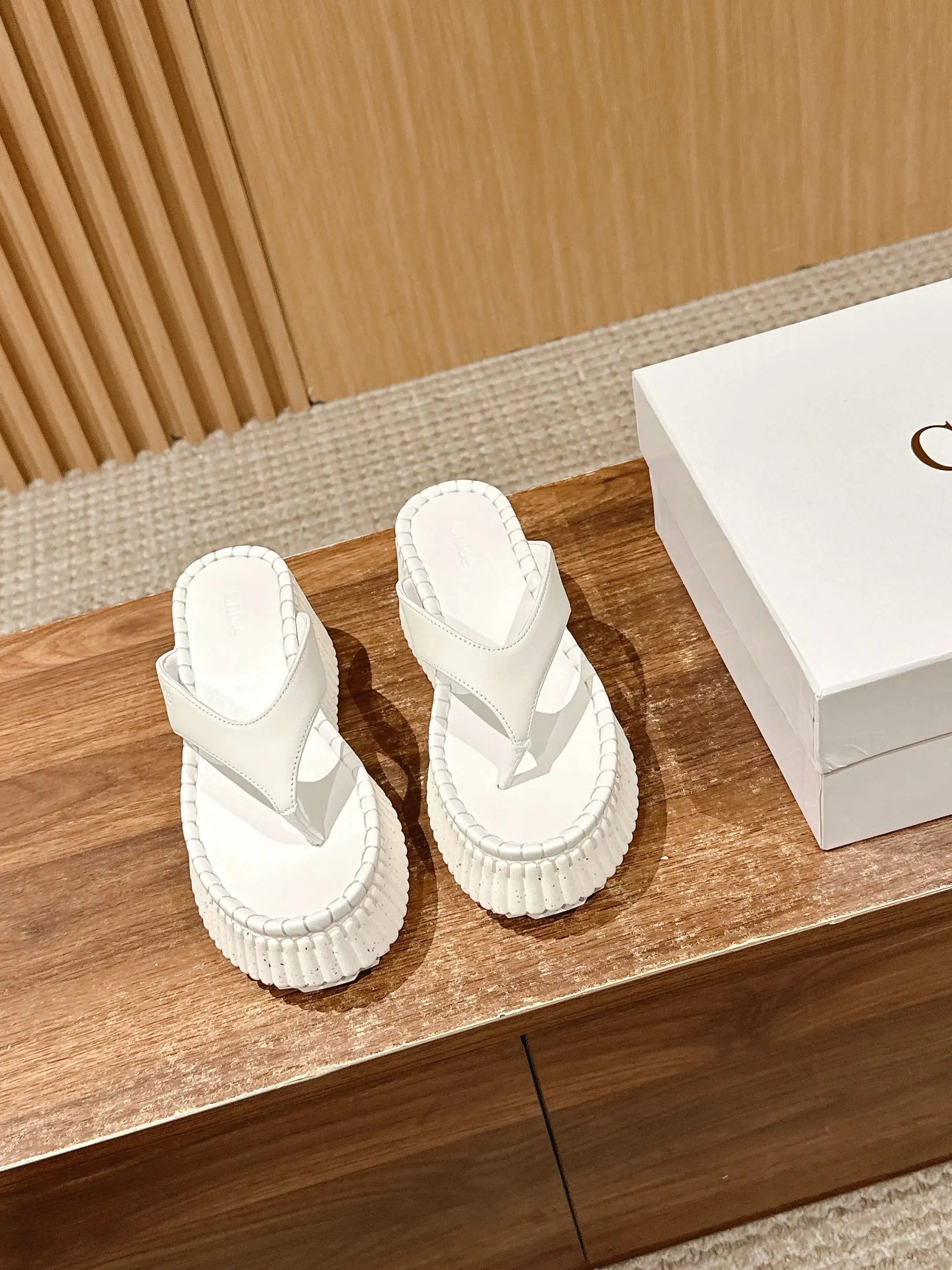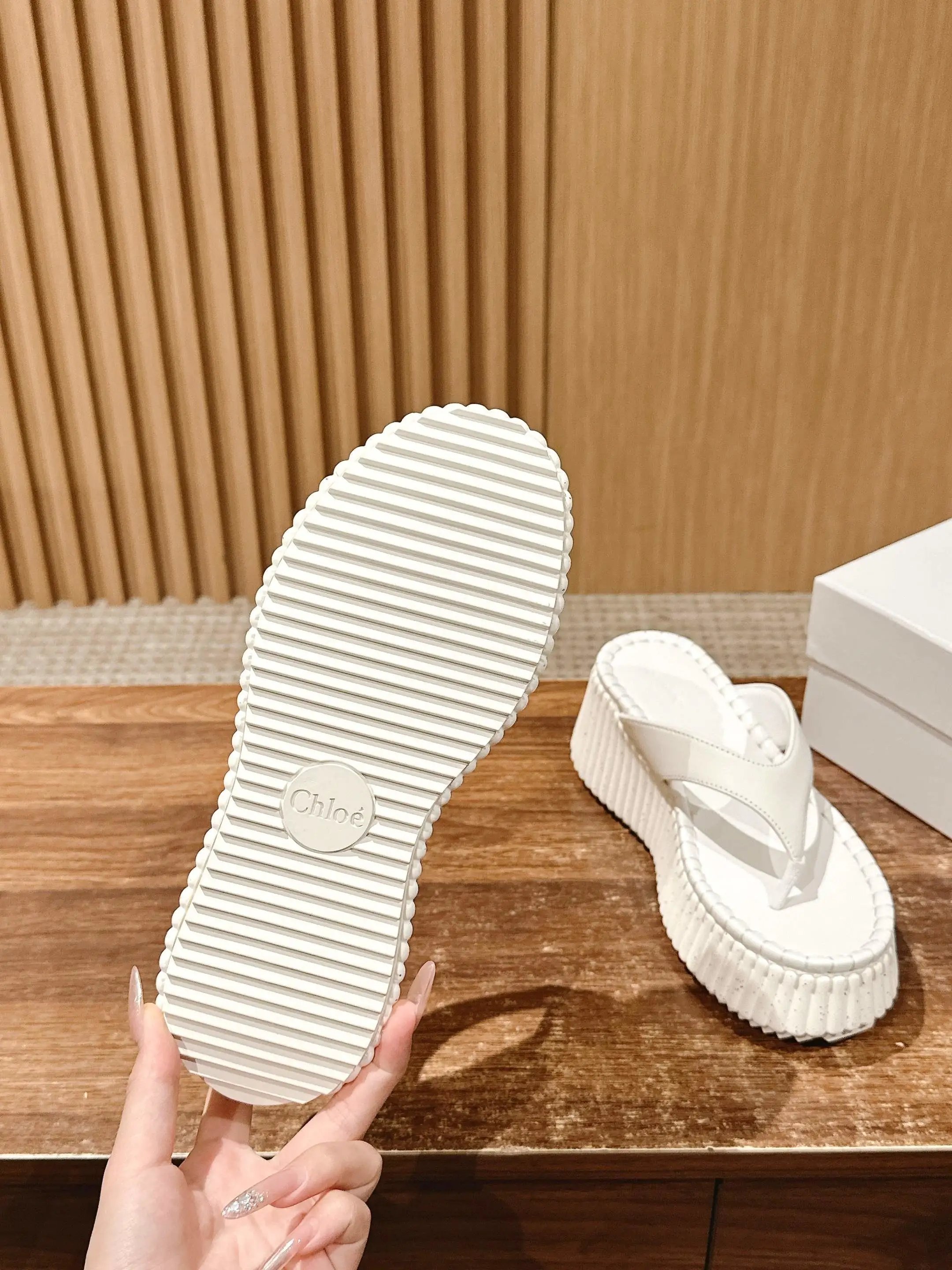 Chloe Nama calfskin platform wedge flip flops join the star-loved Nana line.