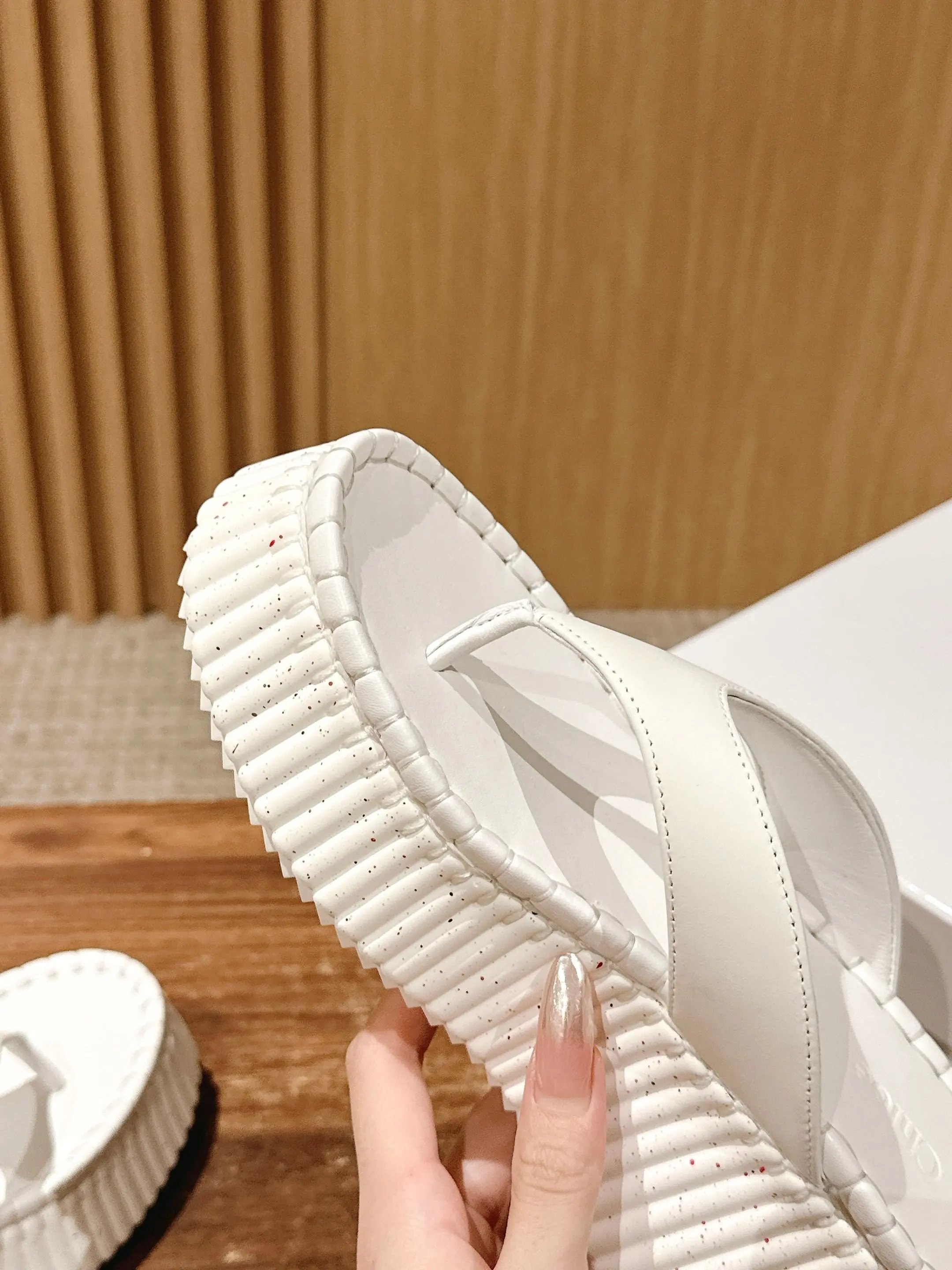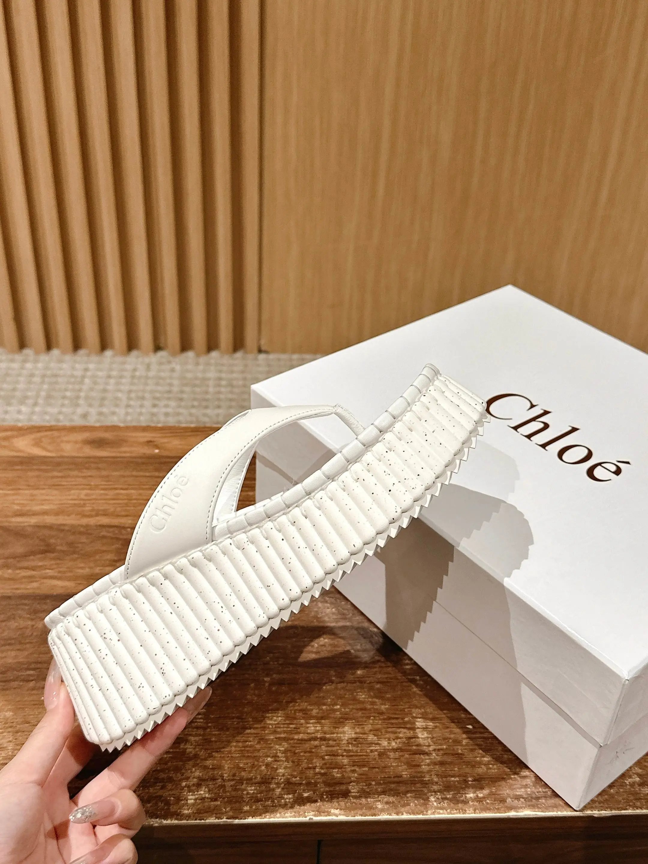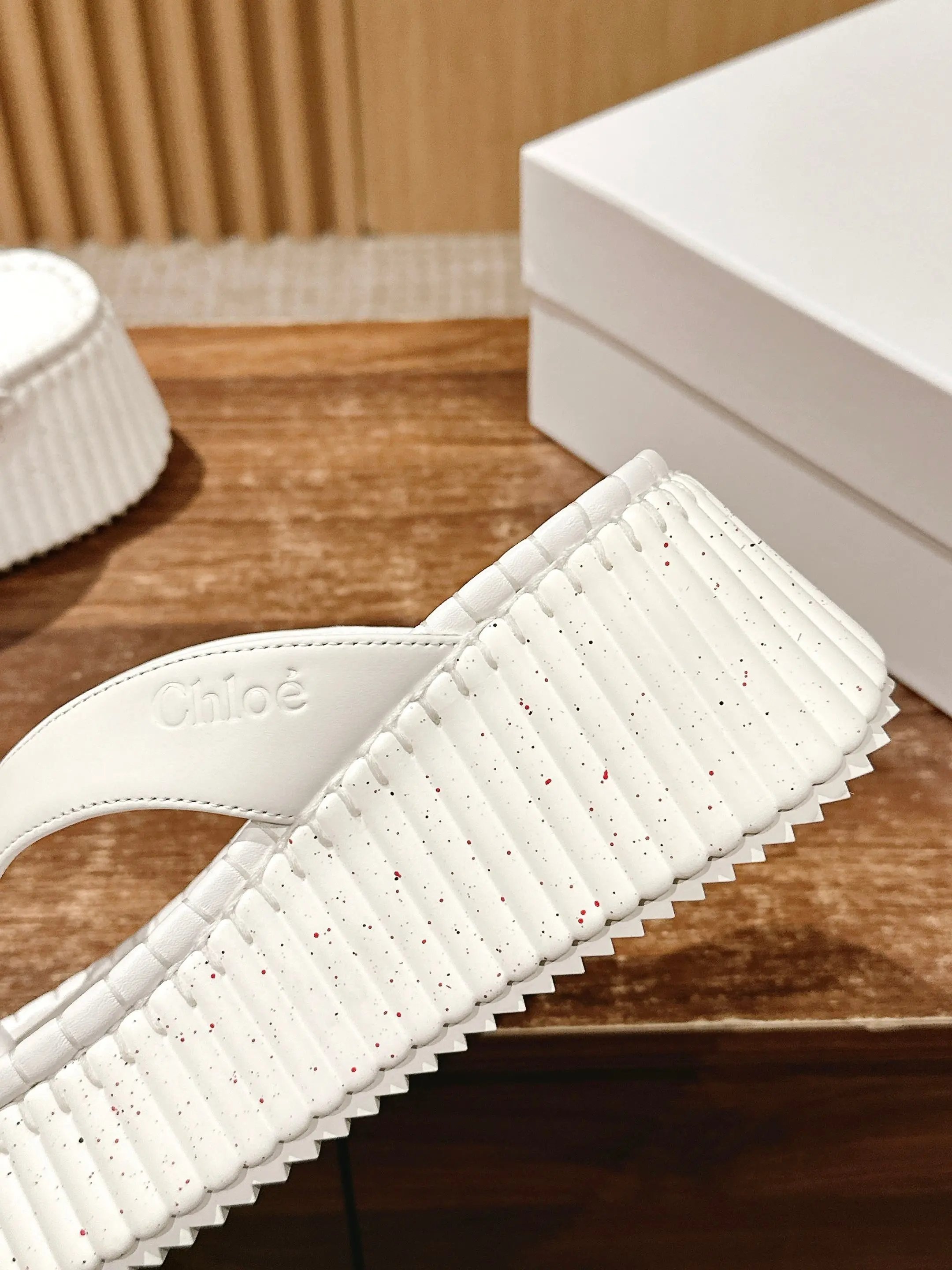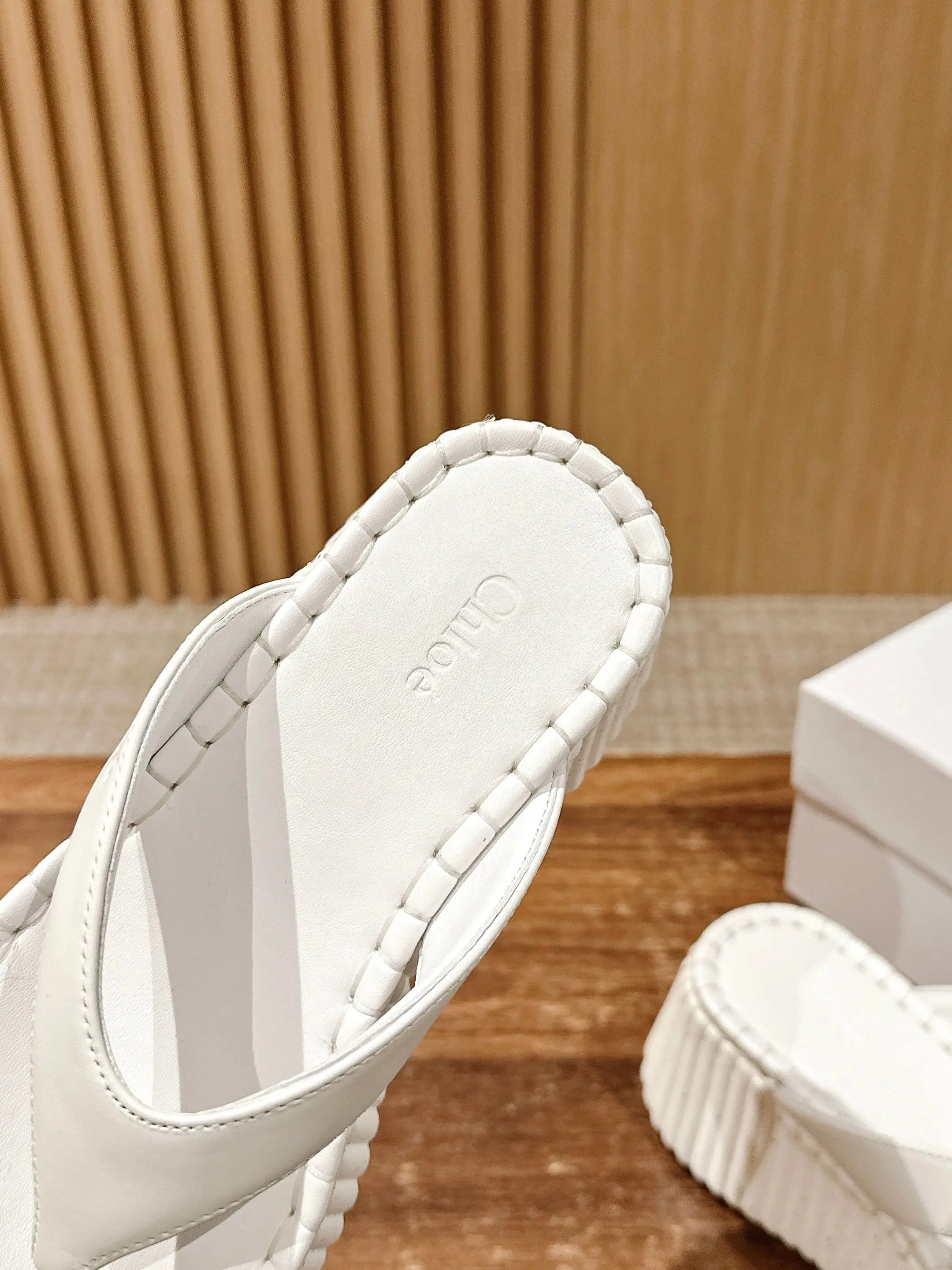 8cm thick sole, soft cushion calfskin upper/sole, subtle Chloe logo, textured sole & felt stitching.