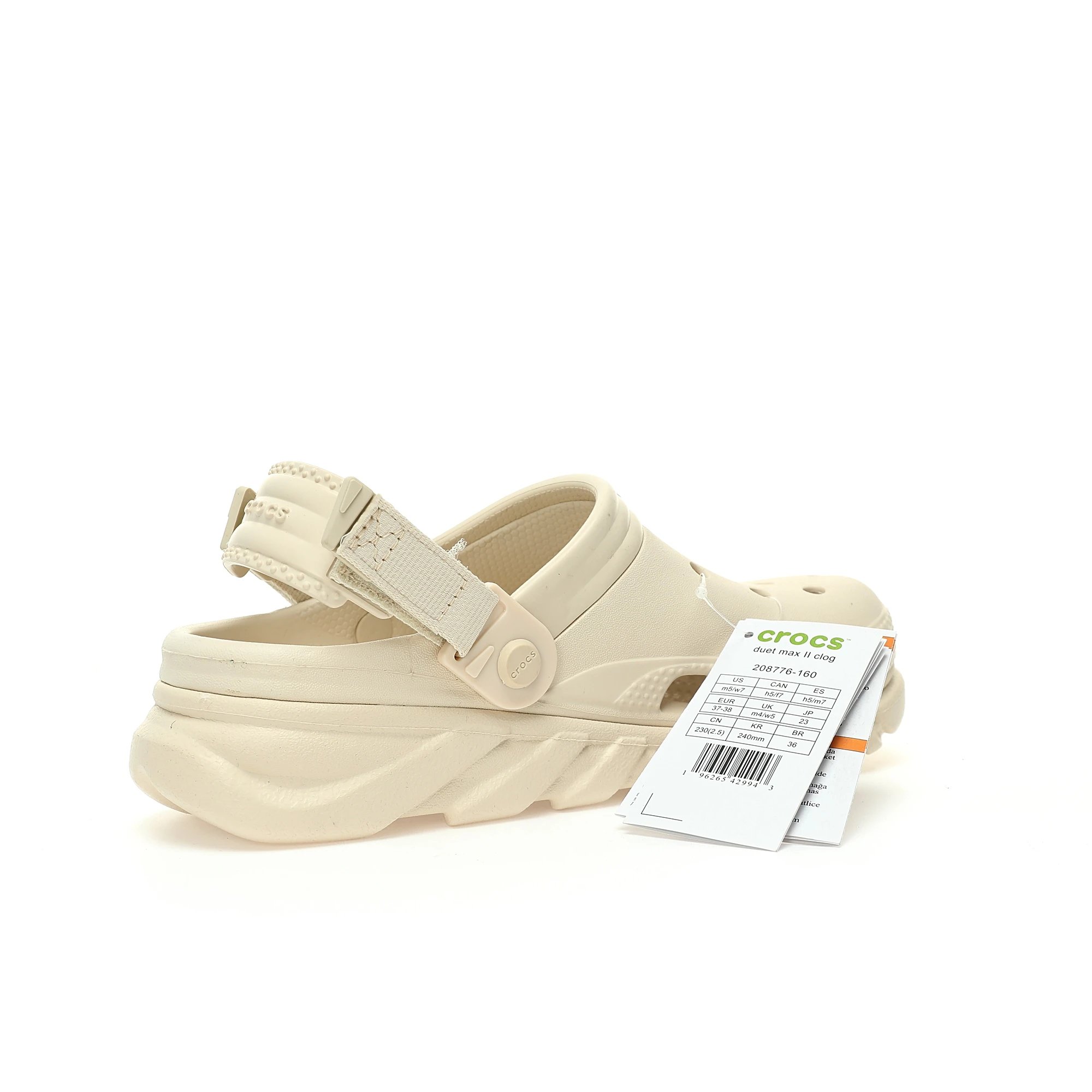 Crocs Duet Max II 2 Clog Sandals are unisex, eco-friendly EVA (95% injection + 5% foam) with 4cm lift, TPU anti-slip sole, 2-in-1 design.