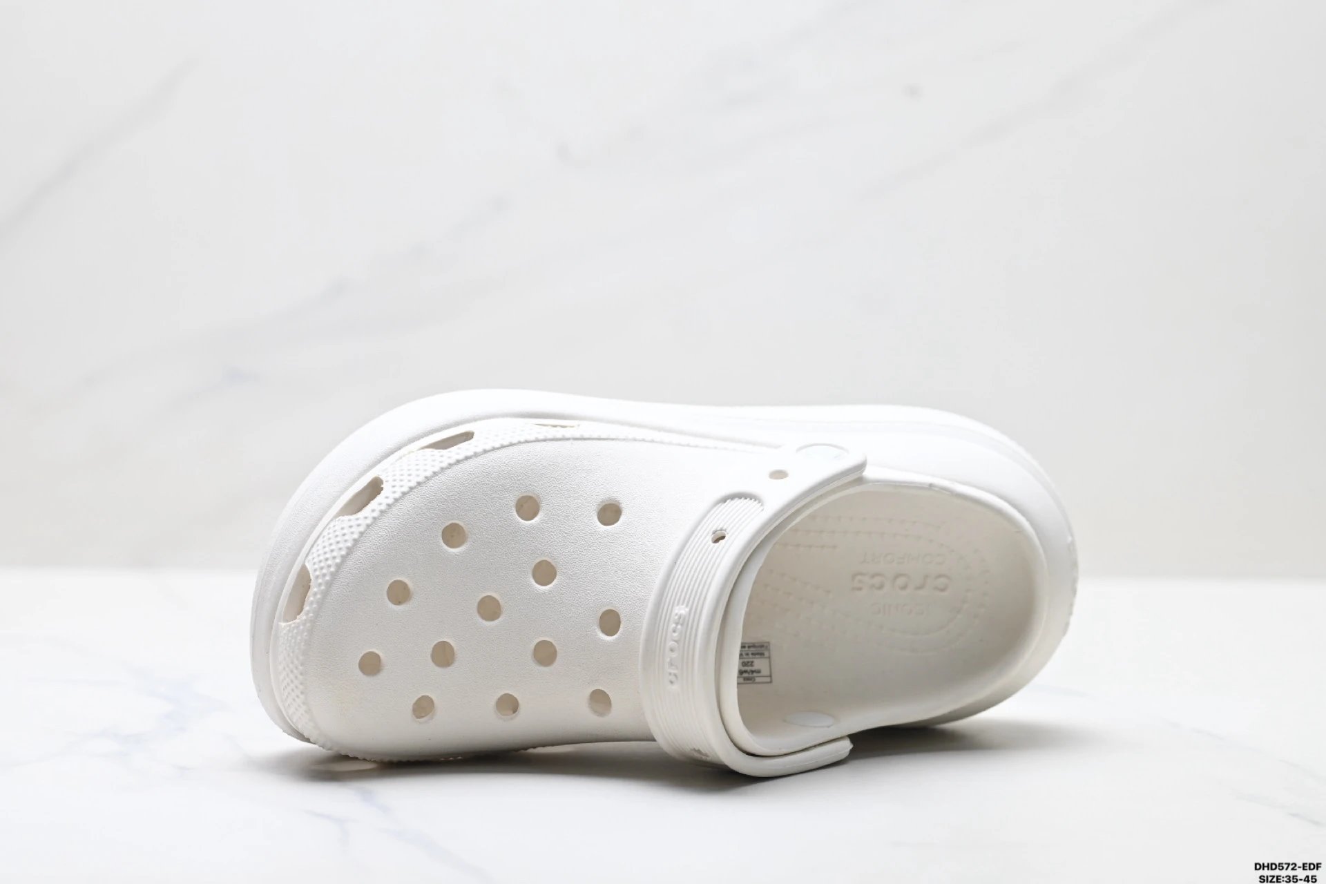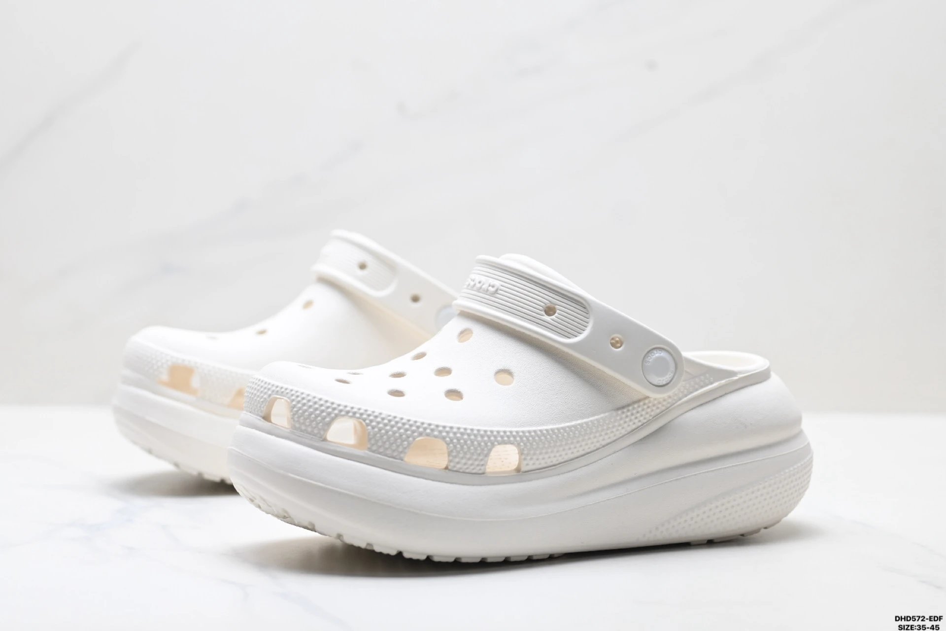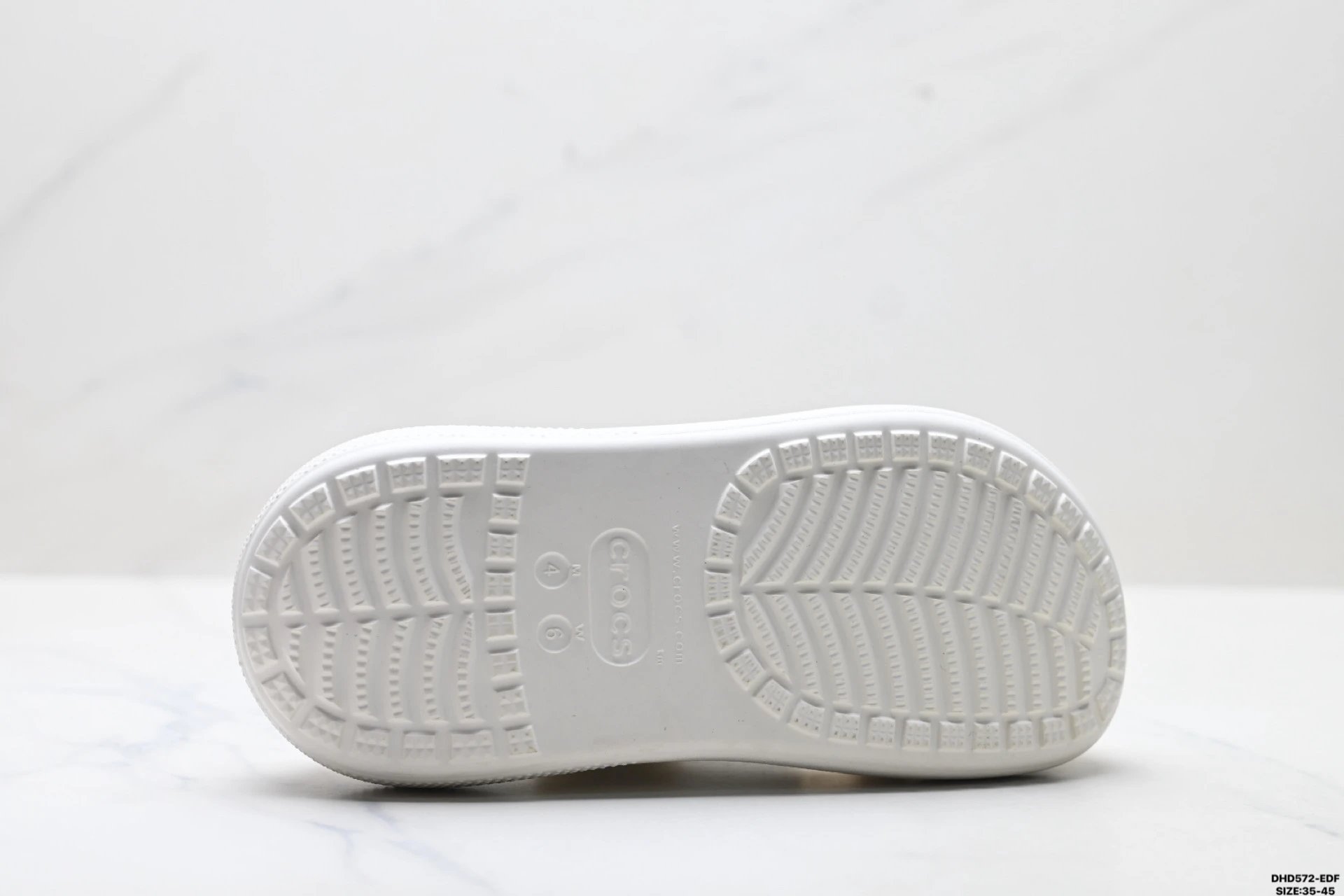 Croslite (closed-cell resin) adapts to foot shape via body heat, offering light cushioning, easy cleaning & strong grip.