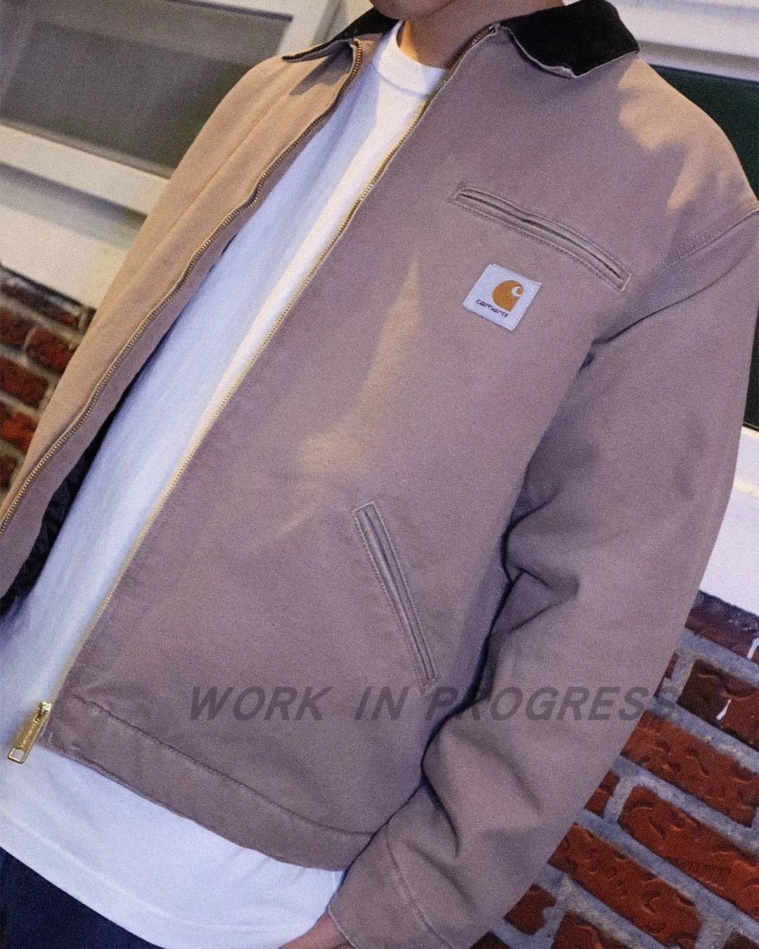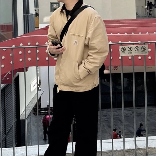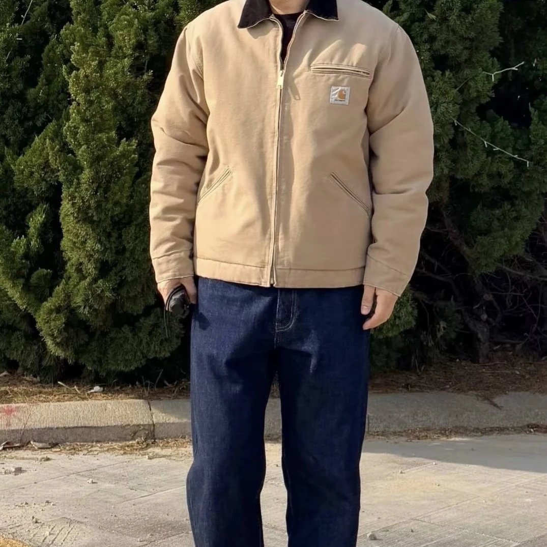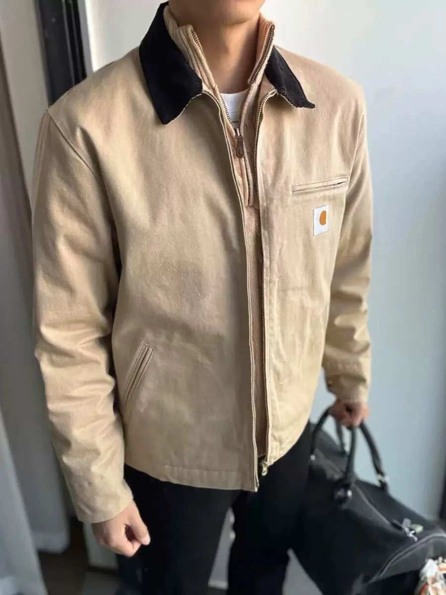 Carhartt Detroit Beige Canvas Heavy Work Jacket uses premium dense cotton canvas, enzyme-washed for slight seam fading.