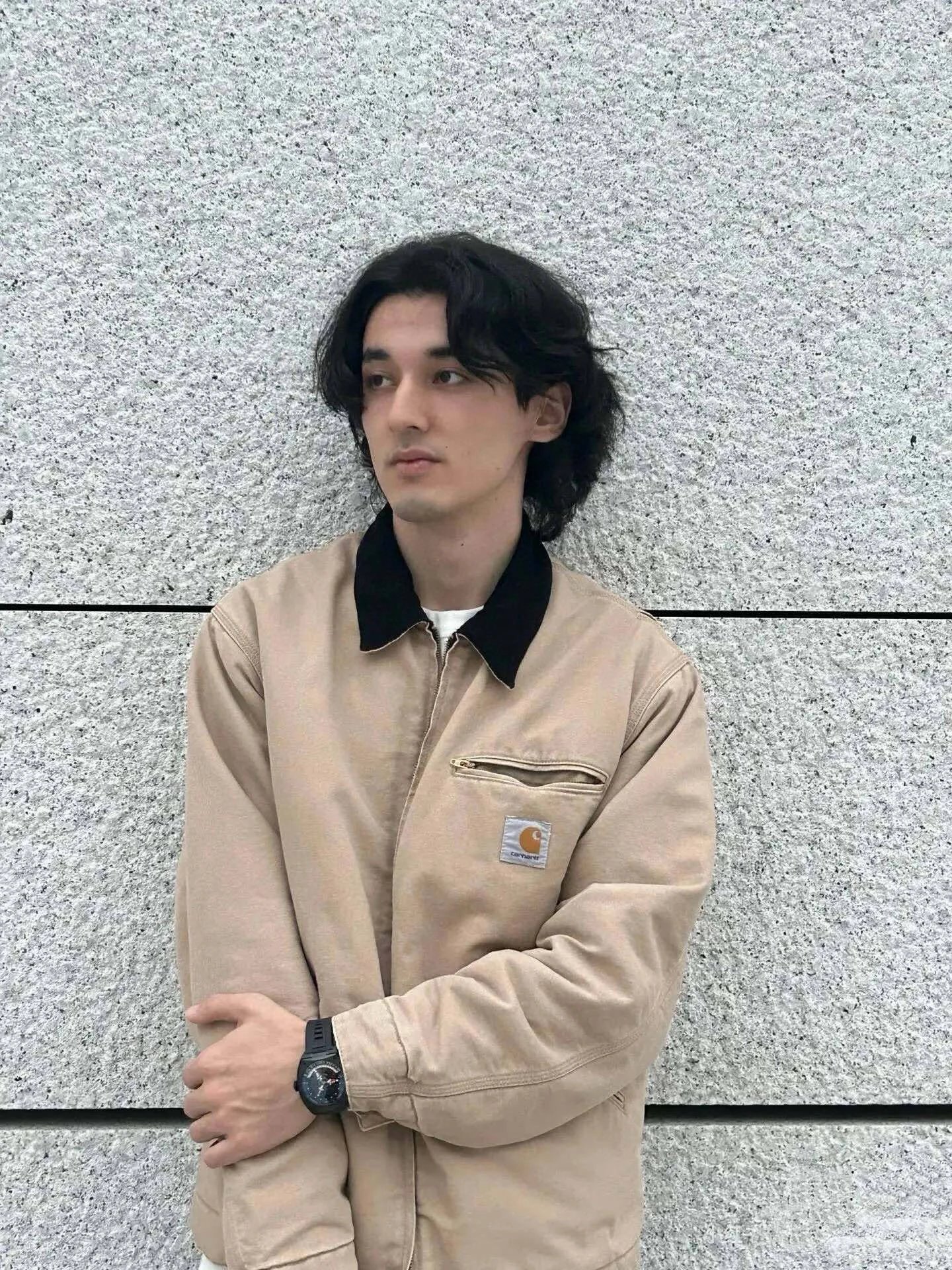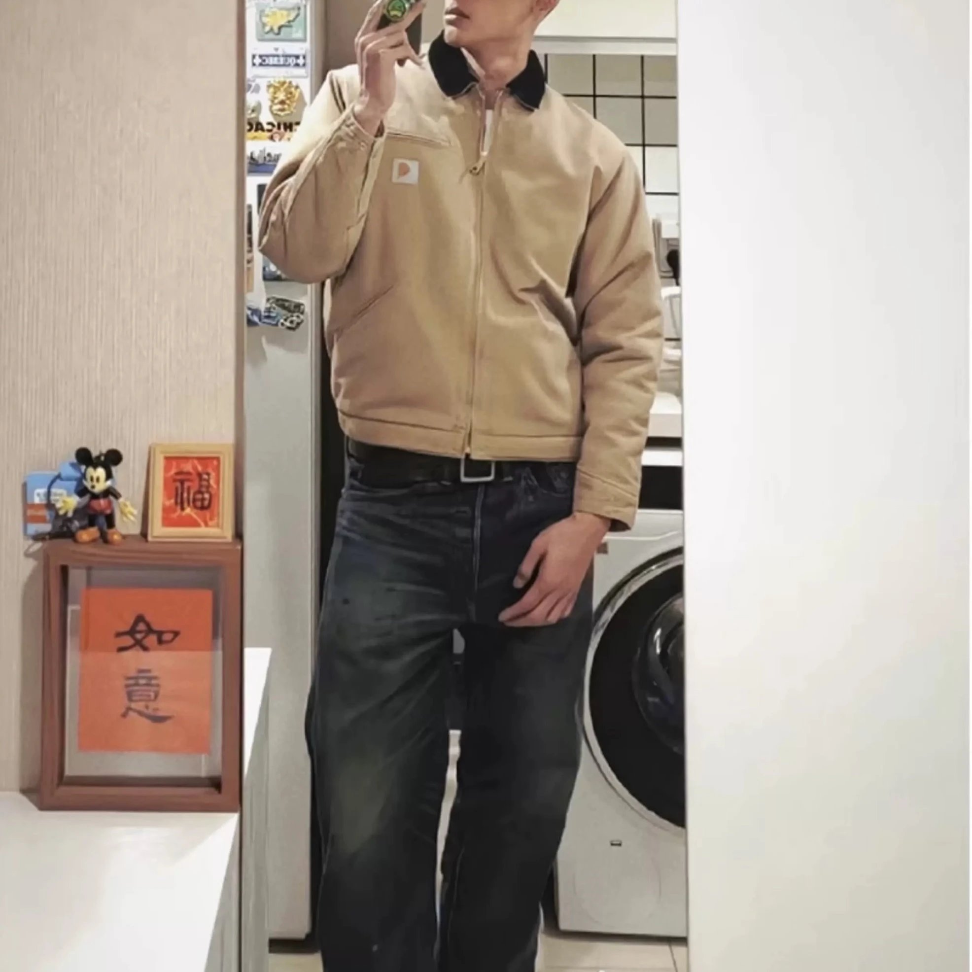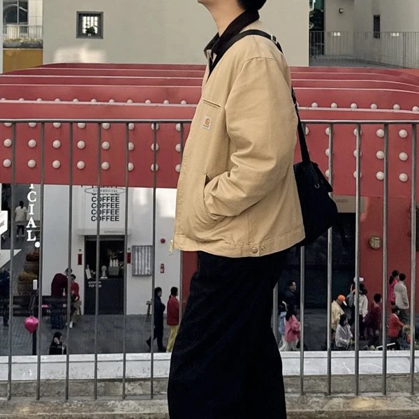 Carhartt Detroit Beige Canvas Heavy Work Jacket uses premium dense cotton canvas, enzyme-washed for slight seam fading.