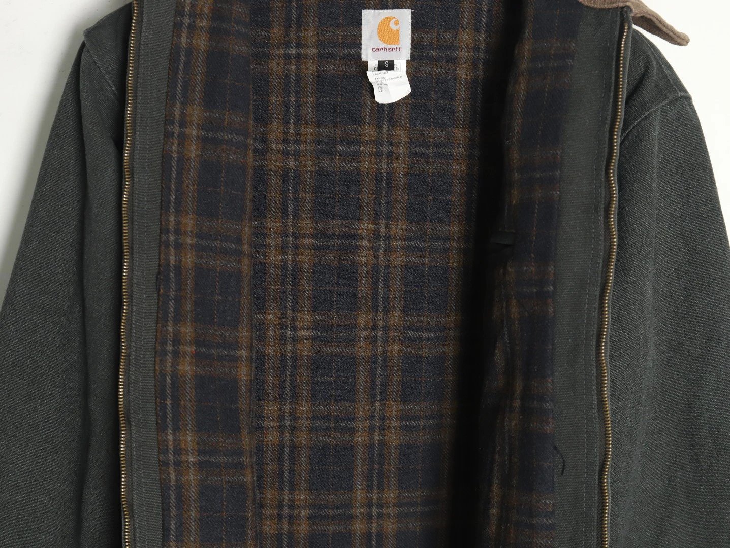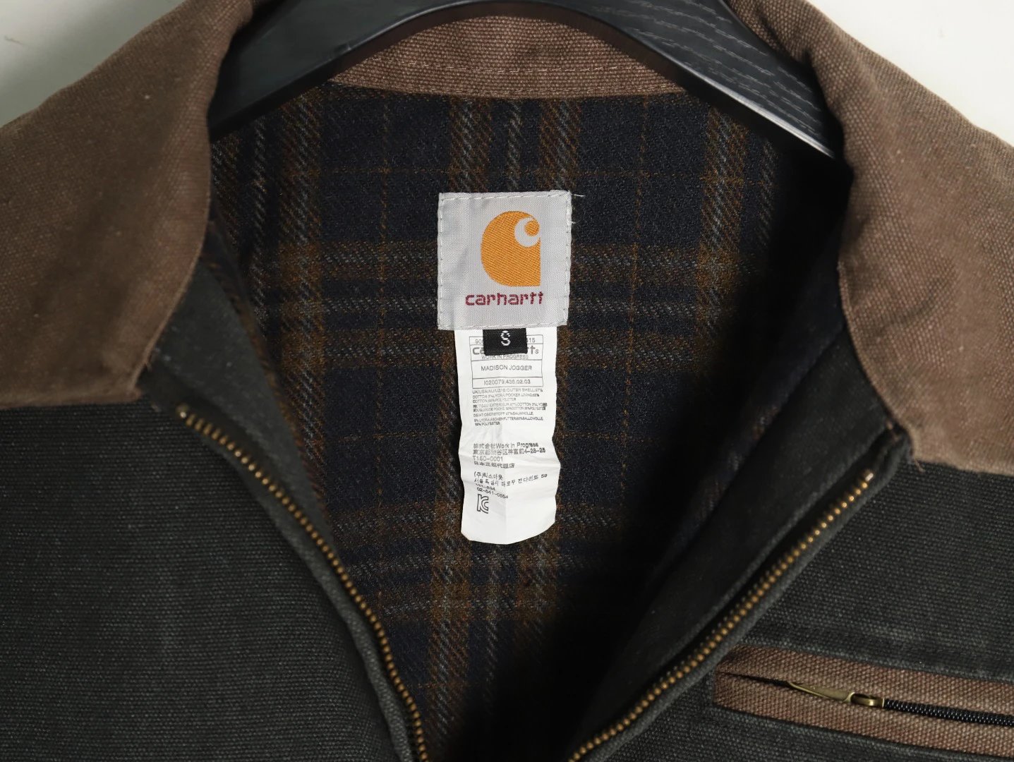 Carhartt 24FW J97 work jacket uses thick canvas (15oz+) with 30% wool lining for extra warmth.