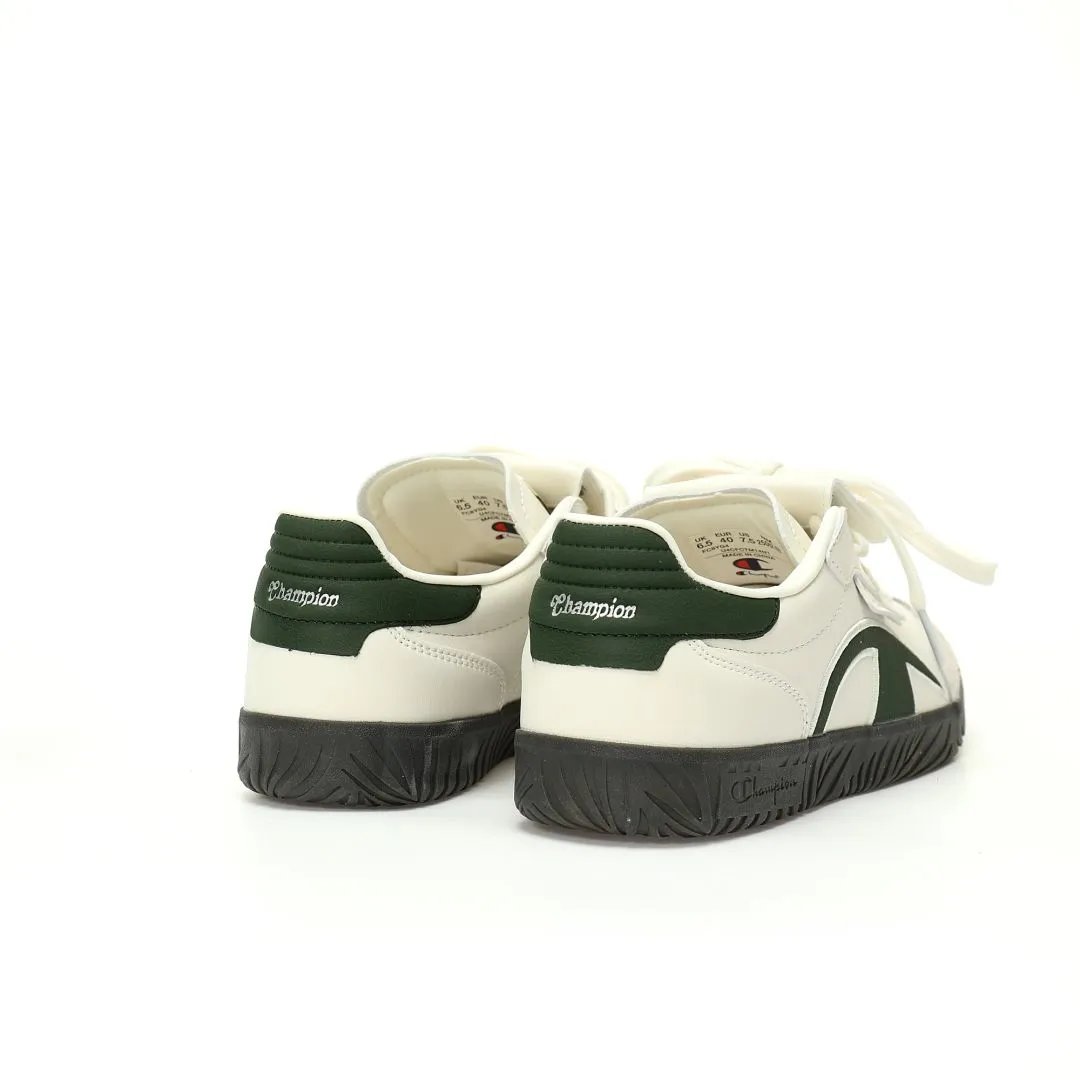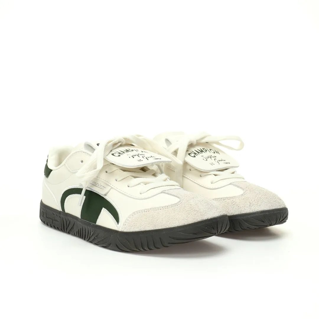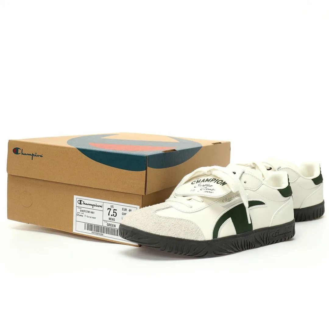 Champion TTrainer Men's Low-Top Sneakers feature leather beige dark green upper, eco-friendly sea glass EVA insole & durable rubber outsole.