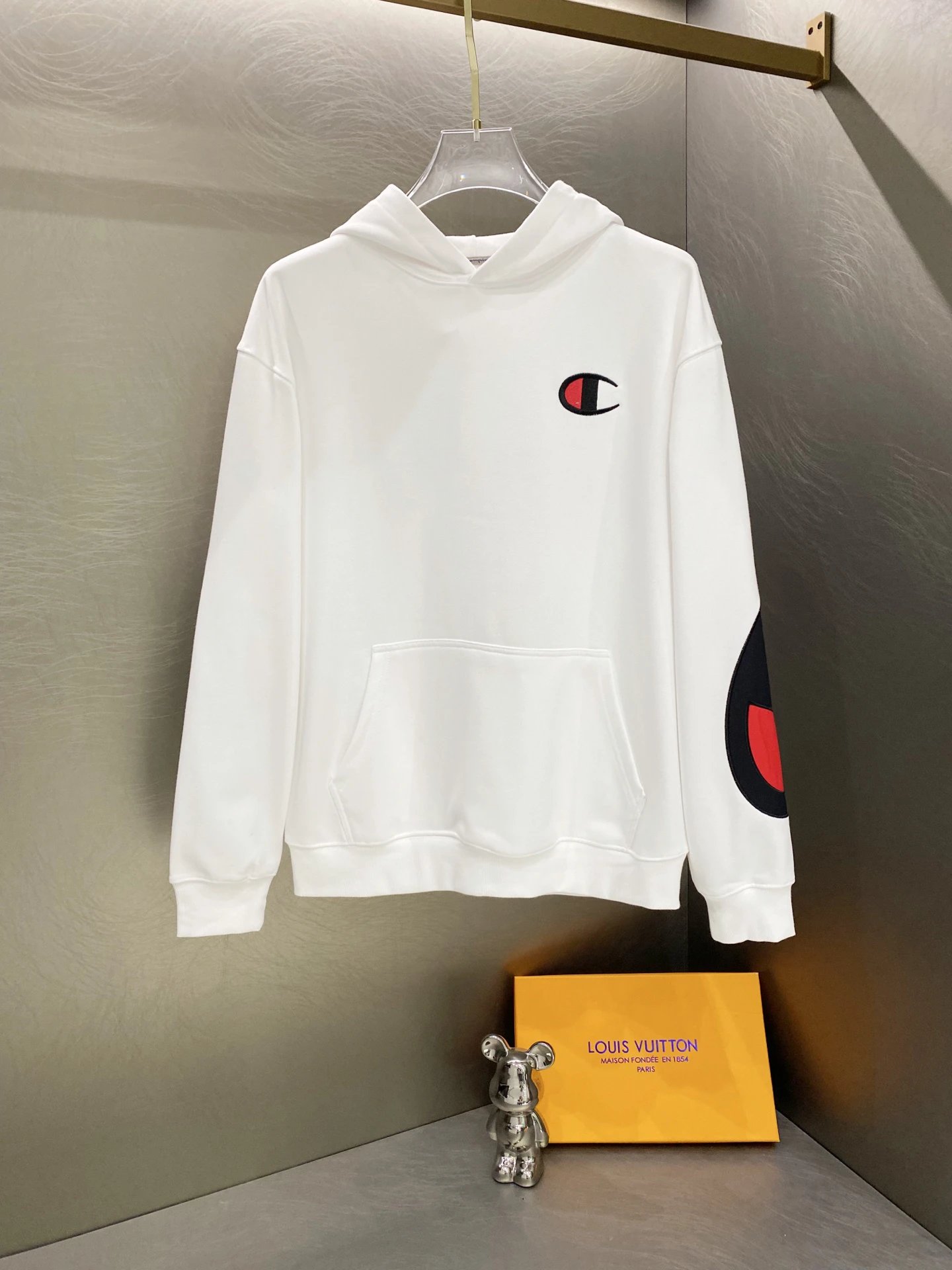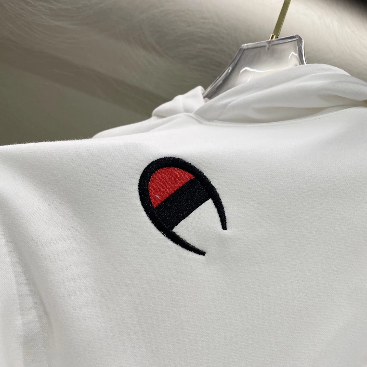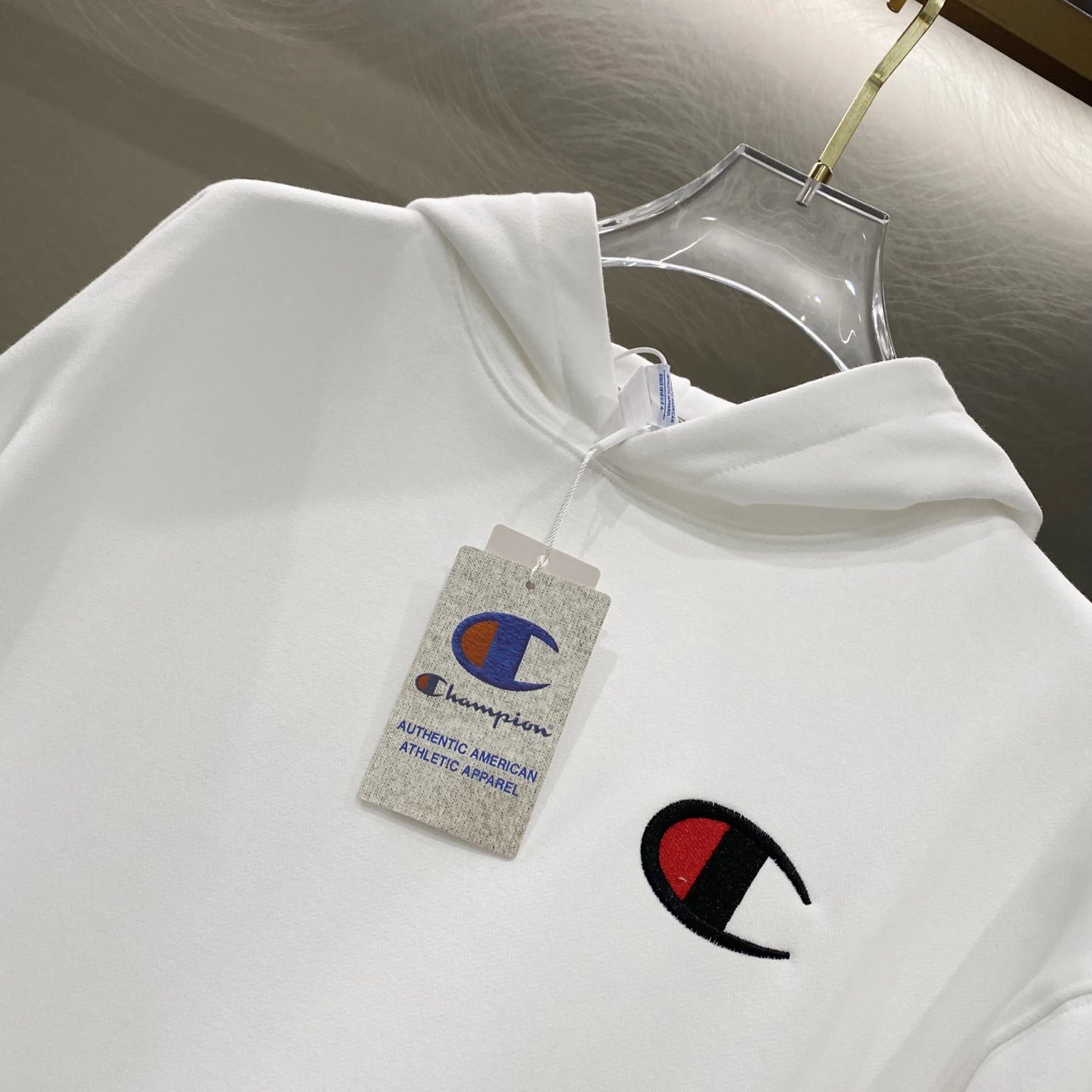 Champion Embroidered Letter Fleece Hoodie uses 480g high-weight fabric, unisex OS fit, embroidered arm logo.
