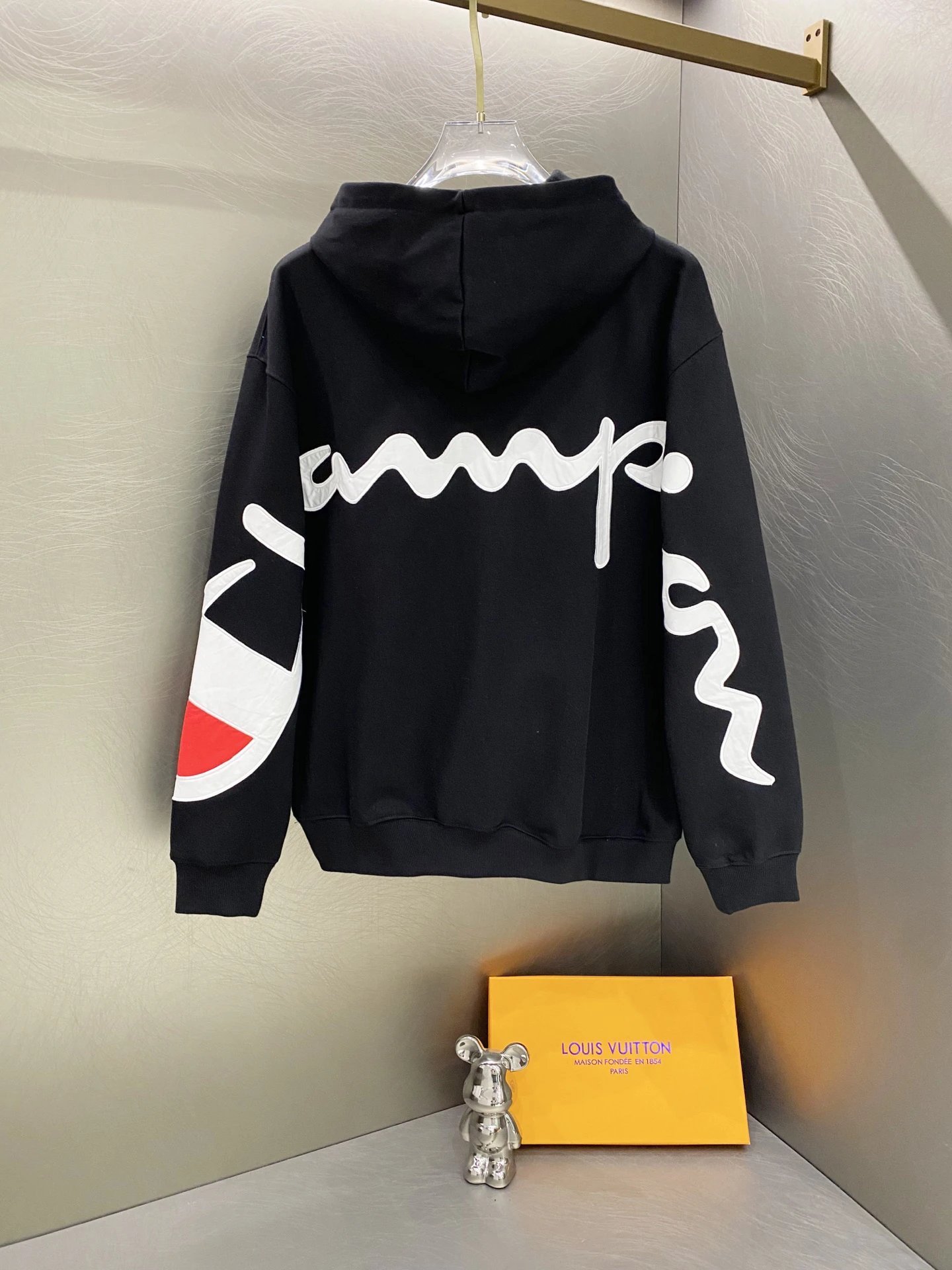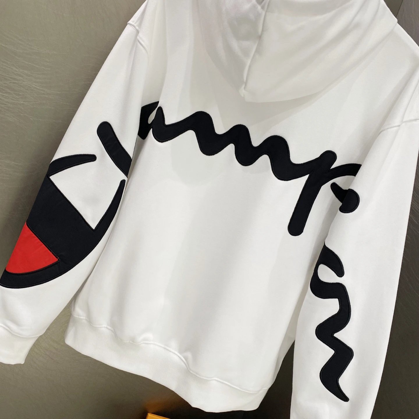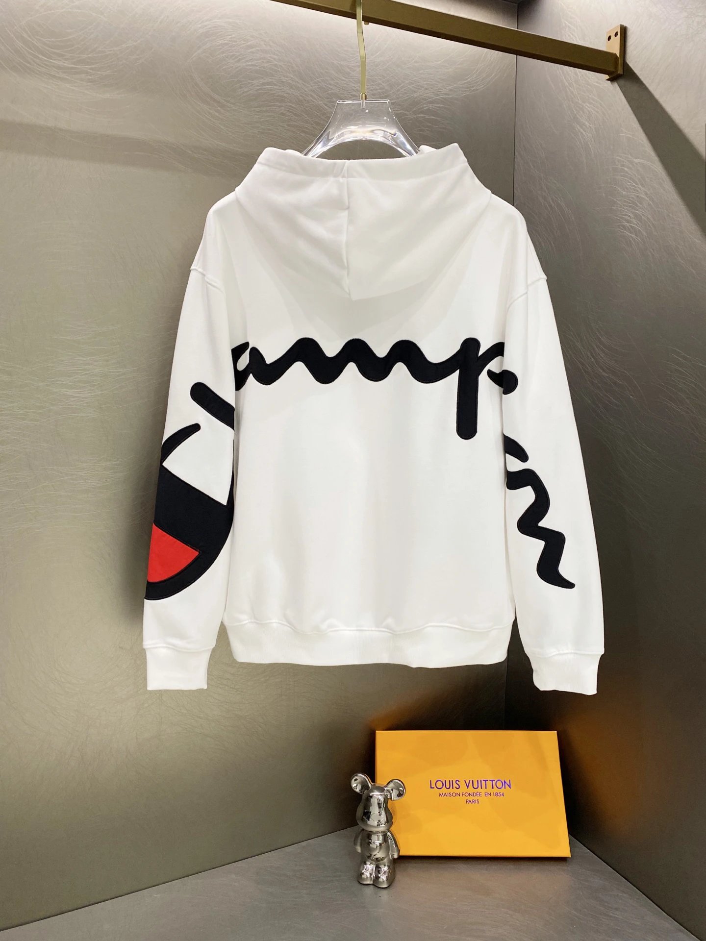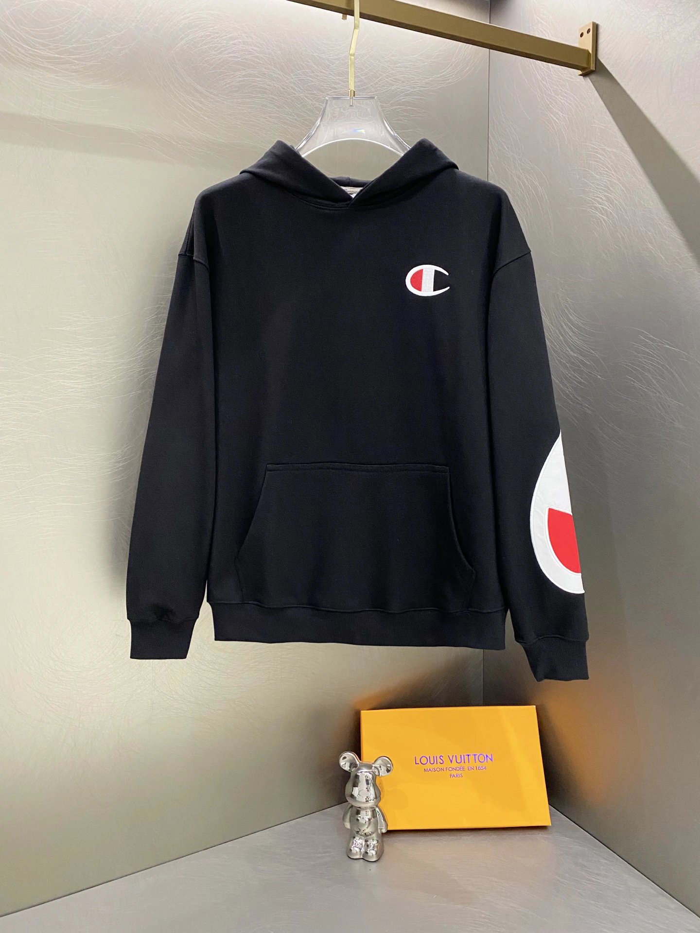 Champion Embroidered Letter Fleece Hoodie uses 480g high-weight fabric, unisex OS fit, embroidered arm logo.