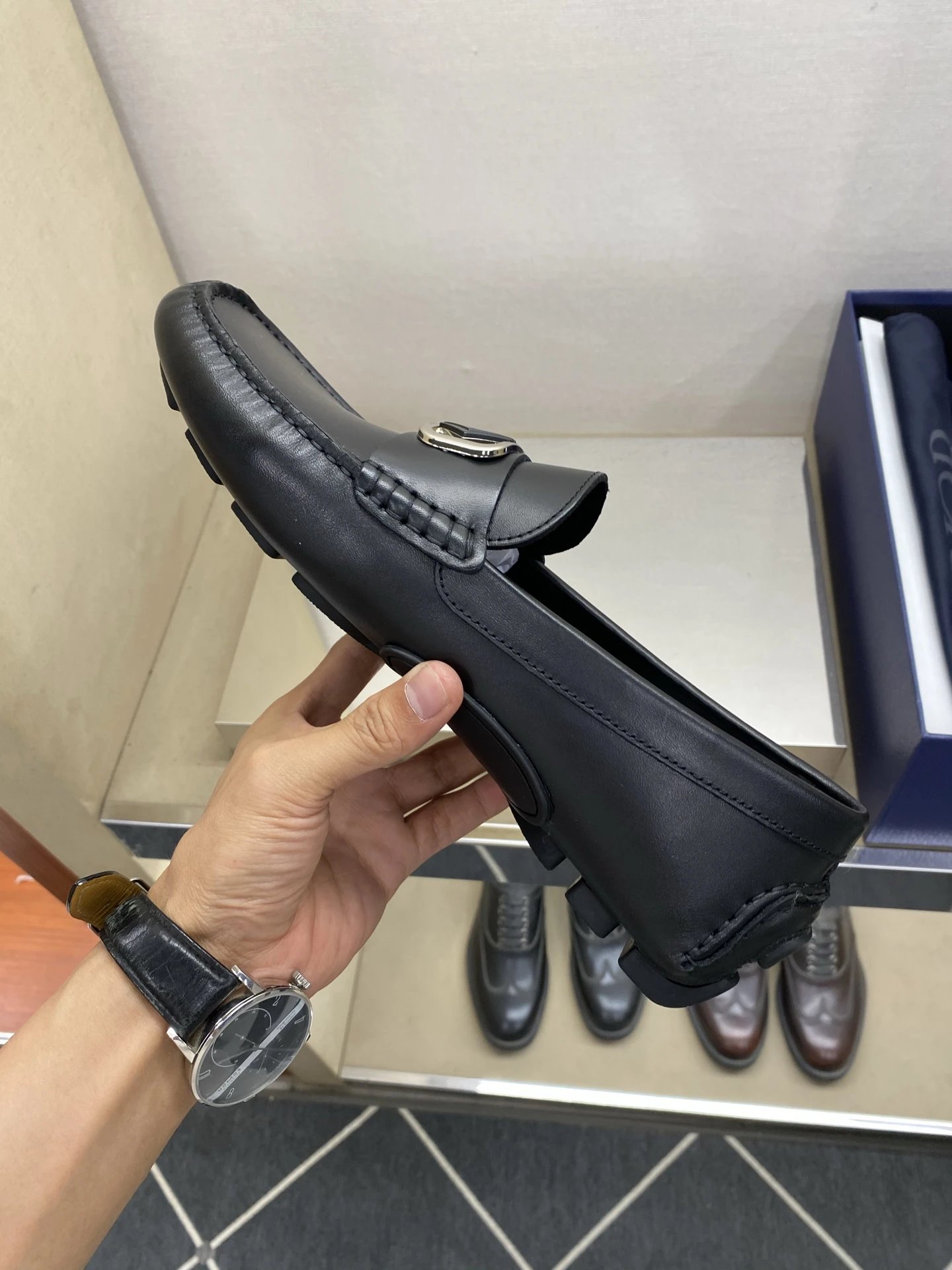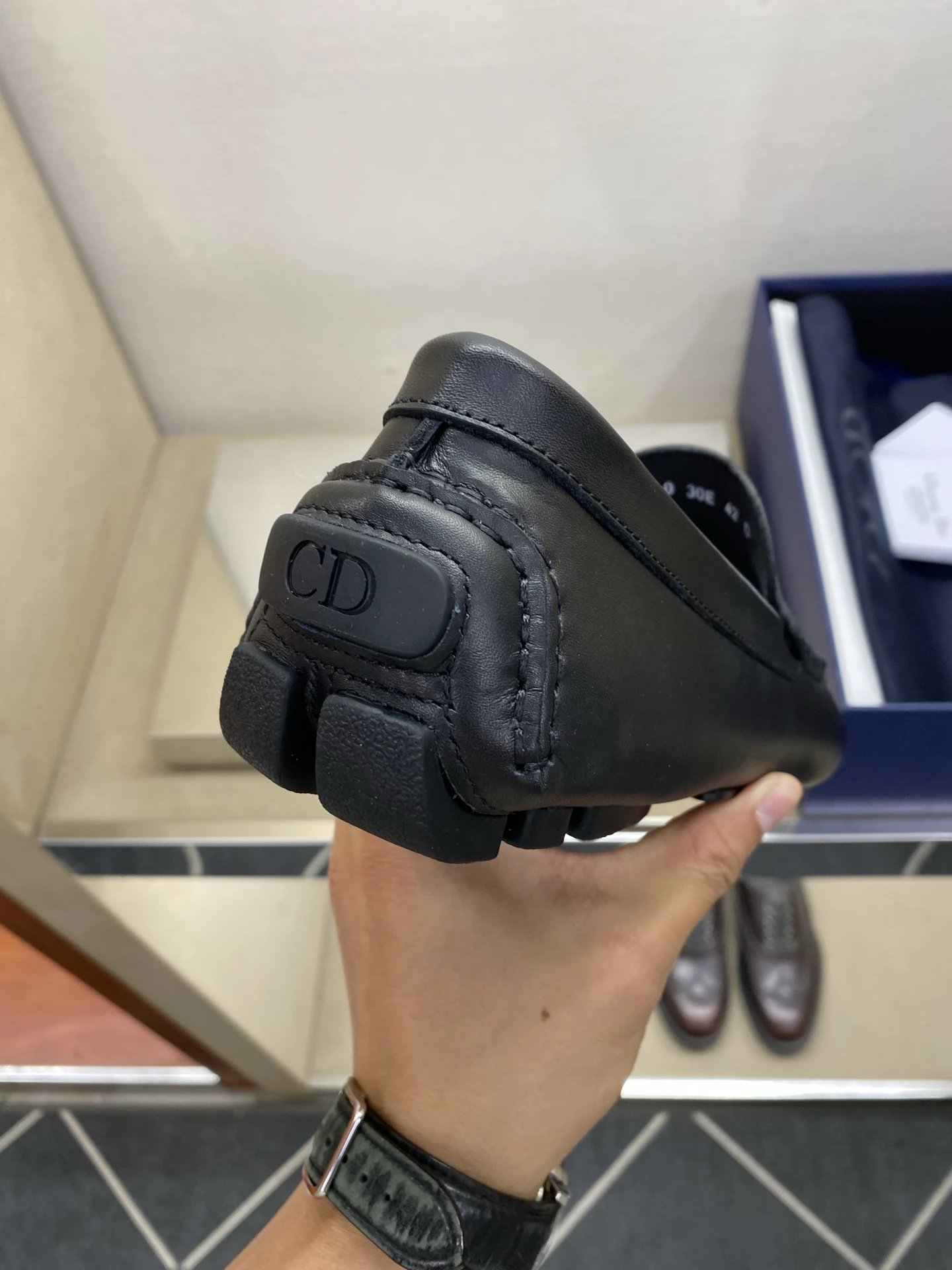 Made of grainy lychee-patterned calfskin, water-dyed lining & anti-slip pebble sole