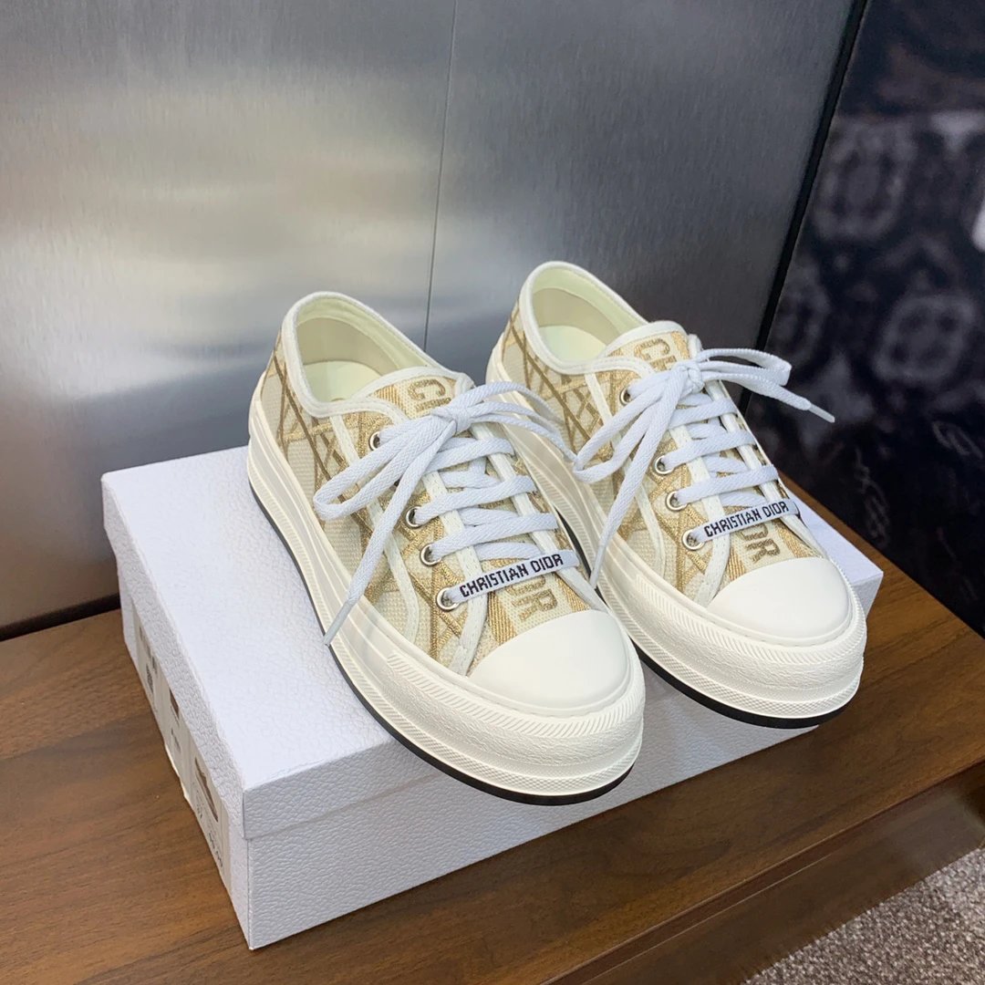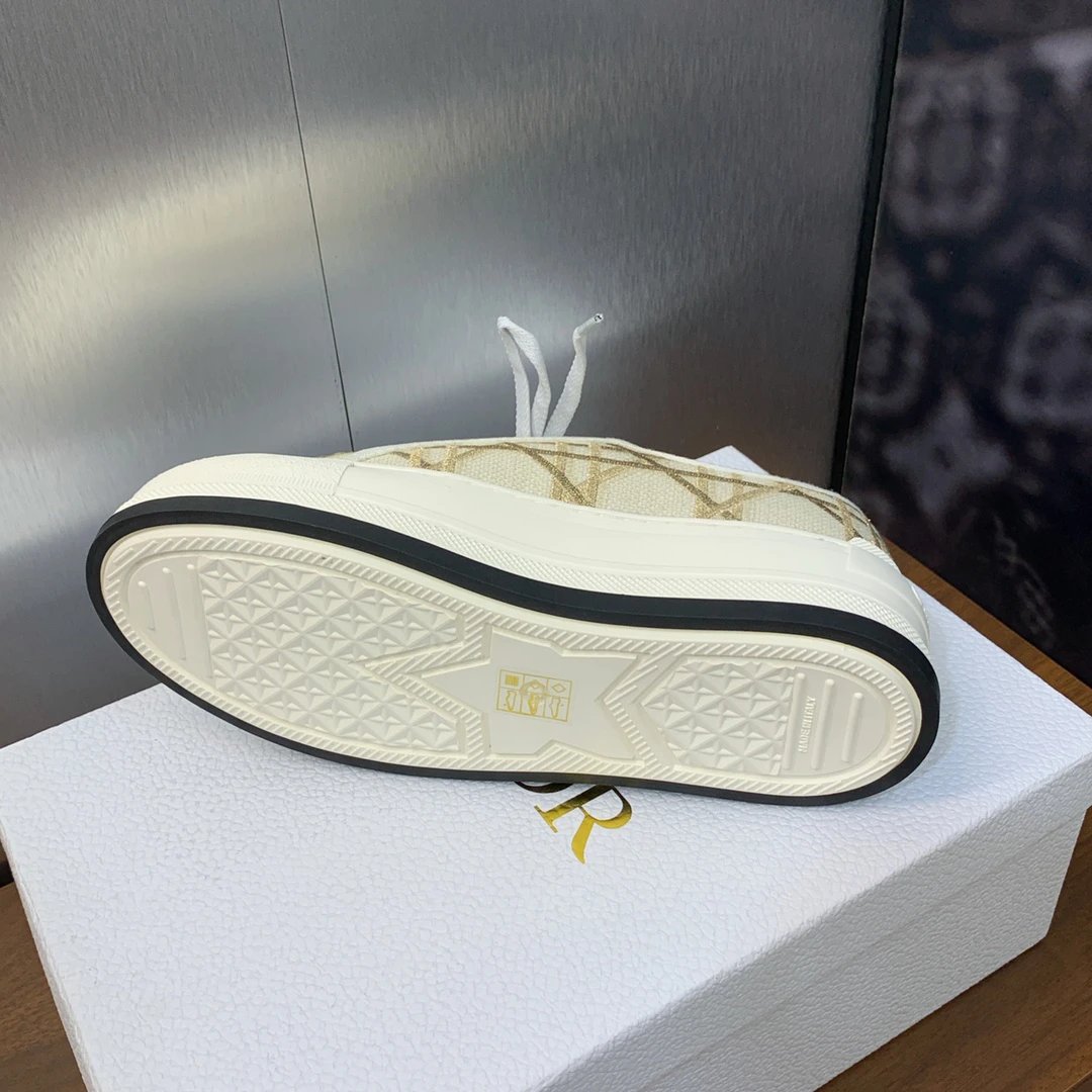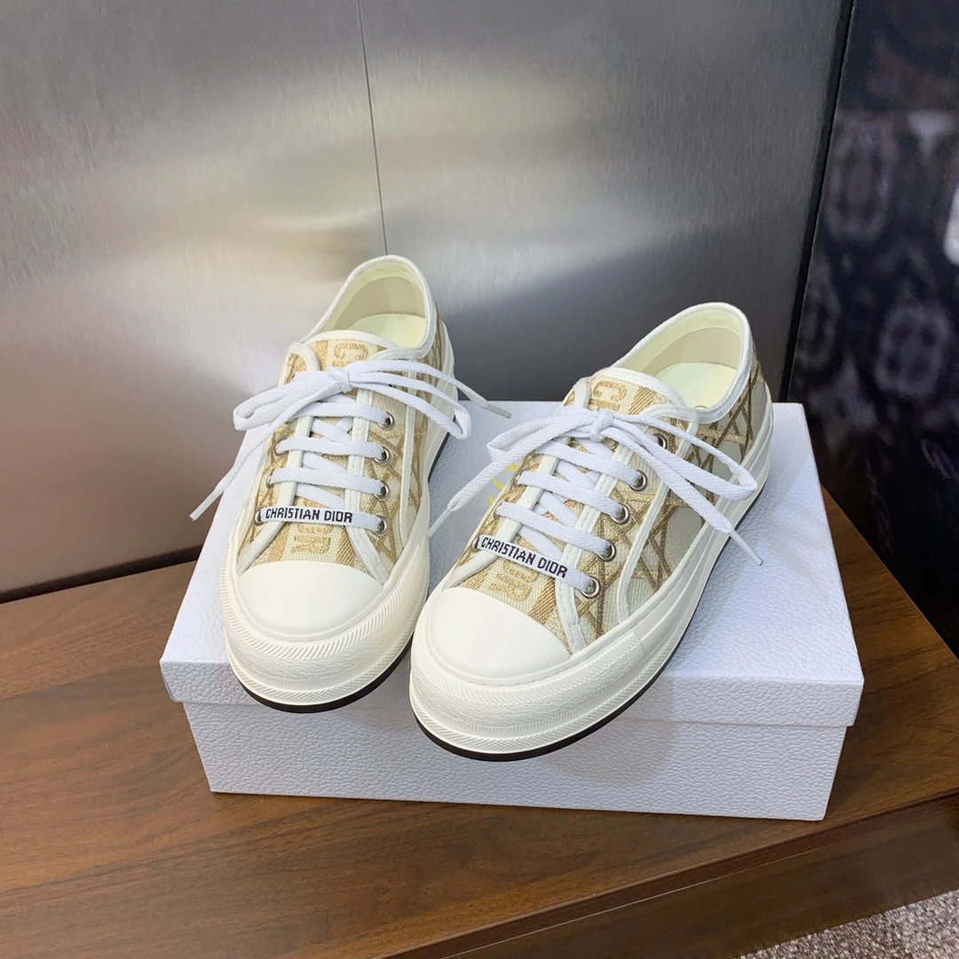 Dior 2023 Walk'n Dior Oblique Couple Thick-Sole Low Sneakers feature oblique jacquard embroidery, multicolor canvas upper, water-dyed sheepskin lining, elastic logo foam insole, original T outsole.