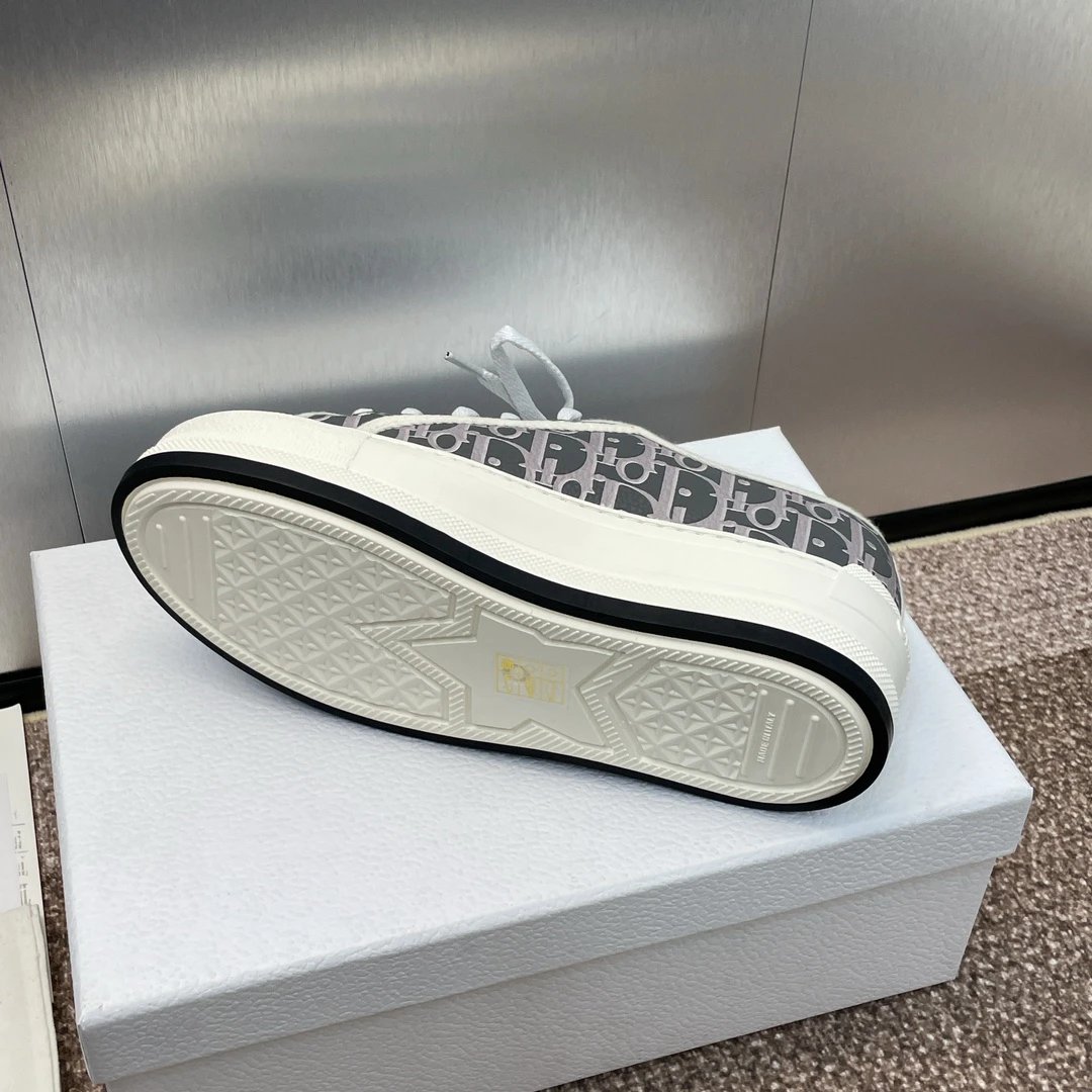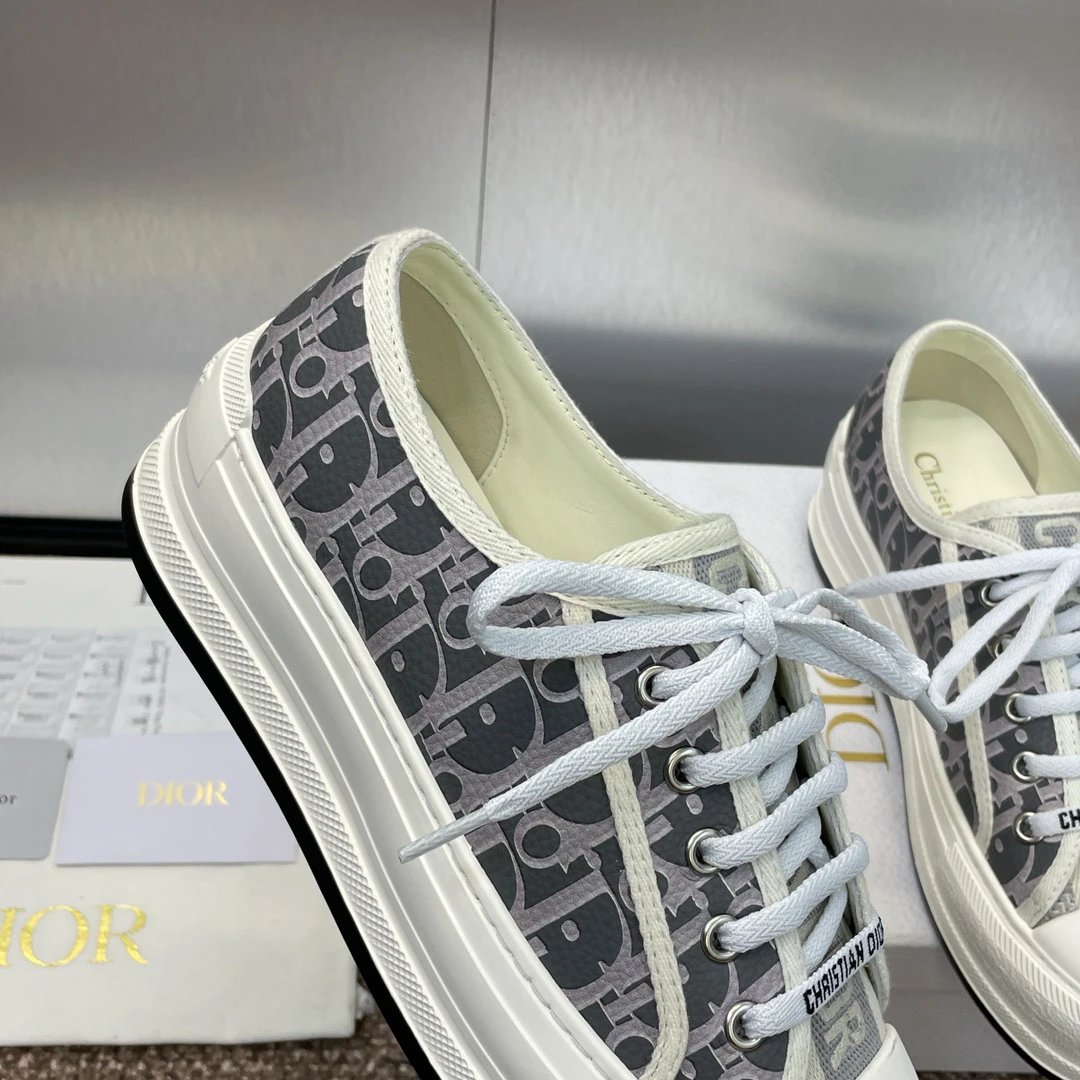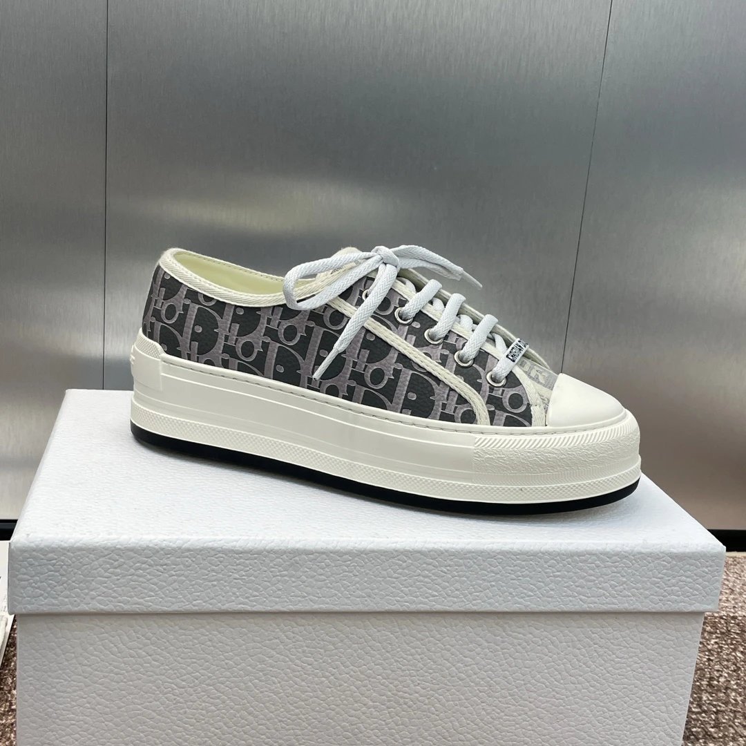 Dior 2023 Early Spring Couples Thick Sole Lace-Up Low-Top Sneakers Walk’n Dior Oblique have dark floral logo embroidery on canvas.