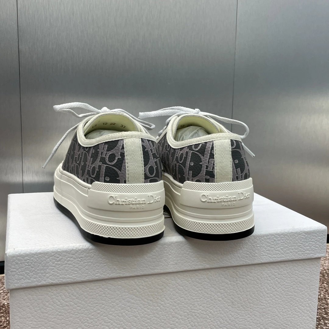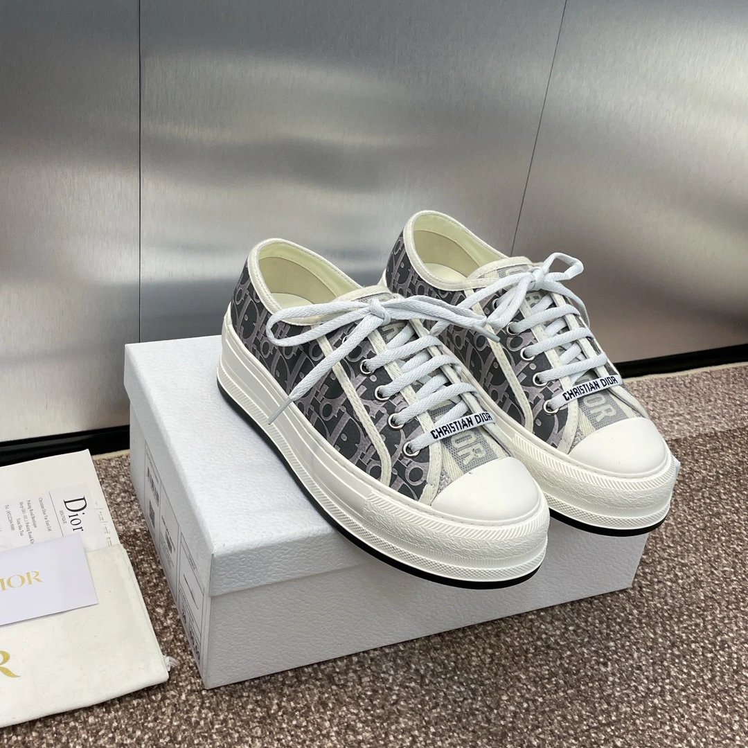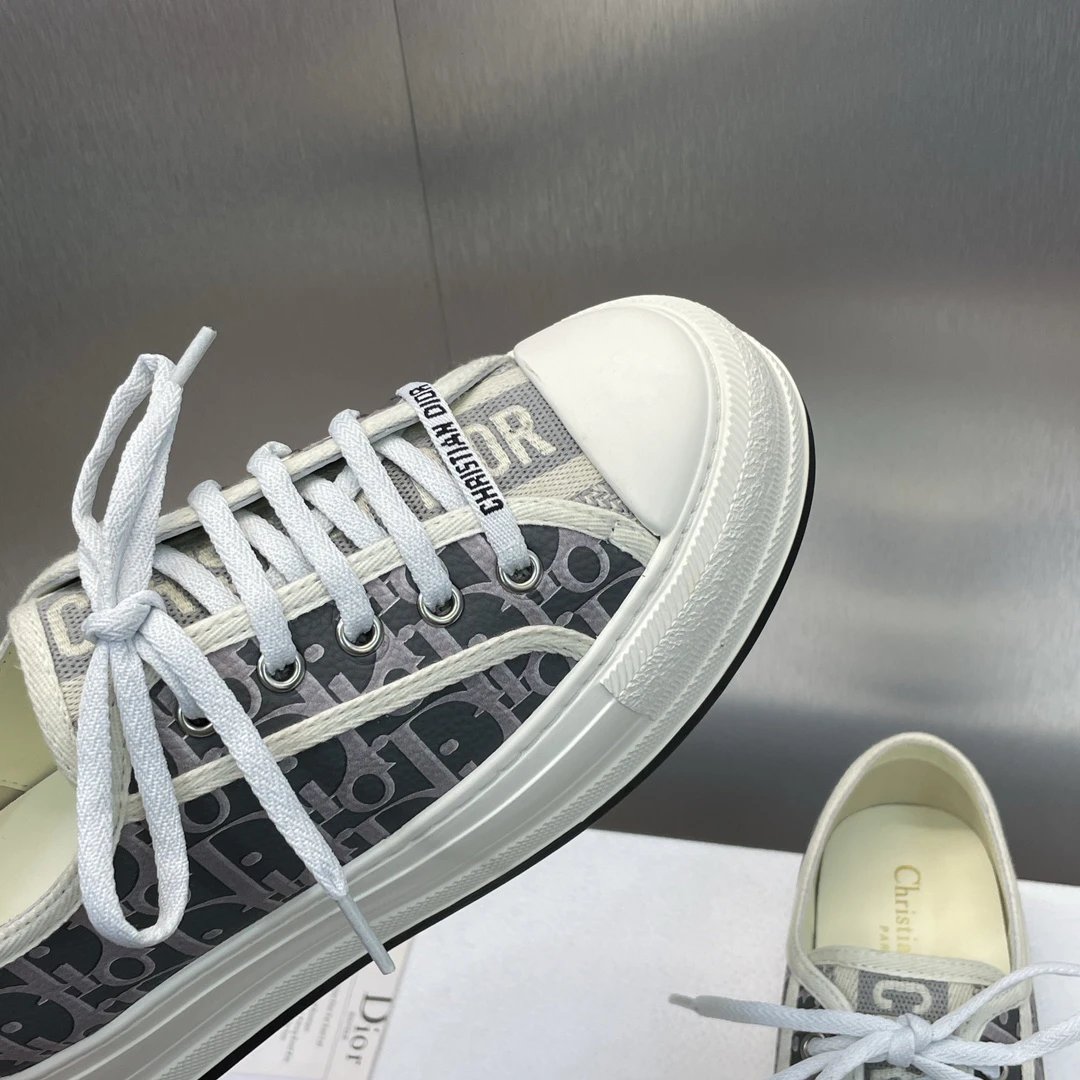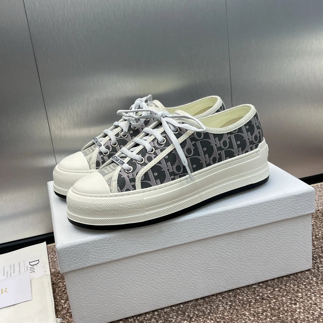 Dior 2023 Early Spring Couples Thick Sole Lace-Up Low-Top Sneakers Walk’n Dior Oblique have dark floral logo embroidery on canvas.