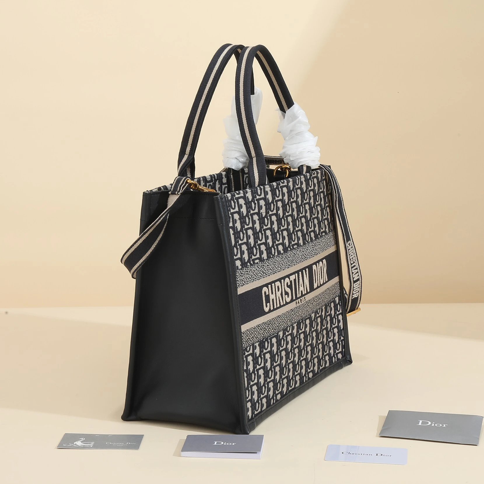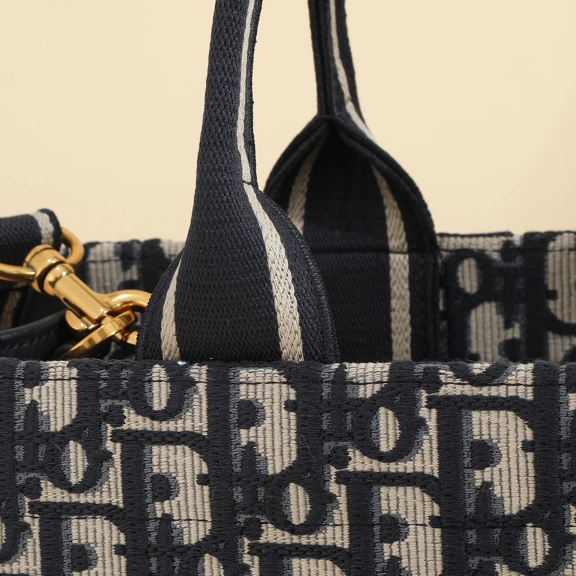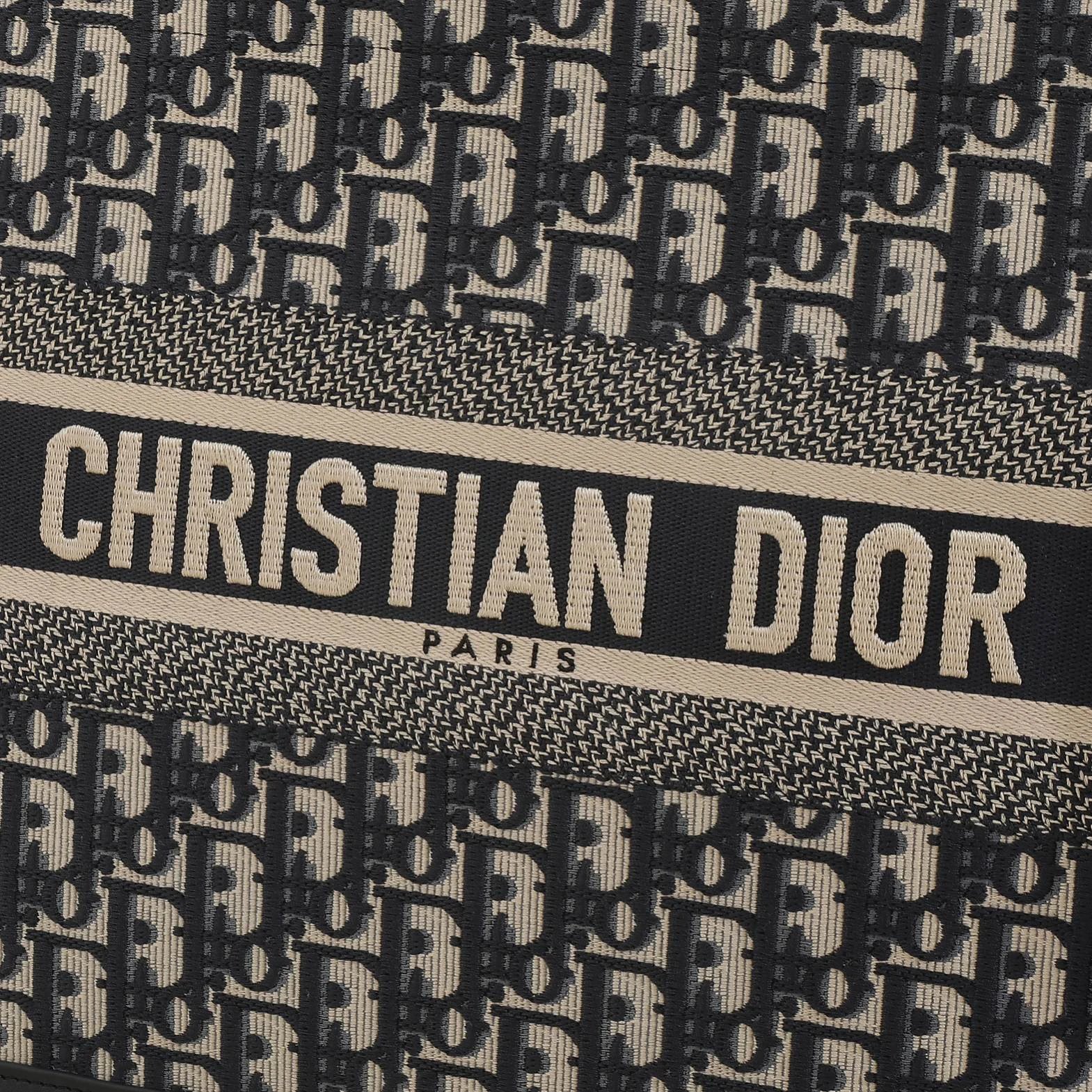 Dior 2024 Spring Book Tote Medium Tote Bag features blue Oblique embroidery, inspired by Maria Grazia Chiuri, with a front logo.