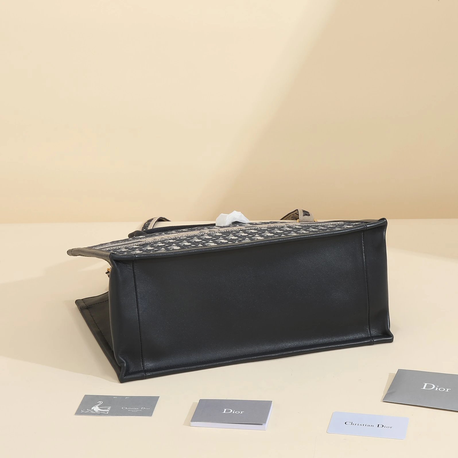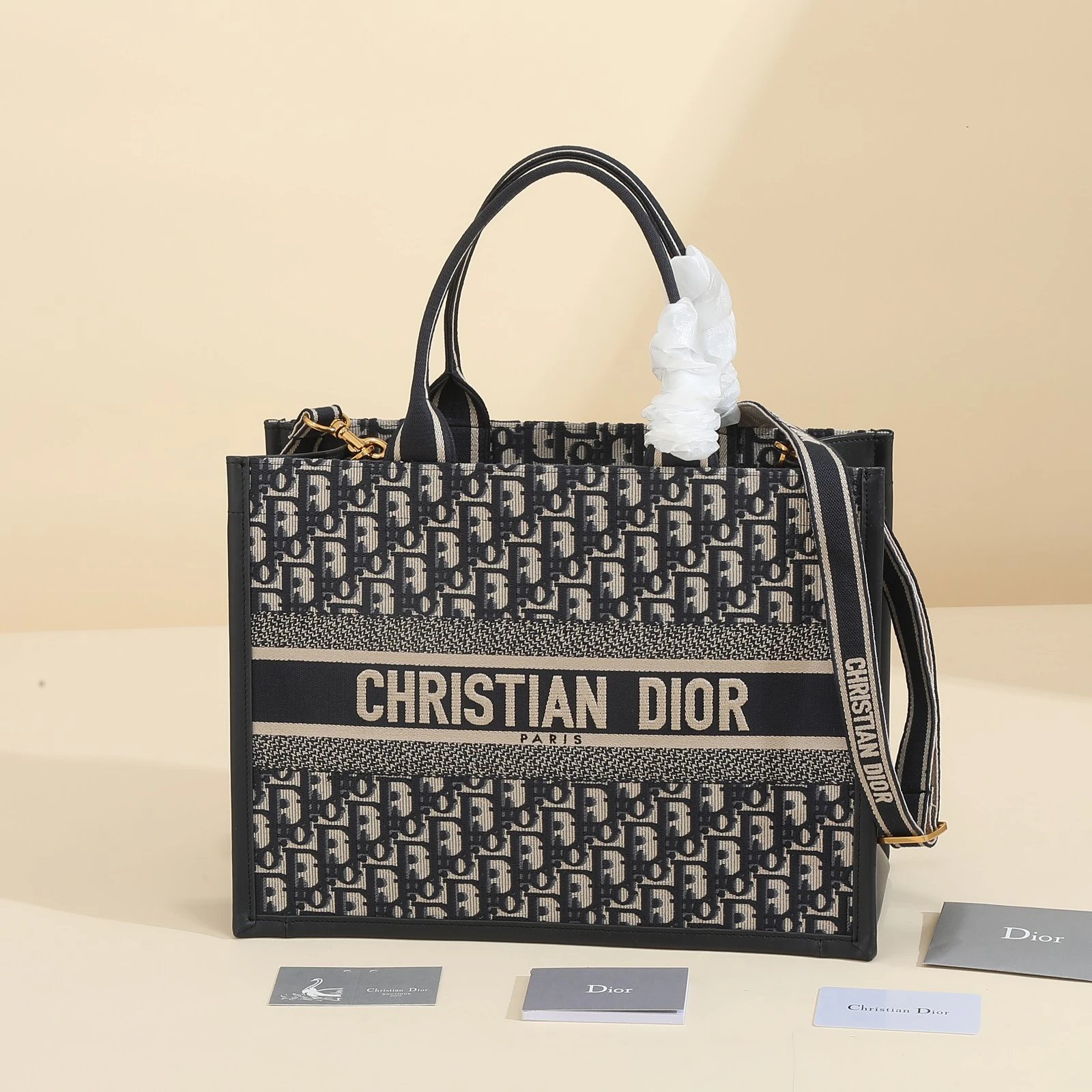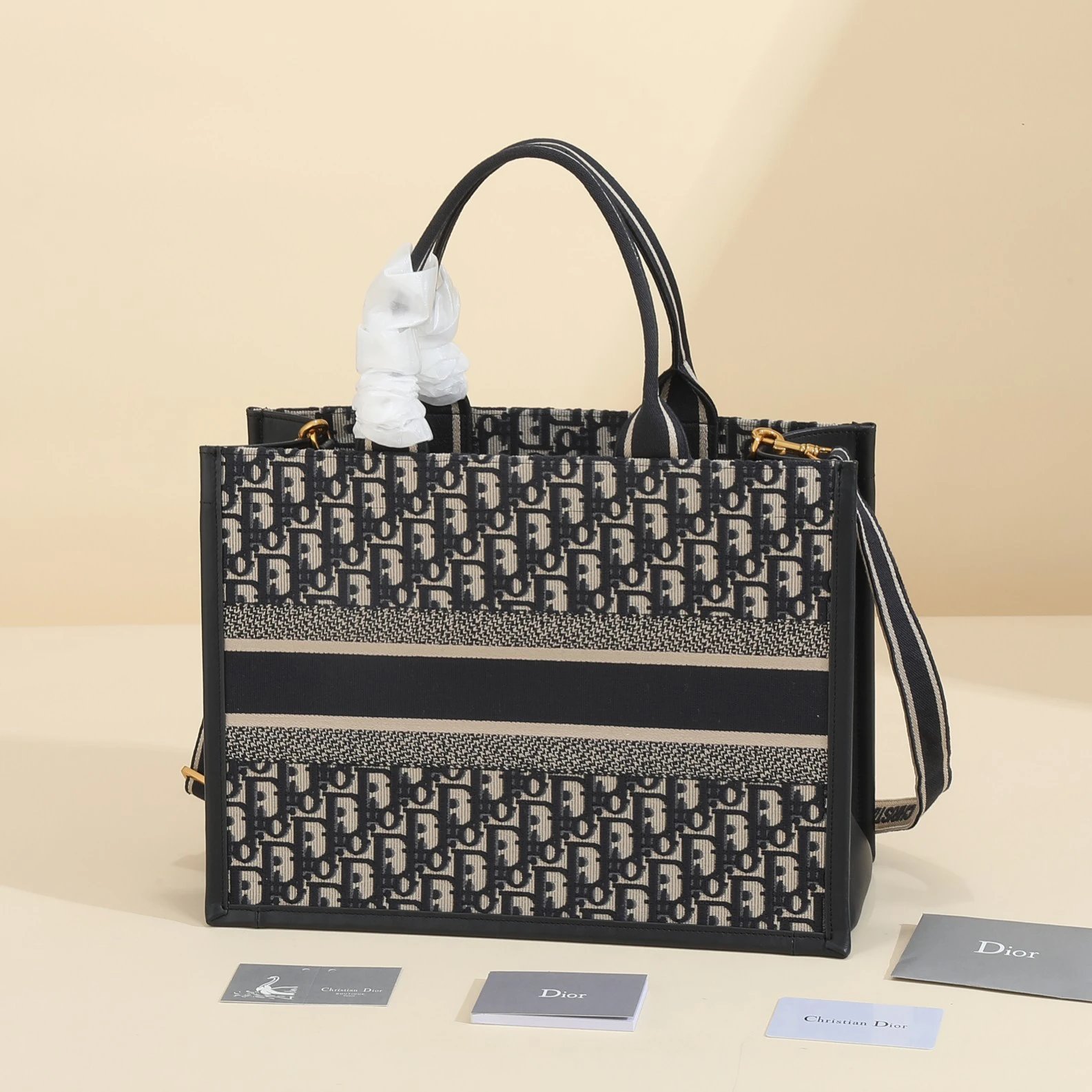 Dior 2024 Spring Book Tote Medium Tote Bag features blue Oblique embroidery, inspired by Maria Grazia Chiuri, with a front logo.