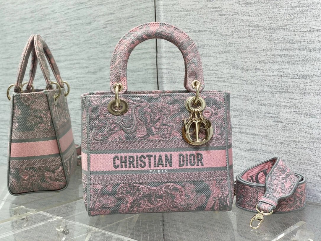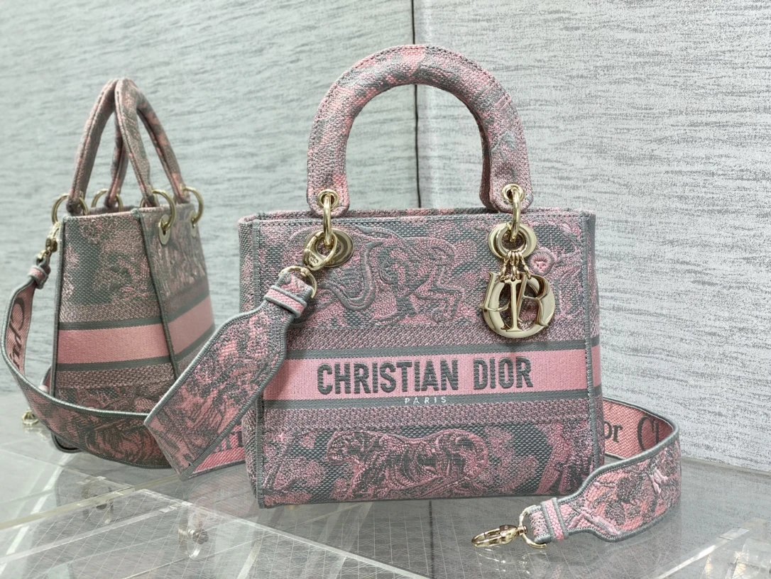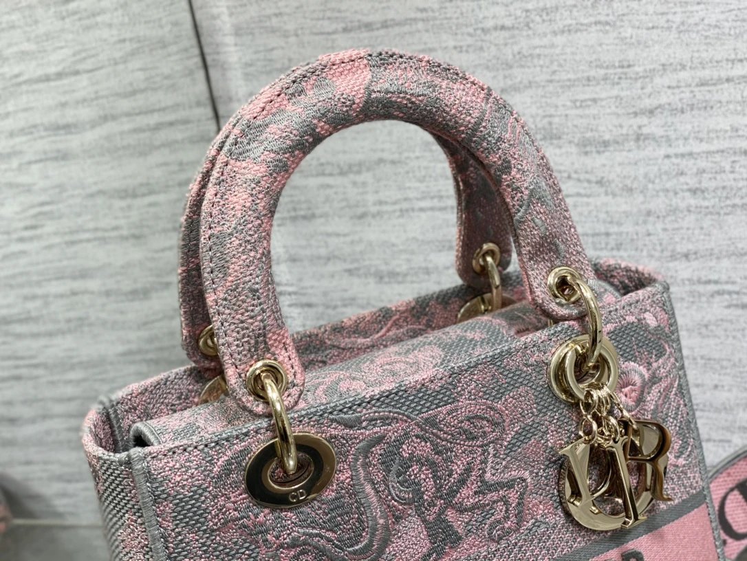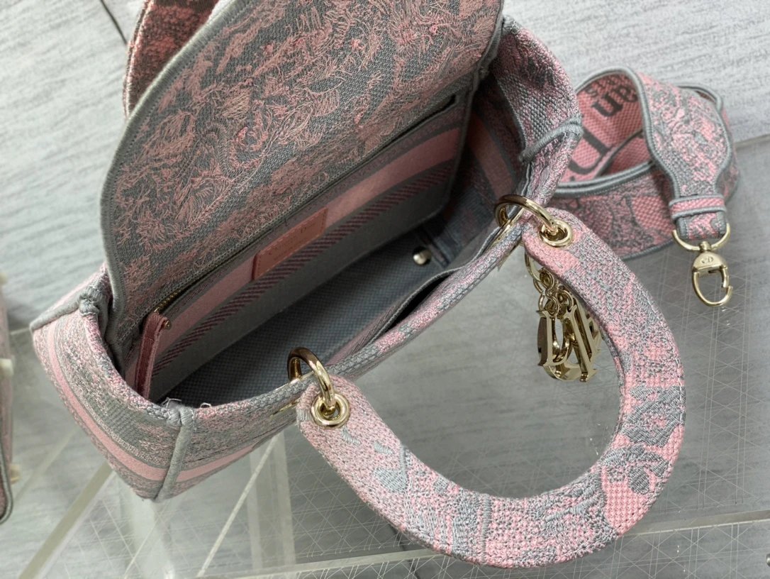 Dior Lady Sauvage series has pink & gray Toile de Jouy embroidered prints, classic craftsmanship & elegant design.