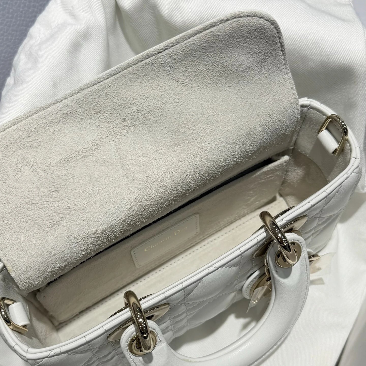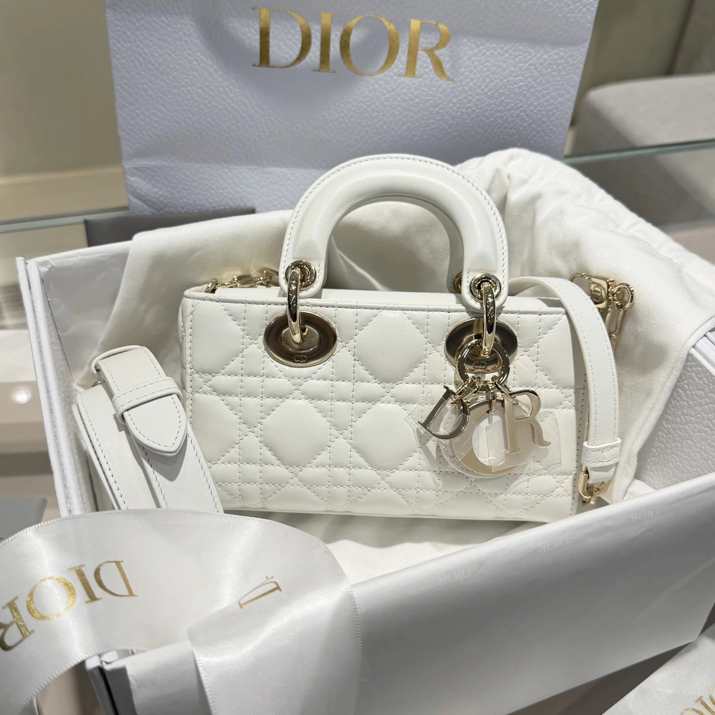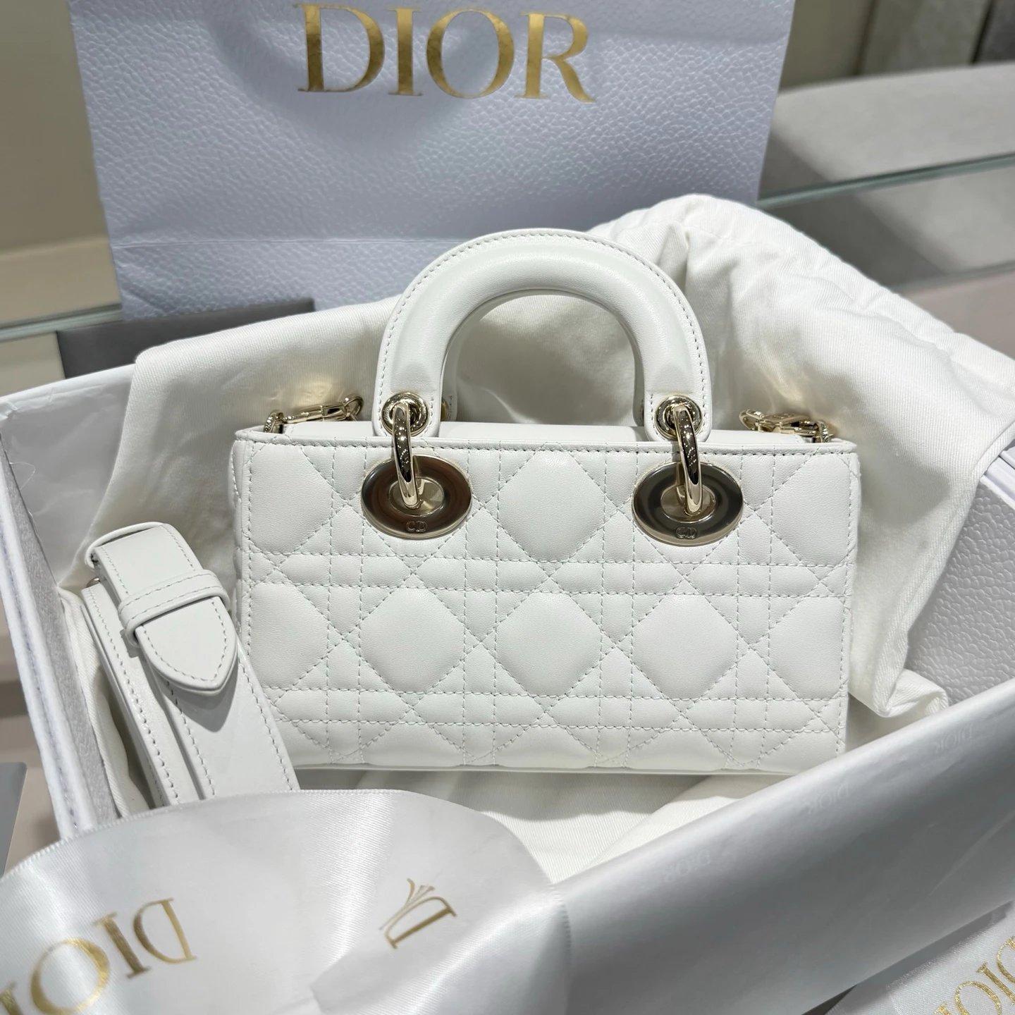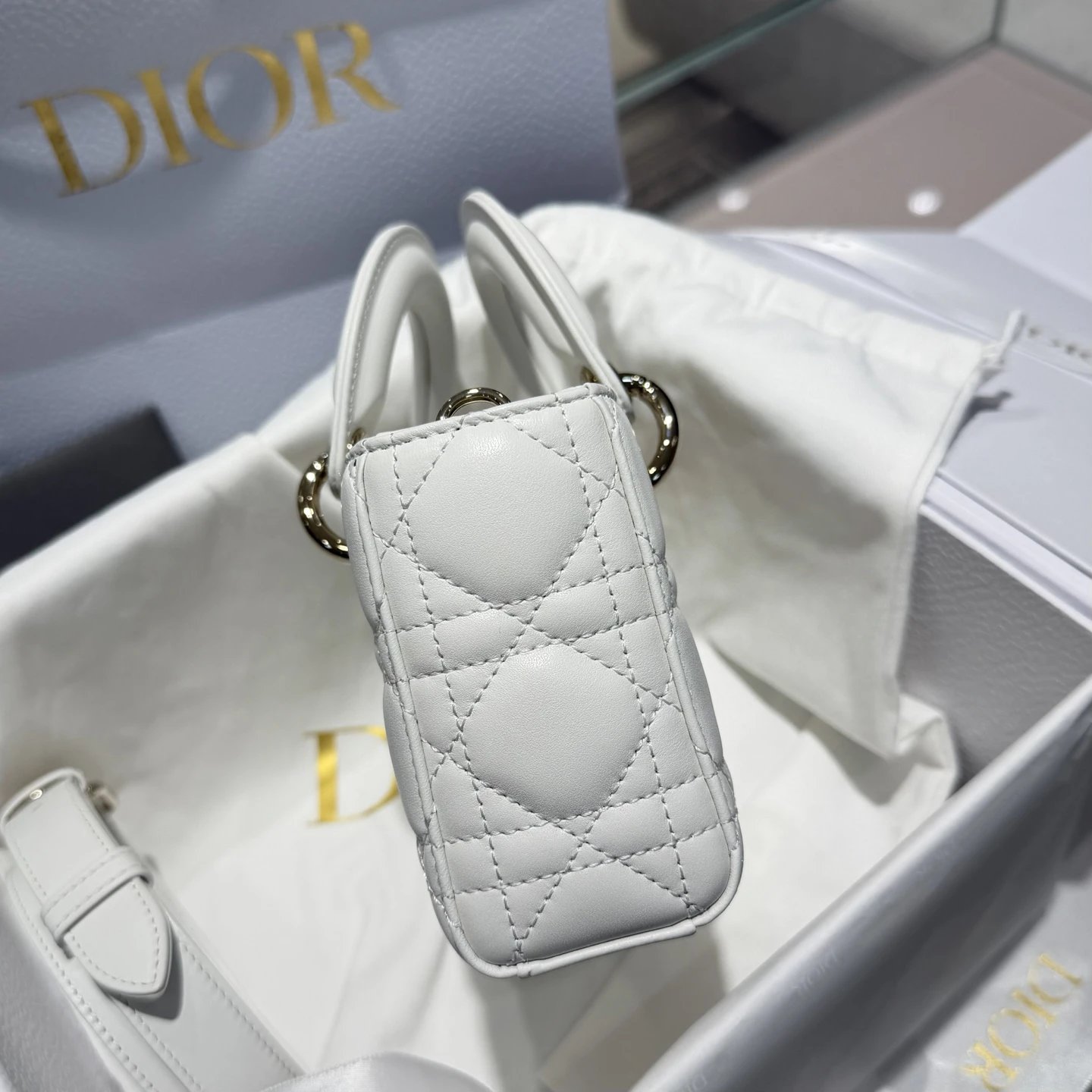 Dior New Mini White Bag: High-end crafted with original lambskin & pure copper hardware.