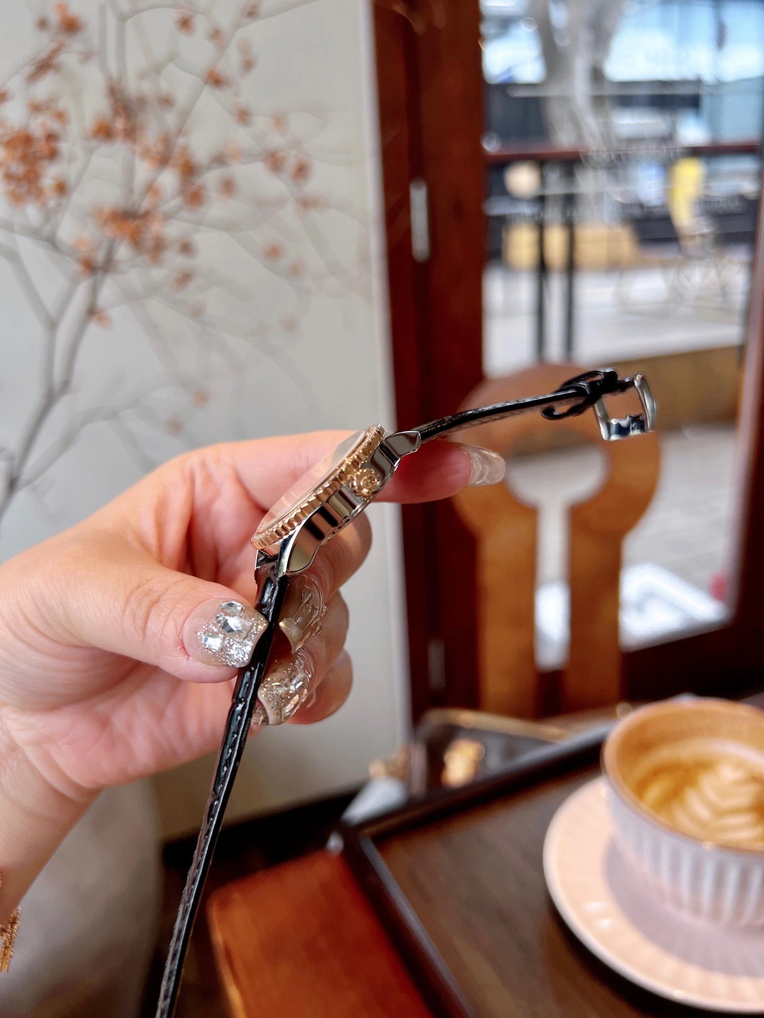 It has a calfskin strap, 33mm case, sapphire crystal, and Swiss movement.