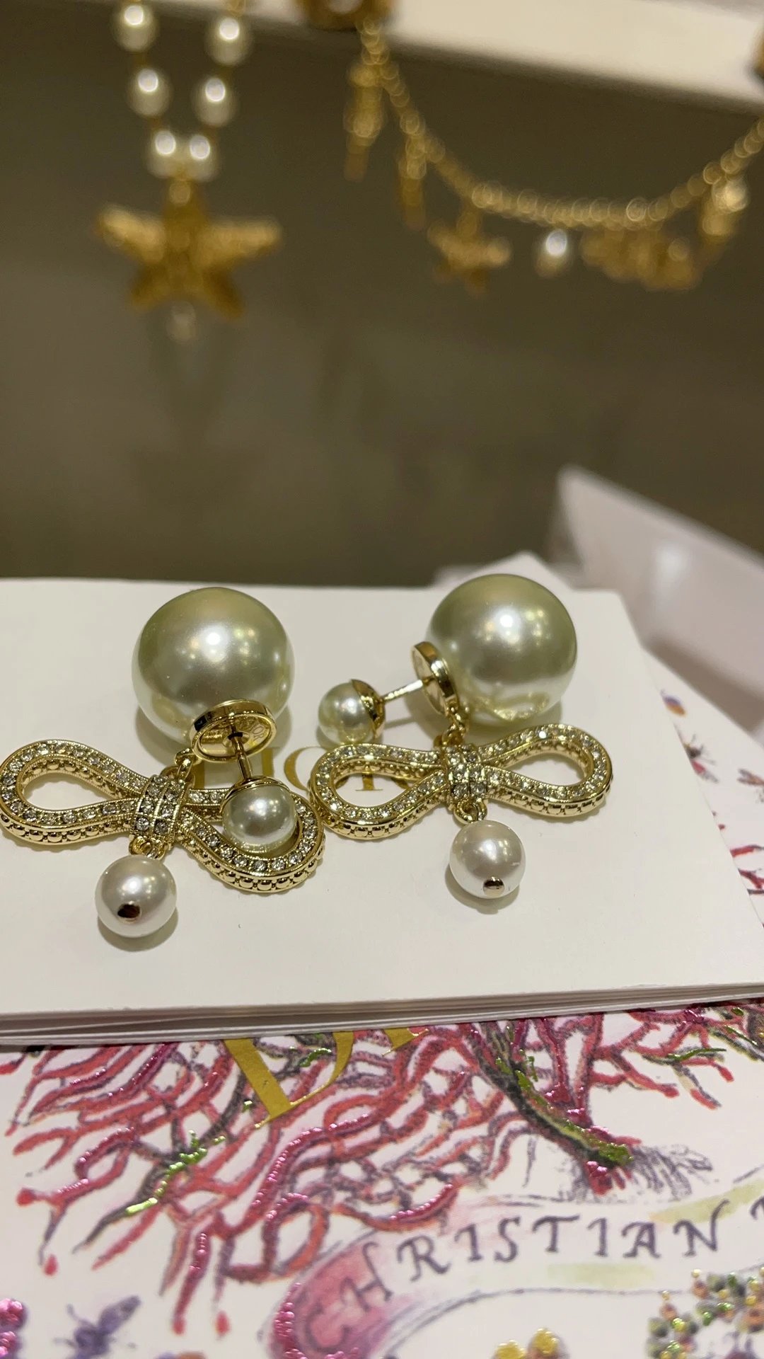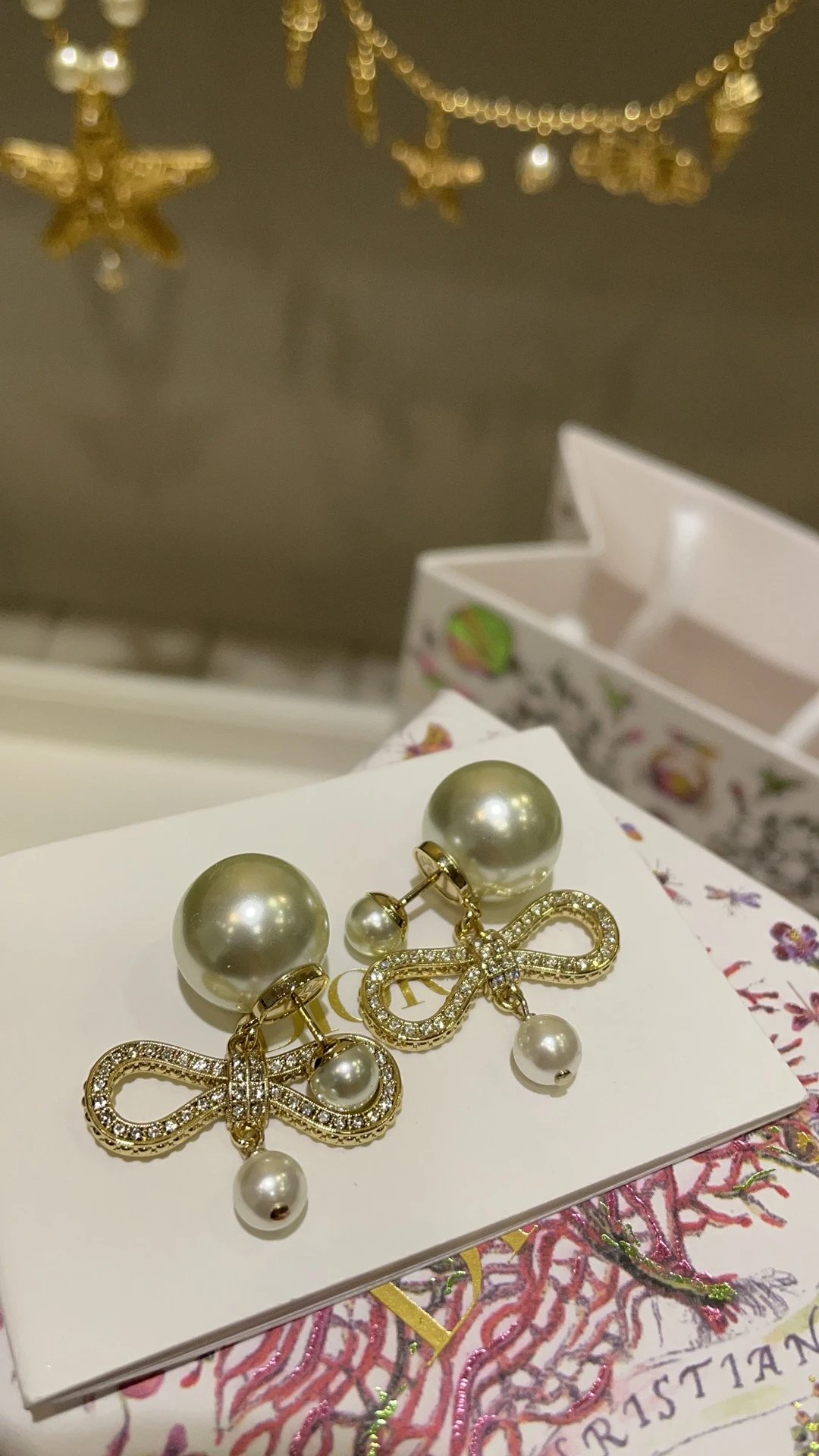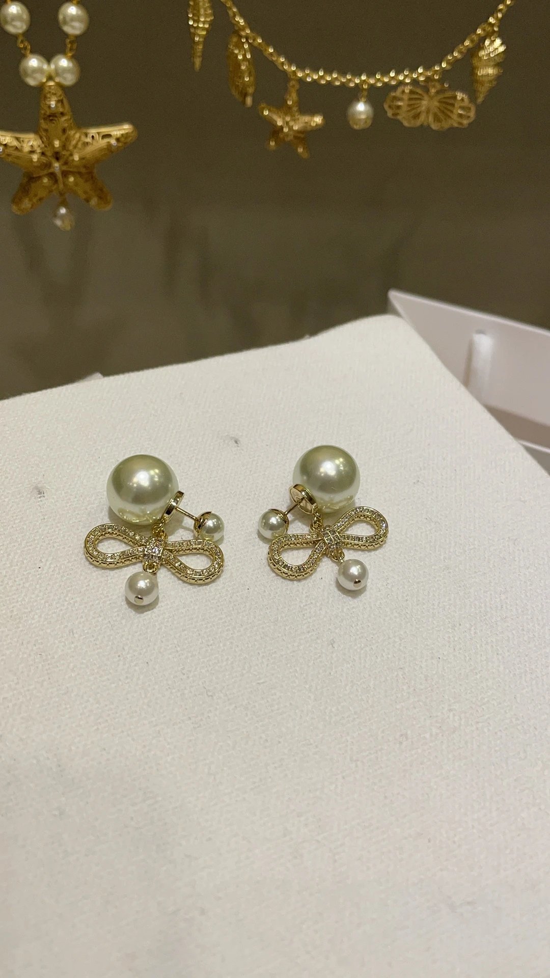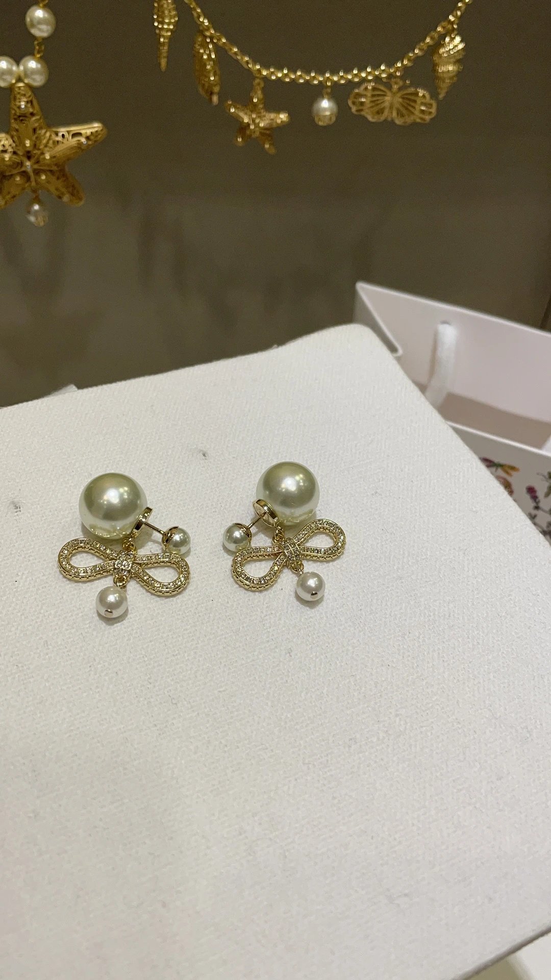 Dior 2025 new champagne hollow out rhinestone bow pearl double ball earrings.