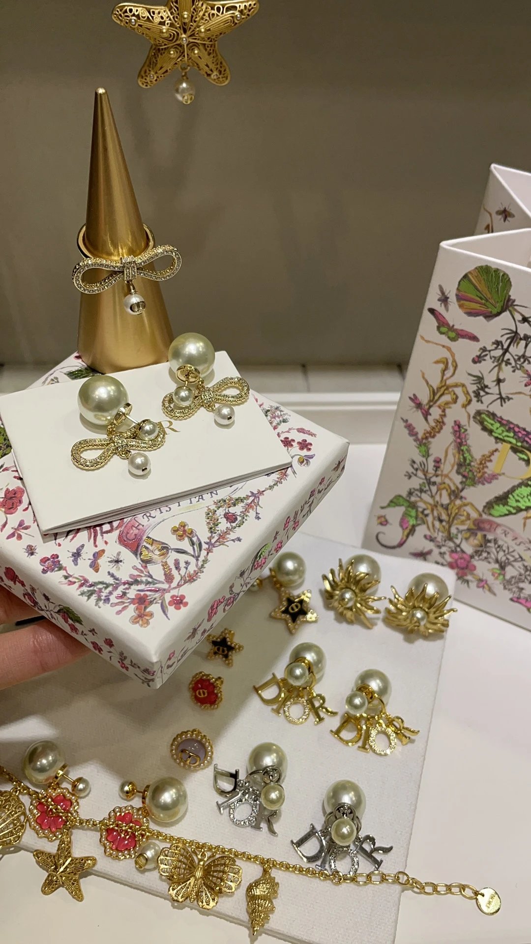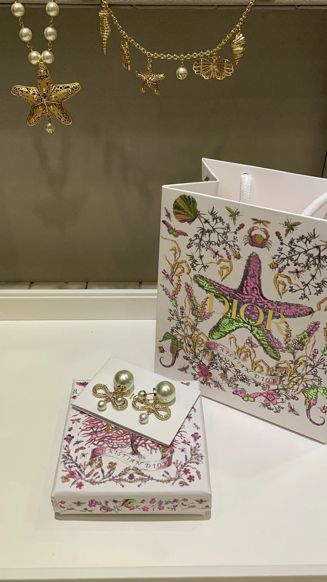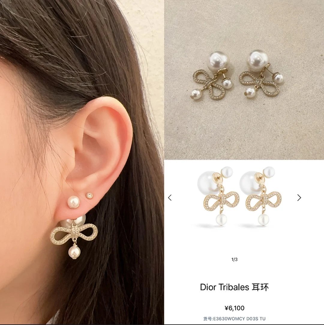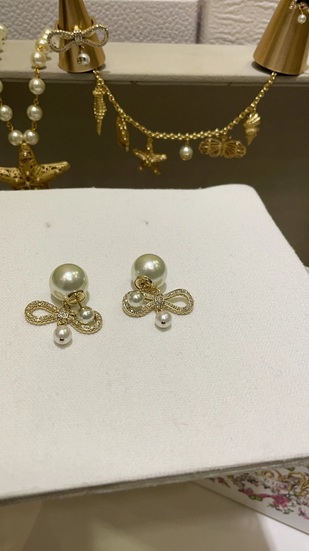 Dior 2025 new champagne hollow out rhinestone bow pearl double ball earrings.