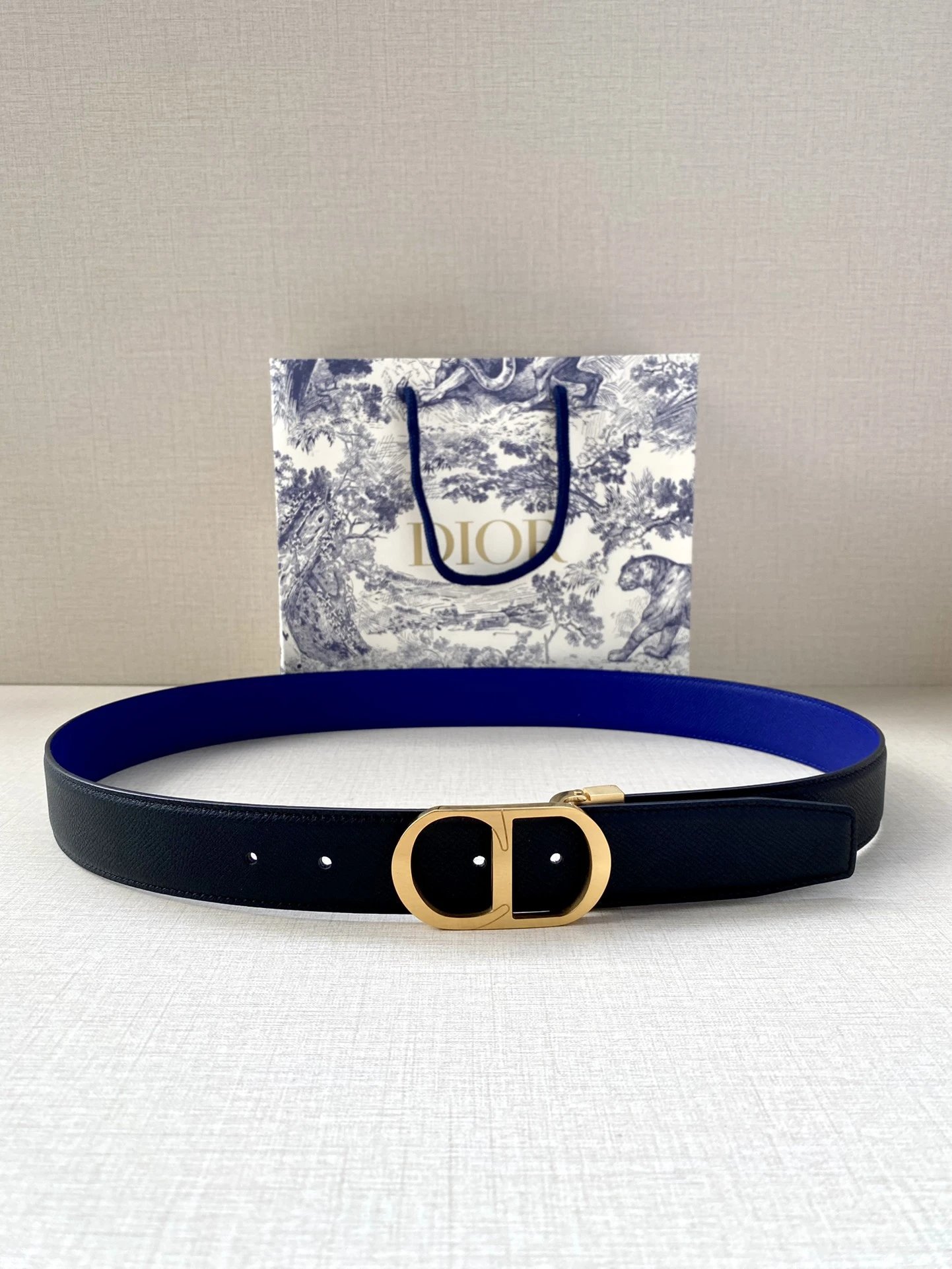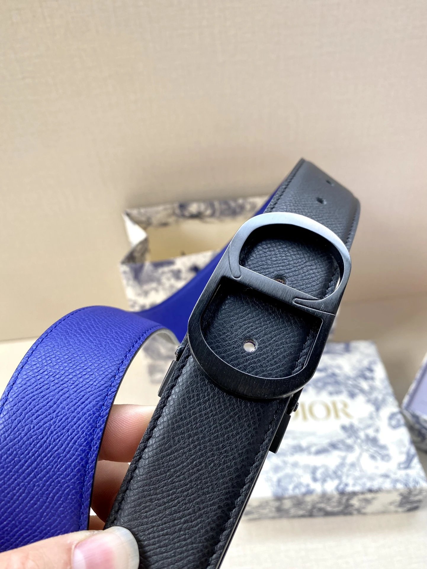 Dior 3.5cm belt features CD-logo metal buckle (brass coating) & double-sided black calfskin (smooth/grainy).