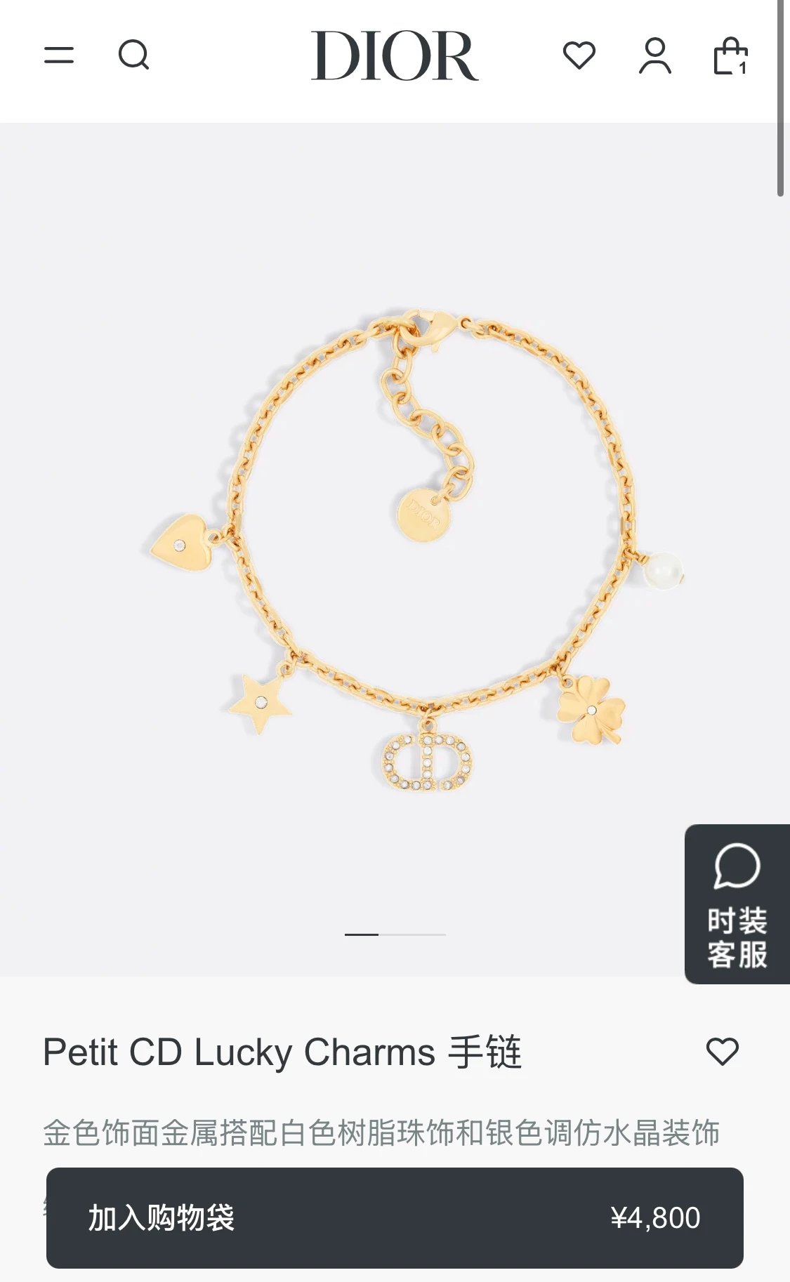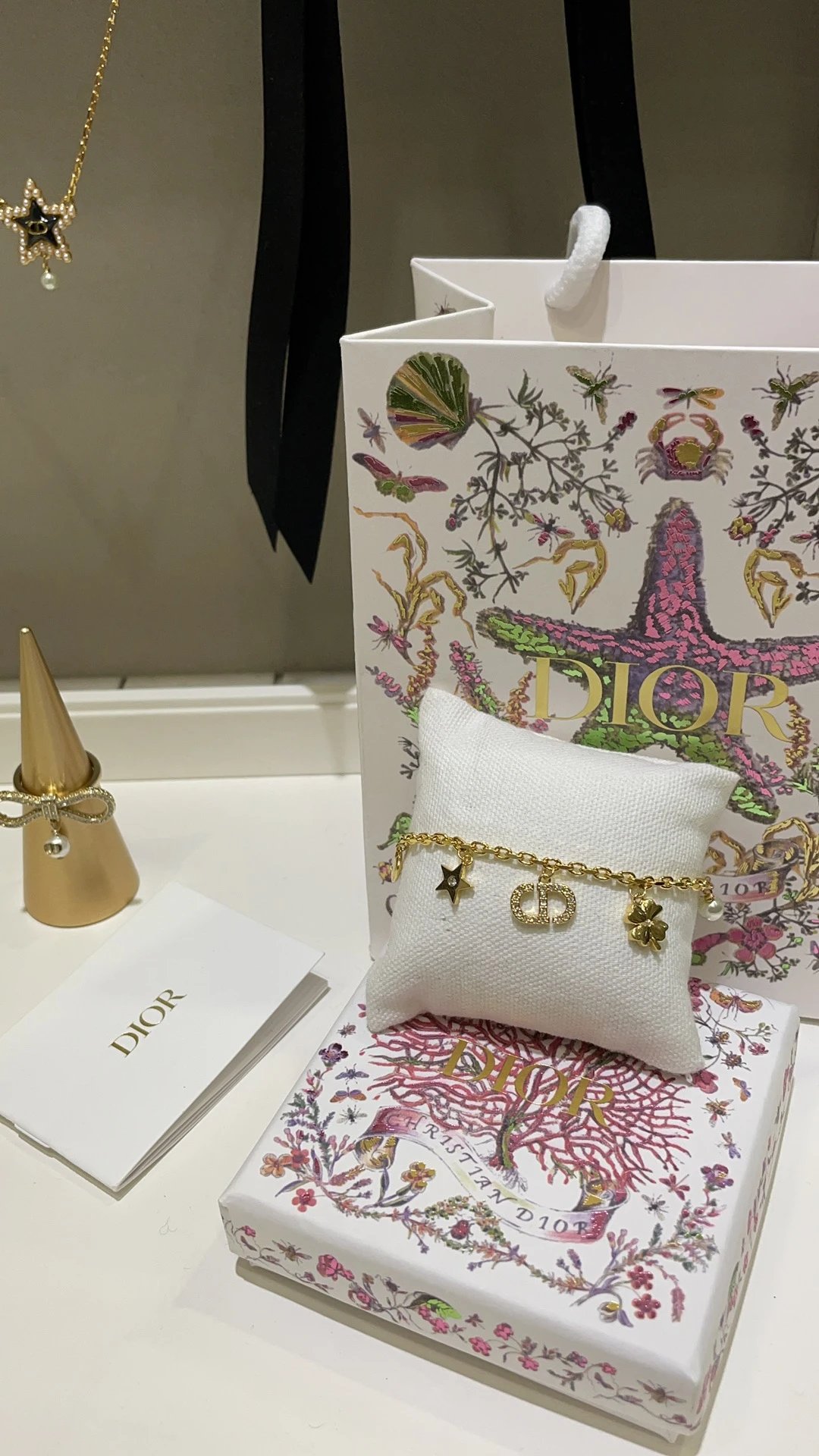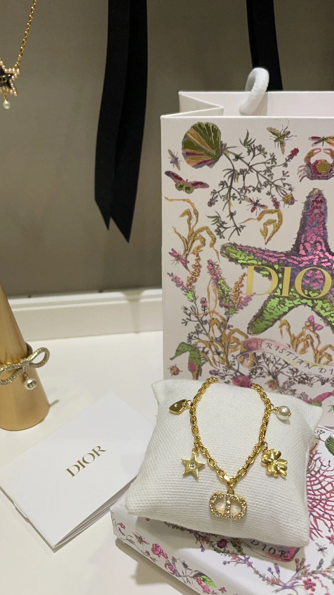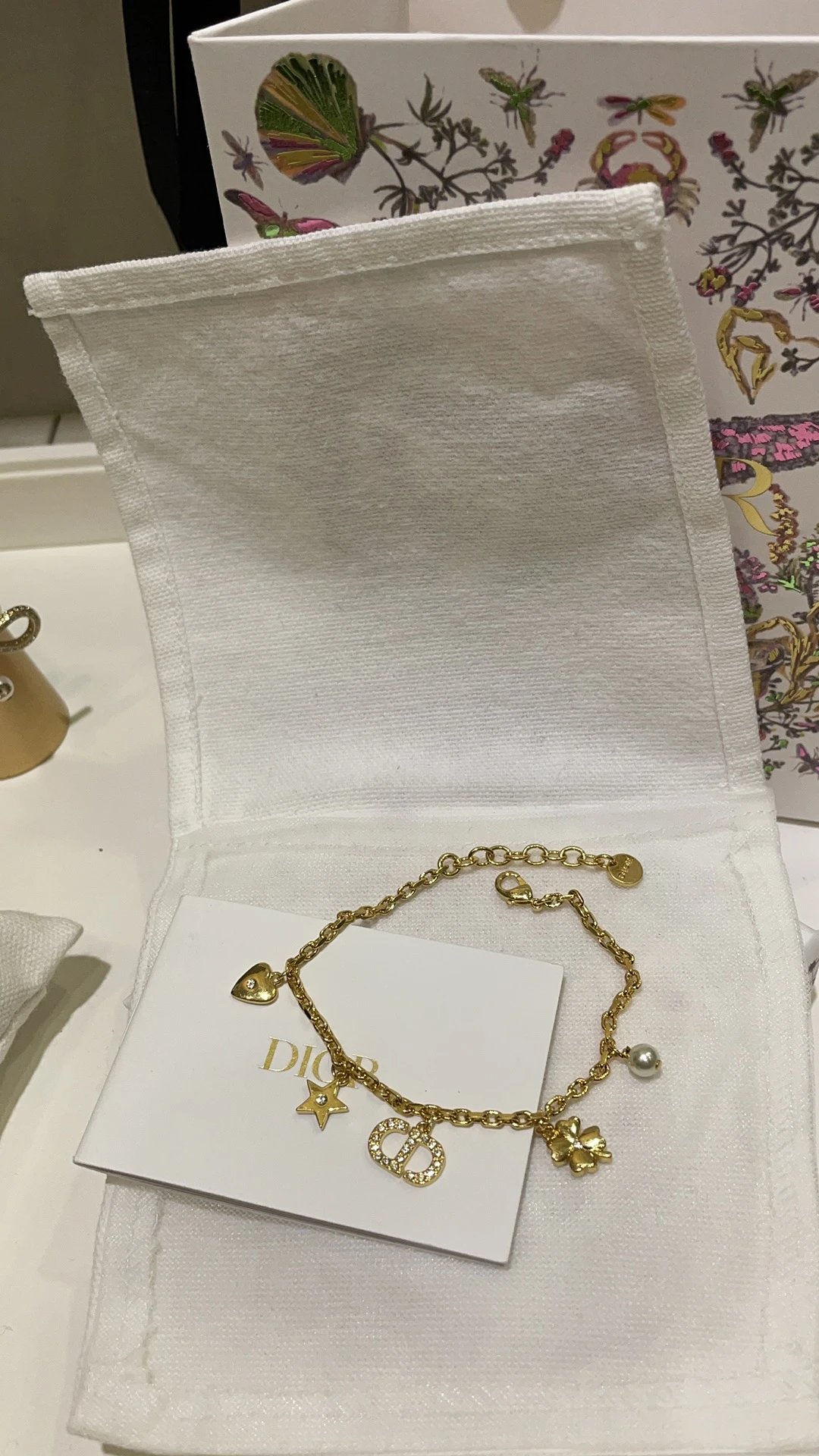 Dior 2025 Gold CD Star & Clover Bracelet features sparkling crystals, iconic CD letters, hearts, stars, clovers, and pearls.