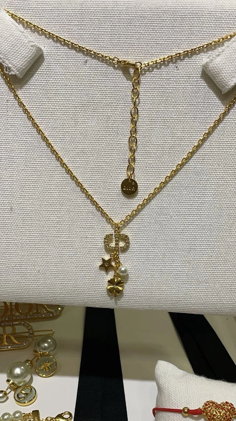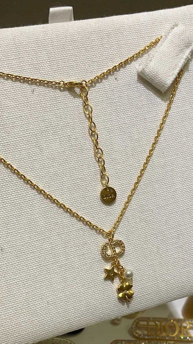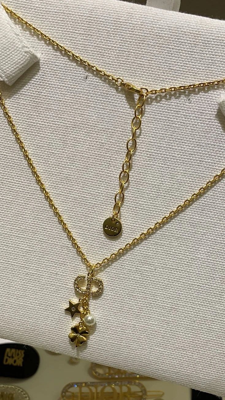 Dior 25th Gold CD Star Clover Necklace features full diamonds, CD letters, hearts, stars, clovers and pearls.